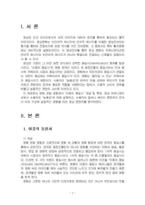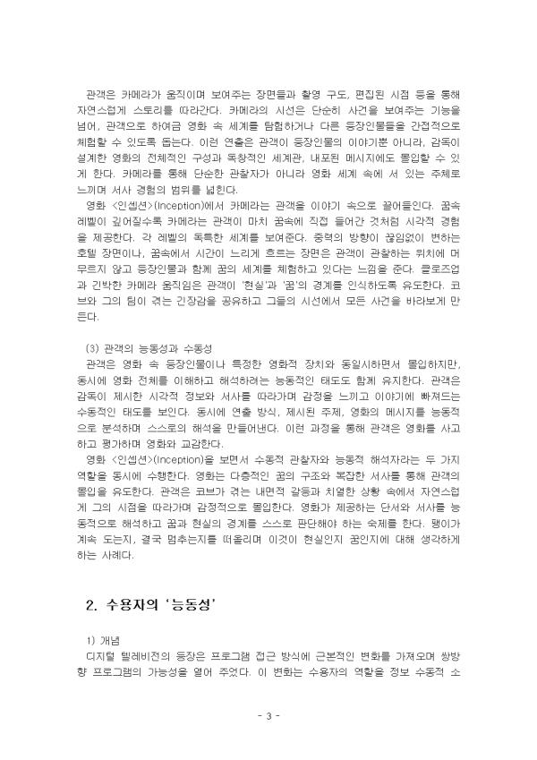 2. ¿µ»ó Ä¿¹Â´ÏÄÉÀ̼ǿ¡¼ ¼ö¿ëÀÚÀÇ ¿ªÇÒÀÌ ´õ ´Éµ¿ÀûÀ¸·Î º¯ÈÇϰí ÀÖ´Ù. ÀÌ·¯ÇÑ È¯°æ¿¡¼ ¼ö¿ëÀÚÀÇ ¡®´Éµ¿¼º¡¯¿¡ ´ëÇØ ¼³¸íÇϰí, ¼ö¿ëÀÚÀÇ Âü¿©³ª ÇØ¼®ÀÌ ÄÜÅÙÃ÷ÀÇ Àü°³³ª ÀÇ¹Ì ±¸¼º¿¡ ½ÇÁúÀûÀÎ ¿µÇâÀ» ¹ÌÄ£ ¿µ»ó ÄÜÅÙÃ÷ÀÇ »ç·Ê¸¦ µé¾î ºÐ¼®ÇϽÿÀ. - ¸ñ Â÷ - I. ¼ ·Ð II. º» ·Ð 1. ÀÌÁßÀÇ µ¿ÀϽà 2. ¼ö¿ëÀÚÀÇ ¡®´Éµ¿¼º¡¯ III. °á ·Ð Âü°í¹®Çå ** ÇÔ²² Á¦°øµÇ´Â Âü°íÀÚ·á ÇÑ±ÛÆÄÀÏ ** 1. ¼ö¿ëÀÚÀÇ ´Éµ¿¼º.hwp 2. ¼ö¿ëÀÚÀÇ ´Éµ¿¼º2.hwp 3. ¿µ»ó ÄÜÅÙÃ÷ÀÇ »ç·Ê.hwp 4. ¿µ»ó ÄÜÅÙÃ÷ÀÇ »ç·Ê2.hwp 5. ÀÌÁßÀÇ µ¿ÀϽà °³³ä ¹× Ư¡.hwp 6. ÀÌÁßÀÇ µ¿ÀϽà °³³ä ¹× Ư¡2.hwp 7. ¼·Ð ÀÛ¼º½Ã ÂüÁ¶.hwp 8. °á·Ð ÀÛ¼º½Ã ÂüÁ¶.hwp 9. ¼·Ð ÀÛ¼º½Ã ÂüÁ¶2.hwp 10. °á·Ð ÀÛ¼º½Ã ÂüÁ¶2.hwp ÀÚ·á³»¿ë ¹Ì¸®º¸±â