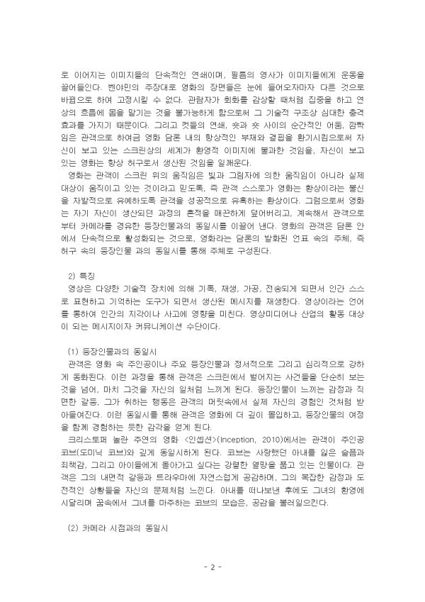 ¿µ»óÀº Àΰ£ ÀǽÄÀ¸·Î¼ÀÇ ³»Àû À̹ÌÁö¿¡ ´ëÇÏ¿© ·»Á ÅëÇÏ¿© Çü¼ºµÇ´Â ¹°Àû À̹ÌÁöÀÌ´Ù. ¿µ»ó¹®È´Â ºñ¾ð¾îÀû ¸Þ½ÃÁö¿Í ¾ð¾îÀû ¸Þ½ÃÁö¸¦ ÀÌ¿ëÇÑ ¿µ»ó¾ð¾î¶ó´Â Çü½ÄÀ» ÅëÇÏ¿© Àü´ÞµÇ¹Ç·Î ¿À·£ ¿ª»ç¸¦ °¡Áø ¾ð¾î¹®È, ±× Áß¿¡¼µµ ƯÈ÷ ȰÀÚ¹®È¿Í´Â ´ëºñÀûÀ¸·Î ¼³¸íµÇ¾îÁø´Ù. ÀÌ ¿µ»ó¾ð¾î¸¦ ÅëÇÑ ¿µ»ó ¹®ÈÀÇ Ä¿¹Â´ÏÄÉÀ̼ÇÀº ¾ð¾îÀû ¸Þ½ÃÁö¿Í ºñ¾ð¾îÀû ¸Þ½ÃÁö°¡ ÇϳªÀÇ ¹À½À¸·Î Àü´ÞµÇ´Â ½ÅÈ£µéÀÇ ÁýÇÕÀ̶ó°í ÇÒ ¼ö ÀÖ´Ù. ¿µ»óÀº ±âÁ¸ÀÇ ±× ¾î¶² Ç¥Çö ¾ç½Äº¸´Ù °·ÂÇÑ µ¿ÀϽÃ(identification) È¿°ú¸¦ ¹ß»ý½ÃŲ´Ù. ¡®ÀÌÁßÀÇ µ¿ÀϽ᯶õ ¿µÈ °ü°´ÀÌ ÀÌ¾ß±â ¼Ó µîÀåÀι°°ú µ¿ÀϽÃÇÏ´Â °Í°ú µ¿½Ã¿¡ Ä«¸Þ¶óÀÇ ½ÃÁ¡°ú µ¿ÀϽÃÇÏ´Â °úÁ¤ÀÌ´Ù. ¿µÈ¿¡¼ À̹ÌÁö¿ÍÀÇ µ¿ÀϽð¡ °üöµÇ´Â °úÁ¤ÀÇ Á߽ɿ¡´Â Ä«¸Þ¶ó¿ÍÀÇ µ¿ÀϽð¡ ÀÖ´Ù. ¿µÈ´Â ¡®¿òÁ÷ÀÏ ¼ö Àִ¡¯ Ä«¸Þ¶ó¿ÍÀÇ µ¿ÀϽÃÀ̱⠶§¹®ÀÌ´Ù. ¼ö¿ëÀÚÀÇ ¡®´Éµ¿¼º¡¯Àº °ü°´ÀÇ ¸¶À½ »óÅÂ¿Í ¹«ÀǽÄÀû ¹ÝÀÀ ÀÚü°¡ ÄÜÅÙÃ÷ÀÇ Àü°³¿¡ Áß¿äÇÑ ¿ªÇÒÀ» ¼öÇàÇÑ´Ù´Â Á¡¿¡¼, ¼öµ¿Àû ¼ÒºñÀÇ À庮À» Çã¹°°í ´Éµ¿ÀûÀÎ ÄÜÅÙÃ÷ ¼Òºñ·Î À̾îÁö°í ÀÖ´Ù. ÀÌ ·¹Æ÷Æ®´Â ¿µÈ °ü¶÷ °æÇè¿¡¼ ¡®ÀÌÁßÀÇ µ¿ÀϽᯠ°³³ä ¹× Ư¡, ¿µ»ó Ä¿¹Â´ÏÄÉÀ̼ǿ¡¼ ¼ö¿ëÀÚÀÇ ¡®´Éµ¿¼º¡¯¿¡ ´ëÇØ ¼³¸íÇϰí, ¼ö¿ëÀÚÀÇ Âü¿©³ª ÇØ¼®ÀÌ ÄÜÅÙÃ÷ÀÇ Àü°³³ª ÀÇ¹Ì ±¸¼º¿¡ ½ÇÁúÀûÀÎ ¿µÇâÀ» ¹ÌÄ£ ¿µ»ó ÄÜÅÙÃ÷¸¦ ºÐ¼®ÇÏ¿´´Ù. II. º» ·Ð 1. ÀÌÁßÀÇ µ¿ÀϽà 1) °³³ä ¿µÈ °ü¶÷ °æÇèÀº ±âº»ÀûÀ¸·Î ¿µÈ ¼Ó »óȲ°ú ¿µÈ ȯ°æ¿¡ ´ëÇÑ °ü°´ÀÇ µ¿ÀϽø¦ ÅëÇØ¼ ¾ò¾îÁø´Ù. °ü°´Àº µîÀåÀι°¸¸ÀÌ ¾Æ´Ï¶ó ¿µÈ¸¦ ±¸¼ºÇÏ´Â Ä«¸Þ¶ó ¾Þ±Û, ÃÔ¿µ¹æ½Ä, ÆíÁý µî ¿µÈÀû °üÁ¡¿¡ °¨Á¤ÀûÀ¸·Î ¿¬°áµÇ°í ¸ôÀÔÇÏ°Ô µÈ´Ù. 1Â÷Àû µ¿ÀϽô ī¸Þ¶ó ½ÃÁ¡°úÀÇ ¿øÃÊÀûÀÎ µ¿ÀϽÃÀÌ´Ù. 2Â÷Àû µ¿ÀϽô ±Ø Áß Àι°µé°úÀÇ µ¿ÀϽÃÀÌ´Ù. ÀÌ·¯ÇÑ µÎ °¡Áö Â÷¿øÀÇ µ¿ÀϽô µ¿½Ã¿¡ ÀϾ±â ¶§¹®¿¡ À̰ÍÀ» ¡®ÀÌÁßÀÇ µ¿ÀϽÃ(double identification)¡¯¶ó°í ºÎ¸¥´Ù. ¿µÈÀÇ ÀÌÁßÀÇ µ¿ÀϽà ¸ÞÄ¿´ÏÁòÀº °ü°´µé¿¡°Ô ¿µÈ ¼ÓÀÇ À̾߱⸦ ¸Å¿ì »ç½ÇÀûÀÎ °ÍÀ¸·Î ´À³¢°í °Å±â¿¡ ºüÁ®µé°Ô ¸¸µé±â ¶§¹®¿¡, °ü°´µéÀº ¿µÈ ¼Ó¿¡ ³ì¾Æµé¾î ÀÖ´Â °¡Ä¡°ü°ú ¹ÌÀû ÆÇ´Ü, Á¤Ä¡Àû ÆÇ´Ü µî¿¡ ¿µÇâÀ» ¹Þ°Ô µÈ´Ù. ¿µÈ´Â °íÁ¤µÈ ÇϳªÀÇ »çÁøÀû À̹ÌÁö·Î¸¸ Á¸ÀçÇÏ´Â °ÍÀÌ ¾Æ´Ï¶ó ¹«¾ùº¸´Ùµµ ÄÆµé·Î À̾îÁö´Â À̹ÌÁöµéÀÇ ´Ü¼ÓÀûÀÎ ¿¬¼âÀ̸ç, Çʸ§ÀÇ ¿µ»ç°¡ À̹ÌÁöµé¿¡°Ô ¿îµ¿À» ²ø¾îµéÀδÙ. º¥¾ß¹ÎÀÇ ÁÖÀå´ë·Î ¿µÈÀÇ Àå¸éµéÀº ´«¿¡ µé¾î¿ÀÀÚ¸¶ÀÚ ´Ù¸¥ °ÍÀ¸·Î ¹Ù²ñÀ¸·Î ÇÏ¿© °íÁ¤½Ãų ¼ö ¾ø´Ù. °ü¶÷ÀÚ°¡ ȸȸ¦ °¨»óÇÒ ¶§Ã³·³ ÁýÁßÀ» ÇÏ°í ¿¬»óÀÇ È帧¿¡ ¸öÀ» ¸Ã±â´Â °ÍÀ» ºÒ°¡´ÉÇÏ°Ô ÇÔÀ¸·Î½á ±× ±â¼úÀû ±¸Á¶»ó ½É´ëÇÑ Ãæ°Ý È¿°ú¸¦ °¡Áö±â ¶§¹®ÀÌ´Ù. ±×¸®°í ÄÆµéÀÇ ¿¬¼â, ¼ô°ú ¼ô »çÀÌÀÇ ¼ø°£ÀûÀÎ ¾îµÒ, ±ôºýÀÓÀº °ü°´À¸·Î ÇÏ¿©±Ý ¿µÈ ´ã·Ð ³»ÀÇ Ç×»óÀûÀÎ ºÎÀç¿Í °áÇÌÀ» ȯ±â½ÃÅ´À¸·Î½á ÀÚ½ÅÀÌ º¸°í ÀÖ´Â ½ºÅ©¸°»óÀÇ ¼¼°è°¡ ȯ¿µÀû À̹ÌÁö¿¡ ºÒ°úÇÑ °ÍÀÓÀ», ÀÚ½ÅÀÌ º¸°í ÀÖ´Â ¿µÈ´Â Ç×»ó Ç㱸·Î¼ »ý»êµÈ °ÍÀÓÀ» Àϱú¿î´Ù. ¿µÈ´Â °ü°´ÀÌ ½ºÅ©¸° À§ÀÇ ¿òÁ÷ÀÓÀº ºû°ú ±×¸²ÀÚ¿¡ ÀÇÇÑ ¿òÁ÷ÀÓÀÌ ¾Æ´Ï¶ó ½ÇÁ¦ ´ë»óÀÌ ¿òÁ÷À̰í ÀÖ´Â °ÍÀ̶ó°í ¹Ïµµ·Ï, Áï °ü°´ ½º½º·Î°¡ ¿µÈ´Â ȯ»óÀ̶ó´Â ºÒ½ÅÀ» ÀÚ¹ßÀûÀ¸·Î À¯¿¹Çϵµ·Ï °ü°´À» ¼º°øÀûÀ¸·Î À¯È¤Çϴ ȯ»óÀÌ´Ù. ±×·³À¸·Î½á ¿µÈ´Â ÀÚ±â ÀÚ½ÅÀÌ »ý»êµÇ´ø °úÁ¤ÀÇ ÈçÀûÀ» ¸Å²öÇÏ°Ô µ¤¾î¹ö¸®°í, °è¼ÓÇØ¼ °ü°´À¸·ÎºÎÅÍ Ä«¸Þ¶ó¸¦ °æÀ¯ÇÑ µîÀåÀι°°úÀÇ µ¿ÀϽø¦ À̲ø¾î ³½´Ù. ¿µÈÀÇ °ü°´Àº ´ã·Ð ¾È¿¡¼ ´Ü¼ÓÀûÀ¸·Î Ȱ¼ºÈµÇ´Â °ÍÀ¸·Î, ¿µÈ¶ó´Â ´ã·ÐÀÇ ¹ßÈµÈ ¾ðÇ¥ ¼ÓÀÇ ÁÖü, Áï Ç㱸 ¼ÓÀÇ µîÀåÀι° °úÀÇ µ¿ÀϽø¦ ÅëÇØ ÁÖü·Î ±¸¼ºµÈ´Ù. 2) Ư¡ ¿µ»óÀº ´Ù¾çÇÑ ±â¼úÀû ÀåÄ¡¿¡ ÀÇÇØ ±â·Ï, Àç»ý, °¡°ø, Àü¼ÛµÇ°Ô µÇ¸é¼ Àΰ£ ½º½º·Î Ç¥ÇöÇÏ°í ±â¾ïÇÏ´Â µµ±¸°¡ µÇ¸é¼ »ý»êµÈ ¸Þ½ÃÁö¸¦ Àç»ýÇÑ´Ù. ¿µ»óÀ̶ó´Â ¾ð¾î¸¦ ÅëÇÏ¿© Àΰ£ÀÇ Áö°¢À̳ª »ç°í¿¡ ¿µÇâÀ» ¹ÌÄ£´Ù. ¿µ»ó¹Ìµð¾î³ª »ê¾÷ÀÇ È°µ¿ ´ë»óÀÌ µÇ´Â ¸Þ½ÃÁöÀÌÀÚ Ä¿¹Â´ÏÄÉÀÌ¼Ç ¼ö´ÜÀÌ´Ù. (1) µîÀåÀι°°úÀÇ µ¿ÀϽà °ü°´Àº ¿µÈ ¼Ó ÁÖÀΰøÀ̳ª ÁÖ¿ä µîÀåÀι°°ú Á¤¼ÀûÀ¸·Î ±×¸®°í ½É¸®ÀûÀ¸·Î °ÇÏ°Ô µ¿ÈµÈ´Ù. ÀÌ·± °úÁ¤À» ÅëÇØ °ü°´Àº ½ºÅ©¸°¿¡¼ ¹ú¾îÁö´Â »ç°ÇµéÀ» ´Ü¼øÈ÷ º¸´Â °ÍÀ» ³Ñ¾î, ¸