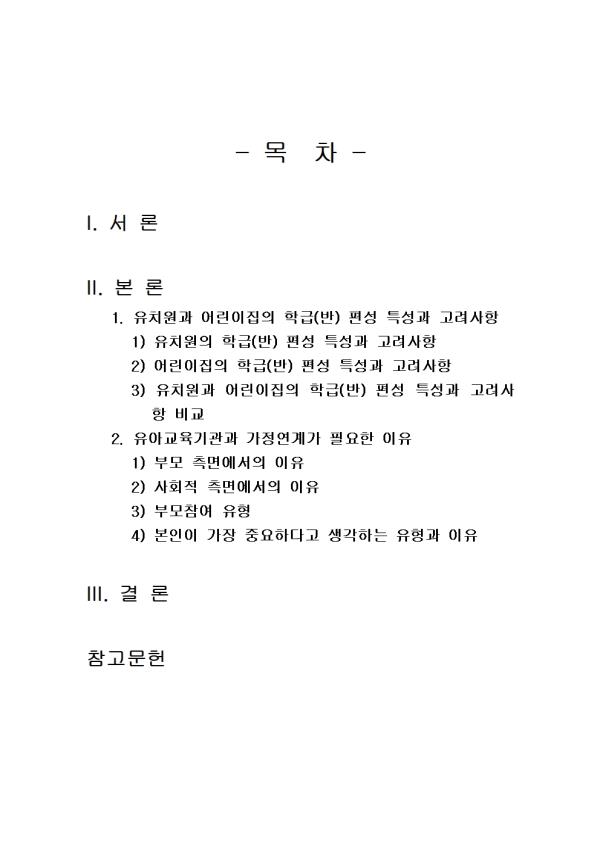 2. À¯¾Æ±³À°±â°ü°ú °¡Á¤¿¬°è°¡ ÇÊ¿äÇÑ ÀÌÀ¯¿¡ ´ëÇØ À¯¾Æ, ºÎ¸ð, »çȸÀû Ãø¸é¿¡¼ ±â¼úÇϰí, ´Ù¾çÇÑ ºÎ¸ðÂü¿© À¯Çü Áß º»ÀÎÀÌ °¡Àå Áß¿äÇÏ´Ù°í »ý°¢ÇÏ´Â 2°¡Áö¸¦ ¼±ÅÃÇÏ°í ±× ÀÌÀ¯¸¦ Á¦½ÃÇϽÿÀ. - ¸ñ Â÷ - I. ¼ ·Ð II. º» ·Ð 1. À¯Ä¡¿ø°ú ¾î¸°ÀÌÁýÀÇ ÇбÞ(¹Ý) Æí¼º Ư¼º°ú °í·Á»çÇ× 1) À¯Ä¡¿øÀÇ ÇбÞ(¹Ý) Æí¼º Ư¼º°ú °í·Á»çÇ× 2) ¾î¸°ÀÌÁýÀÇ ÇбÞ(¹Ý) Æí¼º Ư¼º°ú °í·Á»çÇ× 3) À¯Ä¡¿ø°ú ¾î¸°ÀÌÁýÀÇ ÇбÞ(¹Ý) Æí¼º Ư¼º°ú °í·Á»çÇ× ºñ±³ 2. À¯¾Æ±³À°±â°ü°ú °¡Á¤¿¬°è°¡ ÇÊ¿äÇÑ ÀÌÀ¯ 1) ºÎ¸ð Ãø¸é¿¡¼ÀÇ ÀÌÀ¯ 2) »çȸÀû Ãø¸é¿¡¼ÀÇ ÀÌÀ¯ 3) ºÎ¸ðÂü¿© À¯Çü 4) º»ÀÎÀÌ °¡Àå Áß¿äÇÏ´Ù°í »ý°¢ÇÏ´Â À¯Çü°ú ÀÌÀ¯ III. °á ·Ð Âü°í¹®Çå ** ÇÔ²² Á¦°øµÇ´Â Âü°íÀÚ·á ÇÑ±ÛÆÄÀÏ ** 1. º»ÀÎÀÌ °¡Àå Áß¿äÇÏ´Ù°í »ý°¢ÇÏ´Â À¯Çü°ú ÀÌÀ¯.hwp 2. º»ÀÎÀÌ °¡Àå Áß¿äÇÏ´Ù°í »ý°¢ÇÏ´Â À¯Çü°ú ÀÌÀ¯2.hwp 3. ¾î¸°ÀÌÁýÀÇ ÇбÞ(¹Ý) Æí¼º Ư¼º°ú °í·Á»çÇ×.hwp 4. ¾î¸°ÀÌÁýÀÇ ÇбÞ(¹Ý) Æí¼º Ư¼º°ú °í·Á»çÇ×2.hwp 5. À¯¾Æ±³À°±â°ü°ú °¡Á¤¿¬°è°¡ ÇÊ¿äÇÑ ÀÌÀ¯.hwp 6. À¯¾Æ±³À°±â°ü°ú °¡Á¤¿¬°è°¡ ÇÊ¿äÇÑ ÀÌÀ¯2.hwp 7. À¯Ä¡¿ø°ú ¾î¸°ÀÌÁýÀÇ ÇбÞ(¹Ý) Æí¼º Ư¼º°ú °í·Á»çÇ× ºñ±³.hwp 8. À¯Ä¡¿ø°ú ¾î¸°ÀÌÁýÀÇ ÇбÞ(¹Ý) Æí¼º Ư¼º°ú °í·Á»çÇ× ºñ±³2.hwp 9. À¯Ä¡¿øÀÇ ÇбÞ(¹Ý) Æí¼º Ư¼º°ú °í·Á»çÇ×.hwp 10. À¯Ä¡¿øÀÇ ÇбÞ(¹Ý) Æí¼º Ư¼º°ú °í·Á»çÇ×2.hwp 11. ¼·Ð ÀÛ¼º½Ã ÂüÁ¶.hwp 12. °á·Ð ÀÛ¼º½Ã ÂüÁ¶.hwp 13. ¼·Ð ÀÛ¼º½Ã ÂüÁ¶2.hwp 14. °á·Ð ÀÛ¼º½Ã ÂüÁ¶2.hwp ÀÚ·á³»¿ë ¹Ì¸®º¸±â