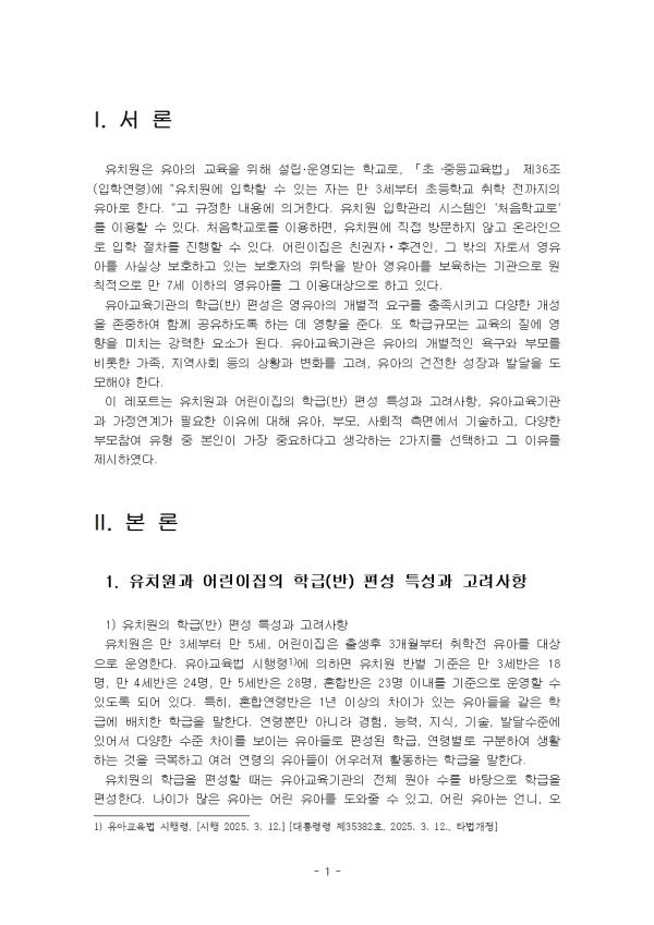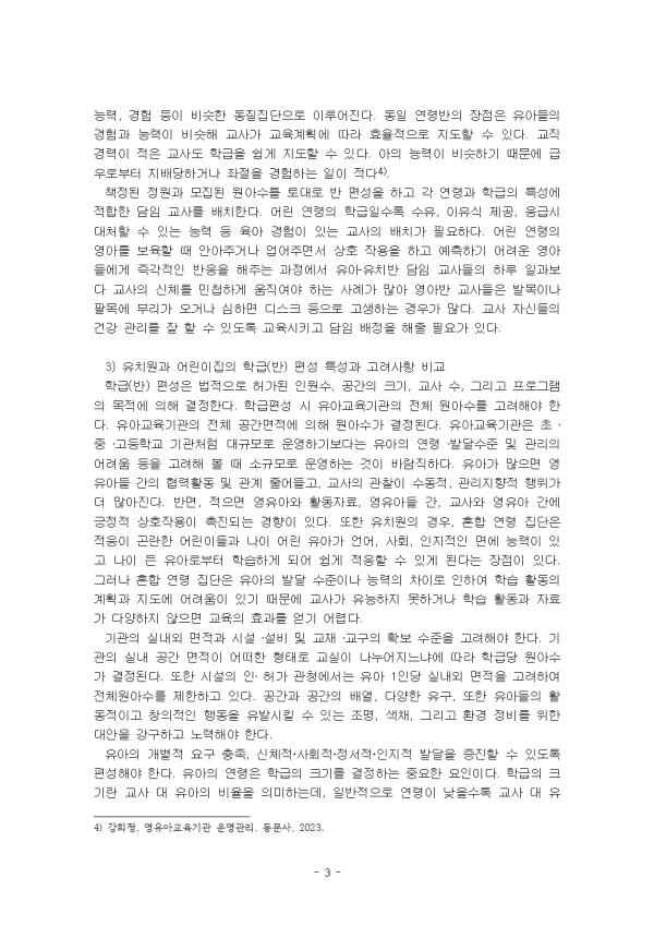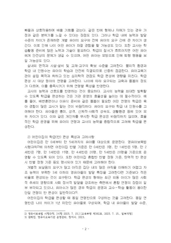 À¯Ä¡¿øÀº À¯¾ÆÀÇ ±³À°À» À§ÇØ ¼³¸³¡¤¿î¿µµÇ´Â Çб³·Î, ¡¸ÃÊ ․ÁߵÀ°¹ý¡¹ Á¦36Á¶ (ÀÔÇп¬·É)¿¡ "À¯Ä¡¿ø¿¡ ÀÔÇÐÇÒ ¼ö ÀÖ´Â ÀÚ´Â ¸¸ 3¼¼ºÎÅÍ ÃʵîÇб³ ÃëÇÐ Àü±îÁöÀÇ À¯¾Æ·Î ÇÑ´Ù. "°í ±ÔÁ¤ÇÑ ³»¿ë¿¡ ÀǰÅÇÑ´Ù. À¯Ä¡¿ø ÀÔÇаü¸® ½Ã½ºÅÛÀÎ 'óÀ½Çб³·Î'¸¦ ÀÌ¿ëÇÒ ¼ö ÀÖ´Ù. óÀ½Çб³·Î¸¦ ÀÌ¿ëÇϸé, À¯Ä¡¿ø¿¡ Á÷Á¢ ¹æ¹®ÇÏÁö ¾Ê°í ¿Â¶óÀÎÀ¸·Î ÀÔÇÐ ÀýÂ÷¸¦ ÁøÇàÇÒ ¼ö ÀÖ´Ù. ¾î¸°ÀÌÁýÀº Ä£±ÇÀÚ¤ýÈİßÀÎ, ±× ¹ÛÀÇ Àڷμ ¿µÀ¯¾Æ¸¦ »ç½Ç»ó º¸È£Çϰí ÀÖ´Â º¸È£ÀÚÀÇ À§Å¹À» ¹Þ¾Æ ¿µÀ¯¾Æ¸¦ º¸À°ÇÏ´Â ±â°üÀ¸·Î ¿øÄ¢ÀûÀ¸·Î ¸¸ 7¼¼ ÀÌÇÏÀÇ ¿µÀ¯¾Æ¸¦ ±× ÀÌ¿ë´ë»óÀ¸·Î Çϰí ÀÖ´Ù. À¯¾Æ±³À°±â°üÀÇ ÇбÞ(¹Ý) Æí¼ºÀº ¿µÀ¯¾ÆÀÇ °³º°Àû ¿ä±¸¸¦ ÃæÁ·½ÃŰ°í ´Ù¾çÇÑ °³¼ºÀ» Á¸ÁßÇÏ¿© ÇÔ²² °øÀ¯Çϵµ·Ï ÇÏ´Â µ¥ ¿µÇâÀ» ÁØ´Ù. ¶Ç ÇбޱԸð´Â ±³À°ÀÇ Áú¿¡ ¿µÇâÀ» ¹ÌÄ¡´Â °·ÂÇÑ ¿ä¼Ò°¡ µÈ´Ù. À¯¾Æ±³À°±â°üÀº À¯¾ÆÀÇ °³º°ÀûÀÎ ¿å±¸¿Í ºÎ¸ð¸¦ ºñ·ÔÇÑ °¡Á·, Áö¿ª»çȸ µîÀÇ »óȲ°ú º¯È¸¦ °í·Á, À¯¾ÆÀÇ °ÇÀüÇÑ ¼ºÀå°ú ¹ß´ÞÀ» µµ¸ðÇØ¾ß ÇÑ´Ù. ÀÌ ·¹Æ÷Æ®´Â À¯Ä¡¿ø°ú ¾î¸°ÀÌÁýÀÇ ÇбÞ(¹Ý) Æí¼º Ư¼º°ú °í·Á»çÇ×, À¯¾Æ±³À°±â°ü°ú °¡Á¤¿¬°è°¡ ÇÊ¿äÇÑ ÀÌÀ¯¿¡ ´ëÇØ À¯¾Æ, ºÎ¸ð, »çȸÀû Ãø¸é¿¡¼ ±â¼úÇϰí, ´Ù¾çÇÑ ºÎ¸ðÂü¿© À¯Çü Áß º»ÀÎÀÌ °¡Àå Áß¿äÇÏ´Ù°í »ý°¢ÇÏ´Â 2°¡Áö¸¦ ¼±ÅÃÇÏ°í ±× ÀÌÀ¯¸¦ Á¦½ÃÇÏ¿´´Ù. II. º» ·Ð 1. À¯Ä¡¿ø°ú ¾î¸°ÀÌÁýÀÇ ÇбÞ(¹Ý) Æí¼º Ư¼º°ú °í·Á»çÇ× 1) À¯Ä¡¿øÀÇ ÇбÞ(¹Ý) Æí¼º Ư¼º°ú °í·Á»çÇ× À¯Ä¡¿øÀº ¸¸ 3¼¼ºÎÅÍ ¸¸ 5¼¼, ¾î¸°ÀÌÁýÀº Ãâ»ýÈÄ 3°³¿ùºÎÅÍ ÃëÇÐÀü À¯¾Æ¸¦ ´ë»óÀ¸·Î ¿î¿µÇÑ´Ù. À¯¾Æ±³À°¹ý ½ÃÇà·É¿¡ ÀÇÇϸé À¯Ä¡¿ø ¹Ýº° ±âÁØÀº ¸¸ 3¼¼¹ÝÀº 18¸í, ¸¸ 4¼¼¹ÝÀº 24¸í, ¸¸ 5¼¼¹ÝÀº 28¸í, È¥ÇÕ¹ÝÀº 23¸í À̳»¸¦ ±âÁØÀ¸·Î ¿î¿µÇÒ ¼ö ÀÖµµ·Ï µÇ¾î ÀÖ´Ù. ƯÈ÷, È¥ÇÕ¿¬·É¹ÝÀº 1³â ÀÌ»óÀÇ Â÷À̰¡ ÀÖ´Â À¯¾ÆµéÀ» °°Àº Çб޿¡ ¹èÄ¡ÇÑ ÇбÞÀ» ¸»ÇÑ´Ù. ¿¬·É»Ó¸¸ ¾Æ´Ï¶ó °æÇè, ´É·Â, Áö½Ä, ±â¼ú, ¹ß´Þ¼öÁØ¿¡ ÀÖ¾î¼ ´Ù¾çÇÑ ¼öÁØ Â÷À̸¦ º¸ÀÌ´Â À¯¾Æµé·Î Æí¼ºµÈ ÇбÞ, ¿¬·Éº°·Î ±¸ºÐÇÏ¿© »ýȰÇÏ´Â °ÍÀ» ±Øº¹ÇÏ°í ¿©·¯ ¿¬·ÉÀÇ À¯¾ÆµéÀÌ ¾î¿ì·¯Á® Ȱµ¿ÇÏ´Â ÇбÞÀ» ¸»ÇÑ´Ù. À¯Ä¡¿øÀÇ ÇбÞÀ» Æí¼ºÇÒ ¶§´Â À¯¾Æ±³À°±â°üÀÇ Àüü ¿ø¾Æ ¼ö¸¦ ¹ÙÅÁÀ¸·Î ÇбÞÀ» Æí¼ºÇÑ´Ù. ³ªÀ̰¡ ¸¹Àº À¯¾Æ´Â ¾î¸° À¯¾Æ¸¦ µµ¿ÍÁÙ ¼ö ÀÖ°í, ¾î¸° À¯¾Æ´Â ¾ð´Ï, ¿Àºüµé°ú »óÈ£ÀÛ¿ëÇÏ¸ç ¹è¿ï ±âȸ¸¦ °®´Â´Ù. °°Àº ¹Ý¿¡ ÇüÁ¦³ª ÀڸŰ¡ ÀÖ´Â °æ¿ì °¡Á¤°ú °°Àº ºÐÀ§±â¸¦ ´À³¥ ¼ö ÀÖ´Ù´Â ÀåÁ¡µµ ÀÖ´Ù. ±×·¯³ª ÇÐ±Þ ³»¿¡ ´É·Â°ú ¹ß´Þ ¼öÁØÀÇ Â÷À̰¡ Á¸ÀçÇÏ¸é °³º° À¯¾ÆÀÇ ¿ä±¸¿Í Àüü À¯¾ÆÀÇ ¿ä±¸ °£¿¡ Å« Â÷À̰¡ »ý±ä´Ù. ÀÌ·Î ÀÎÇØ ³ªÀÌ ¾î¸° À¯¾Æ°¡ ÁÂÀý °æÇèÀ» ÇÒ °¡´É¼ºµµ ÀÖ´Ù. ¶ÇÇÑ ±³»ç´Â ÇнÀȰµ¿ Áغñ¿¡ ¸¹Àº ³ë·Â°ú ±â¼úÀÌ ÇÊ¿äÇÏ´Ù. ÇбÞÀÇ Áú¼°¡ È寮·¯Áö¸é ¾î¸° À¯¾Æ¿¡°Ô ¾ÈÀü»óÀÇ ¹®Á¦°¡ »ý±æ ¼ö ÀÖÀ¸¸ç, ¾î¸° À¯¾Æ´Â ¸ð¹æÀ¸·Î ÀÎÇØ ÅðÇà ÇൿÀ» º¸ÀÏ °¡´É¼ºµµ ÀÖ´Ù. ½Ç³»¿Ü ¸éÀû°ú ½Ã¼³¡¤¼³ºñ ¹× ±³À硤±³±¸ÀÇ È®º¸ ¼öÁØÀ» °í·ÁÇÑ´Ù. ¹°¸®Àû ȯ°æ°ú ÇÐ±Þ ³» Àοø¼ö´Â À¯¾ÆÀÇ ÇнÀ°ú ¾ÈÀü¿¡ Á÷°áµÇ¹Ç·Î ½ÅÁßÈ÷ Á¡°ËÇÑ´Ù. À¯¾Æ±³À°±â°üÀÇ ¼³¸³ ¸ñÀû°ú ÃëÇϰí ÀÖ´Â ½É¸®ÇÐÀû °üÁ¡µµ ÇÐ±Þ Æí¼º¿¡ ¿µÇâÀ» ¹ÌÄ£´Ù. ÇÐ±Þ Æí¼º ½Ã ´ë»ó ¿ø¾ÆÀÇ ¿¬·ÉÀ» °í·ÁÇÑ´Ù. ³ªÀÌ¿¡ µû¶ó ¿ä±¸µÇ´Â ±³À°°ú µ¹º½ÀÇ Á¤µµ°¡ ´Ù¸£¸ç, À̸¦ ÃæÁ·½Ã۱â À§ÇØ ¿¬·Éº° Ư¼ºÀ» ¹Ý¿µÇÑ´Ù. ±³»çÀÇ ´É·Â°ú ¼±È£µµ¸¦ ¹Ý¿µÇÏ´Â °ÍÀÌ Áß¿äÇÏ´Ù. ±³»çÀÇ ´É·ÂÀ» ÃÖ´ëÇÑ ¹ßÈÖÇÒ ¼ö ÀÖµµ·Ï ÇбÞÀ» Æí¼ºÇÏ´Â °ÍÀº ±â°ü ¿î¿µÀÇ È¿À²¼ºÀ» ³ôÀÌ´Â µ¥ ÇʼöÀûÀÌ´Ù. ¿¹¸¦ µé¾î, ¹èº¯ÈÆ·ÃÀ̳ª ÀÌÀ¯½Ä Áغñ¿Í °°Àº µ¹º½ÀÌ ÇÊ¿äÇÑ ¾î¸° ¿¬·ÉÀÇ ÇбÞÀº À°¾Æ °æÇèÀÌ ¸¹Àº ±³»ç°¡ ¸Ã´Â °ÍÀÌ ¹Ù¶÷Á÷ÇÏ´Ù. À¯¾ÆÀÇ ¿ä±¸¿Í ÇÐ±Þ ³» Àοø¼ö¸¦ °í·ÁÇØ¾ß ÇÑ´Ù. À¯¾ÆµéÀº Èï¹Ì, ¼º°Ý, ½ÅüÀû¡¤»çȸÀû ¼º¼÷µµ, »ýȰȯ°æ µî¿¡ ÀÖ¾î ¸ðµÎ Â÷À̰¡ ÀÖ´Ù. ÀÌ¿Í °°Àº °³ÀÎÂ÷¸¦ ¹«½ÃÇÑ ÇÐ±Þ Æí¼ºÀº ¹Ù¶÷Á÷ÇÏÁö ¾ÊÀ¸¸ç, È¿À²ÀûÀÎ ÇÐ±Þ ¿î¿µÀ» À§ÇØ À¯¾ÆÀÇ ¿¬·É°ú ±³»çÀÇ ´É·ÂÀ» Á¾ÇÕÀûÀ¸·Î °í·ÁÇØ ÇбÞÀ» Æí¼ºÇÑ´Ù. 2) ¾î¸°ÀÌÁýÀÇ ÇбÞ(¹Ý) Æí¼º Ư¼º°ú °í·Á»çÇ× ¾î¸°ÀÌÁýÀº ¸¸ 0¼¼ºÎÅÍ ¸¸ 5¼¼±îÁöÀÇ À¯¾Æ¸¦ ´ë»óÀ¸·Î ¿î¿µÇÑ´Ù. ¿µÀ¯¾Æº¸À°¹ý ½ÃÇà±ÔÄ¢¿¡ À