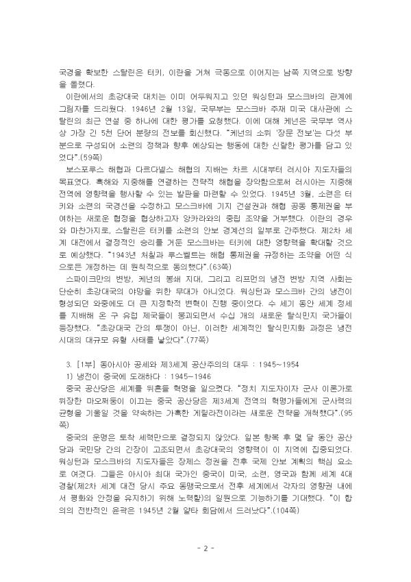 ÀÌ °úÁ¦¿¡¼ ¼±Á¤ÇÑ Ã¥Àº Æú Åä¸Ó½º üÀÓ¹ú¸°ÀÇ '¾Æ½Ã¾Æ 1945-1990'À̸ç, ³»¿ëÀº¼·Ð, 1Àå ¹× 1ºÎ¿¡ ÇØ´çÇÏ´Â 5-287 ÆäÀÌÁöÀÌ´Ù. Âü°í·Î ÀÌ Ã¥Àº ¼·Ð°ú ÃÑ 3ºÎ·Î ±¸¼ºµÇ¾î ÀÖ´Ù. 1. ¼·Ð: ³ÃÀü ½Ã´ë Æø·ÂÀÇ Áö¸®ÇÐ Æø·ÂÀº Ãʰ´ë±¹ °£ÀÇ ÅõÀï¿¡¼ 1945³â ÀÌÈÄ ¹Ì-¼Ò °£ÀÇ °æÀï°ú ±¹Á¦ Á¤Ä¡ÀÇ À±°ûÀ» Çü¼ºÇÏ´Â ¿ªÇÒÀ» Çß´Ù. ¶óƾ ¾Æ¸Þ¸®Ä«°¡ ¿ö½ÌÅÏÀÇ Á¦±¹ÁÖÀÇÀû ÀÛ¾÷ÀåÀ̾ú°í µ¿À¯·´ÀÌ ¸ð½ºÅ©¹ÙÀÇ »çȸÁÖÀÇ ½ÇÇè½ÇÀ̾ú´Ù¸é, ³²¾Æ½Ã¾ÆÀÇ ºÐÀï ±¹°æ Áö´ë´Â µÎ Ãʰ´ë±¹ÀÇ ºÀ¼â Àü·«°ú Çõ¸í ¹× ÀúÇ× ¹æ½ÄÀÇ ¹«´ë ¿ªÇÒÀ» Çß´Ù. ÀÌ Ã¥Àº Ãʰ´ë±¹ ÅõÀï¿¡¼ °Ý·ÄÇÏ°Ô Æø·ÂÀûÀ̾ú´ø ¾Æ½Ã¾Æ ³²ºÎ Áö¿ªÀ» µû¶ó ÆîÃÄÁø ³ÃÀüÀÇ Å»½Ä¹ÎÁö ±¹°æ Áö´ëÀÇ ¿ª»ç¸¦ ´Ù·é´Ù. À̸¦ ÅëÇØ ÇǺñ¸°³» ³ª´Â Ãæµ¹µéÀ» »ìÆìº¸°í, ¼¼°è Á¤¼¼ÀÇ È帧À» ¾î¶»°Ô Çü¼ºÇß´ÂÁö °íÂûÇÑ´Ù. ¿ö½ÌÅϰú ¸ð½ºÅ©¹Ù °£ÀÇ ³ÃÀüÀº ÀÌ À̾߱âÀÇ ÇÙ½ÉÀÌ´Ù. µÎ Ãʰ´ë±¹Àº ¸·´ëÇÑ ÀÚ¿øÀ» µ¿¿øÇϰí, ¼¼°è Áöµµ±ÇÀ» ÀÚÀÓÇÑ´Ù. ¼¼°è Áú¼¿¡ ´ëÇÑ ÃÑüÀûÀÎ ºñÀüÀ» ¼ö¿ëÇϰí, ÀÚ±¹ÀÇ ¾Èº¸ ÀÌÀÍÀ» ¼¼°èÀûÀÎ °ÍÀ¸·Î Á¤ÀÇÇßÀ¸¸ç, Àû´ë±¹ÀÇ ¼¼°èÀû ¿µÇâ·Â È®´ë¸¦ ¿ì·ÁÇß´Ù. ÀÌ·¯ÇÑ ¿ì·Á¿¡ À̲ø·Á ¹é¾Ç°ü°ú Å©·½¸°±ÃÀÇ ÁöµµÀÚµéÀº °æÀï±¹ÀÇ ¿µÇâ·Â È®´ë¸¦ ¾ïÁ¦Çϱâ À§ÇÑ Àü·«À» ½ÇÇàÇß´Ù. 2. öÀÇ À帷ÀÌ ÃÄÁö´Ù : 1945~1947 1945³â 5¿ù 24ÀÏ, µ¶ÀÏ Ç׺¹ 16ÀÏ ÈÄ, ¿µ±¹ ÃѸ® À©½ºÅÏ Ã³Ä¥Àº 7¿ù 1ÀϺÎÅÍ ½ÃÀ۵Ǵ ¹Ì¿µ ÇÕµ¿ ºÓÀº ±º´ë °ø°Ý °¡´É¼ºÀ» Á¶»çÇϱâ À§ÇØ "»ý°¢ÇÒ ¼ö ¾ø´Â ÀÛÀü(Operation Unthinkable)"À̶ó´Â Á¦¸ñÀÇ ±Øºñ ¿¬±¸¸¦ ÀÇ·ÚÇß´Ù. óĥÀº ½ºÅ»¸°ÀÌ µ¿À¯·´¿¡ ´ëÇÑ ÅëÁ¦¸¦ ¿ÏÈÇϵµ·Ï ¾Ð¹ÚÇϰíÀÚ Çß´Ù.(47ÂÊ) 1938³â À¯·´¿¡ ÀüÀïÀÇ ±×¸²ÀÚ°¡ µå¸®¿öÁöÀÚ, ¸ð½ºÅ©¹Ù´Â ¸ô·ÎÅäÇÁ-¸®º¥Æ®·ÎÇÁ Á¶¾à¿¡ ¼¸íÇß´Ù. ÀÌ Á¶¾à¿¡¼ µ¶Àϰú ¼Ò·ÃÀº ¼·Î °ø°ÝÇÏÁö ¾Ê°Ú´Ù°í ¾à¼ÓÇÏ°í Æú¶õµå¸¦ ºÐÇÒÇϱâ·Î ÇÕÀÇÇߴµ¥, °´ë±¹ ¿Ü±³ÀÇ ºñ±ØÀûÀÎ Èñ»ý¾çÀ̾ú´Ù. ¿¬ÇÕ±¹Àº ÀüÀï ¸»¹Ì¿¡ ¹«³ÊÁø µ¶ÀÏÀ» Á¡·É Áö¿ªÀ¸·Î ºÐÇÒÇß´Ù. ¿µ±¹°ú ¹Ì±¹ÀÇ ÁöµµÀÚµé, ±×¸®°í ´Ù¼Ò ´ú ¿Á¤ÀûÀ̾ú´ø ÇÁ¶û½º´Â µ¶ÀÏÀ» ¾ÈÁ¤ÀûÀÌ°í ¹ø¿µÇÏ´Â ÀüÈÄ À¯·´ÀÇ Ãʼ® Áß Çϳª·Î Àç°ÇÇϱ⸦ Èñ¸ÁÇß´Ù. ¡°µ¶ÀÏÀÌ »õ·Ó°Ô ºÎ»óÇÏ´Â ¼À¯·´ ÀÚº»ÁÖÀÇ Ã¼Á¦¿¡ ÅëÇÕµÇÁö ¸øÇϸé, üÁ¦ÀÇ °¡Àå °·ÂÇÑ ±¸¼º¿ø Áß Çϳª¸¦ ÀÒ°Ô µÉ »Ó¸¸ ¾Æ´Ï¶ó µ¶ÀÏ ±¹¹Îµé »çÀÌ¿¡ ±íÀº ºÐ³ë¸¦ ǰÀ» °ÍÀ̾ú´Ù¡±.(53ÂÊ) ¼Ò·Ã ÁöµµÀÚµéÀº ÀÌ¹Ì ¼¼°è ºÐÀïÀÇ ½ÂÀڷμ ¾òÀº ´ç¿¬ÇÑ ÁöÁ¤ÇÐÀû À̵æÀ» °ø°íÈ÷ ÇÒ °èȹÀ» ¼¼¿ì±â ½ÃÀÛÇßÀ¸¸ç, º¼¼ÎºñŰ Çõ¸í ÀÌÀüºÎÅÍÀÇ Àü·«Àû ¾ß¸ÁÀ» ½ÇÇöÇϰí ÀÖ¾ú´Ù. À¯·´ ±¹°æÀ» È®º¸ÇÑ ½ºÅ»¸°Àº ÅÍŰ, À̶õÀ» °ÅÃÄ ±Øµ¿À¸·Î À̾îÁö´Â ³²ÂÊ Áö¿ªÀ¸·Î ¹æÇâÀ» µ¹·È´Ù. À̶õ¿¡¼ÀÇ Ãʰ´ë±¹ ´ëÄ¡´Â ÀÌ¹Ì ¾îµÎ¿öÁö°í ÀÖ´ø ¿ö½ÌÅϰú ¸ð½ºÅ©¹ÙÀÇ °ü°è¿¡ ±×¸²ÀÚ¸¦ µå¸®¿ü´Ù. 1946³â 2¿ù 13ÀÏ, ±¹¹«ºÎ´Â ¸ð½ºÅ©¹Ù ÁÖÀç ¹Ì±¹ ´ë»ç°ü¿¡ ½ºÅ»¸°ÀÇ ÃÖ±Ù ¿¬¼³ Áß Çϳª¿¡ ´ëÇÑ Æò°¡¸¦ ¿äûÇß´Ù. ÀÌ¿¡ ´ëÇØ ÄɳÍÀº ±¹¹«ºÎ ¿ª»ç»ó °¡Àå ±ä 5õ ´Ü¾î ºÐ·®ÀÇ Àüº¸¸¦ ȸ½ÅÇß´Ù. ¡°ÄɳÍÀÇ ¼ÒÀ§ 'Àå¹® Àüº¸'´Â ´Ù¼¸ ºÎºÐÀ¸·Î ±¸¼ºµÇ¾î ¼Ò·ÃÀÇ Á¤Ã¥°ú ÇâÈÄ ¿¹»óµÇ´Â Çൿ¿¡ ´ëÇÑ ½Å¶öÇÑ Æò°¡¸¦ ´ã°í ÀÖ¾ú´Ù¡±.(59ÂÊ) º¸½ºÆ÷·ç½º ÇØÇù°ú ´Ù¸£´Ù³Ú½º ÇØÇùÀÇ Áö¹è´Â Â÷¸£ ½Ã´ëºÎÅÍ ·¯½Ã¾Æ ÁöµµÀÚµéÀÇ ¸ñÇ¥¿´´Ù. ÈæÇØ¿Í ÁöÁßÇØ¸¦ ¿¬°áÇÏ´Â Àü·«Àû ÇØÇùÀ» Àå¾ÇÇÔÀ¸·Î½á ·¯½Ã¾Æ´Â ÁöÁßÇØ Àü¿ª¿¡ ¿µÇâ·ÂÀ» Çà»çÇÒ ¼ö ÀÖ´Â ¹ßÆÇÀ» ¸¶·ÃÇÒ ¼ö ÀÖ¾ú´Ù. 1945³â 3¿ù, ¼Ò·ÃÀº ÅÍŰ¿Í ¼Ò·ÃÀÇ ±¹°æ¼±À» ¼öÁ¤ÇÏ°í ¸ð½ºÅ©¹Ù¿¡ ±âÁö °Ç¼³±Ç°ú ÇØÇù °øµ¿ ÅëÁ¦±ÇÀ» ºÎ¿©ÇÏ´Â »õ·Î¿î ÇùÁ¤À» Çù»óÇϰíÀÚ ¾ÓÄ«¶ó¿ÍÀÇ Á߸³ Á¶¾àÀ» °ÅºÎÇß´Ù. À̶õÀÇ °æ¿ì¿Í ¸¶Âù°¡Áö·Î, ½ºÅ»¸°Àº ÅÍ۸¦ ¼Ò·ÃÀÇ ¾Èº¸ °æ°è¼±ÀÇ ÀϺηΠ°£ÁÖÇß´Ù. Á¦2Â÷ ¼¼°è ´ëÀü¿¡¼ °áÁ¤ÀûÀÎ ½Â¸®¸¦ °ÅµÐ ¸ð½ºÅ©¹Ù´Â ÅÍŰ¿¡ ´ëÇÑ ¿µÇâ·ÂÀ» È®´ëÇÒ °ÍÀ¸·Î ¿¹»óÇß´Ù. ¡°1943³â óĥ°ú ·ç½ºº§Æ®´Â ÇØÇù ÅëÁ¦±ÇÀ» ±ÔÁ¤ÇÏ´Â Á¶¾àÀ» ¾î¶² ½ÄÀ¸·Îµç °³Á¤ÇÏ´Â µ¥ ¿øÄ¢ÀûÀ¸·Î µ¿ÀÇÇß´Ù¡±.(63ÂÊ) ½ºÆÄÀÌÅ©¸¸ÀÇ º¯¹æ, ÄɳÍÀÇ ºÀ¼â Áö´ë, ±×¸®°í ¸®ÇÁ¸ÕÀÇ ³ÃÀü º¯¹æ Áö¿ª »çȸ´Â ´Ü¼øÈ÷ Ãʰ´ë±¹ÀÇ ¾ß¸ÁÀ» À§ÇÑ ¹«´ë°¡ ¾Æ´Ï¾ú´Ù. ¿ö½ÌÅϰú ¸ð½ºÅ©¹Ù °£ÀÇ ³ÃÀüÀÌ Çü¼ºµÇ´ø 