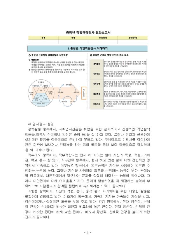 ÀÏÀÇ ¼¼°è¿¡ ÁøÀÔÇÏ·Á´Â »ç¶÷µéÀº ¸¹´Ù. ±×·¯³ª Á÷¾÷À» ±¸ÇÏÁö ¾ÊÀ¸¸é ¾È µÉ óÁö¿¡ ³õ¿© ÀÖ´Ù°í ÇØ¼ ´©±¸³ª ¿øÇÏ´Â Á÷¾÷À» ±¸ÇÒ ¼ö ÀÖ´Â °ÍÀº ¾Æ´Ï´Ù. Á÷¾÷»ó´ãÀÚµéÀº ³»´ãÀÚ°¡ °ú°ÅÀÇ Á÷¹«°æÇèÀ̳ª ÈÆ·ÃÀ» ÅëÇØ ¾î¶² ±â¼úµéÀ» ½ÀµæÇÏ¿´À¸¸ç, ¶ÇÇÑ ±×·¯ÇÑ ±â¼úµéÀÌ ¾î¶² Á÷¹«µé¿¡¼ Ȱ¿ëµÉ ¼ö Àִ°¡¸¦ ÆÄ¾ÇÇÏ¿©¾ß ÇÑ´Ù. °í¿ë24 »çÀÌÆ®(www.work24.go.kr)ÀÇ ¼ºÀÎ¿ë ½É¸®°Ë»ç´Â °³ÀÎÀÇ Áø·ÎƯ¼º(Àû¼º, Èï¹Ì, °¡Ä¡°ü µî)¿¡ µû¸¥ Á÷¾÷ ¿¹Ãø°á°ú¸¦ Á¦°øÇÏ´Â ¼ºñ½º´Ù. ¿öÅ©³ÝÀÇ ´Ù¾çÇÑ Á÷¾÷Á¤º¸ÀÚ·á¿Í ¿¬°èÇØ ¼ºÀÎ ±¸Á÷ÀÚµéÀÌ È¿À²ÀûÀ¸·Î Á÷¾÷À» ¼±ÅÃÇϵµ·Ï Áö¿øÇÑ´Ù. ¿Ã¹Ù¸¥ Áø·Î¸¦ ¼±ÅÃÇÏ·Á¸é °³ÀÎÀÇ Æ¯¼ºÀ» °´°üÀûÀ¸·Î ÆÄ¾ÇÇÏ´Â °ÍÀÌ ¹«¾ùº¸´Ù Áß¿äÇѵ¥, ±× ¿ªÇÒÀ» ÇØ³»°í ÀÖ´Ù. ¾Æ¿ï·¯ °³ÀÎÀÇ Æ¯¼º°ú Á÷¾÷¿¡¼ ¿ä±¸Çϴ Ư¼ºÀ» ¸ÅνÃÄÑ ÀûÇÕÇÑ Á÷¾÷ºÐ¾ß¸¦ Á¦½ÃÇØÁÖ´Â ÀÚ·á·Î Ȱ¿ëµÇ°í ÀÖ´Ù. ÀÌ ·¹Æ÷Æ®´Â °í¿ë24 »çÀÌÆ®(www.work24.go.kr)ÀÇ ¼ºÀÎ¿ë ½É¸®°Ë»ç Áß¿¡¼ ÁßÀå³â Á÷¾÷¿ª·®°Ë»ç, Á÷¾÷°¡Ä¡°ü°Ë»ç¸¦ ¼öÇà ÈÄ °úÁ¦ Áú¹®¿¡ ´ëÇØ ¼¼úÇÏ¿´´Ù. II. º» ·Ð 1. ÁßÀå³â Á÷¾÷¿ª·®°Ë»ç 1) ½Ç½ÃÇÑ °Ë»ç¸í Á¦½Ã ¹× °Ë»ç¿¡ ´ëÇÑ ¼³¸í ½Ç½ÃÇÑ °Ë»ç¸íÀº ÁßÀå³â Á÷¾÷¿ª·®°Ë»çÀÌ´Ù. ÀÌ °Ë»ç´Â ÁßÀå³â ±Ù·ÎÀÚÀÇ °æ·Â°³¹ßÀ» À§ÇØ °æ·ÂȰµ¿, ³×Æ®¿öÅ©, Á¶Á÷, ÀçÃë¾÷ÁغñÀÇ °æ·Â°³¹ß°ú Á÷¹«, °¡Á·ÀÇÁöÁö, °Ç°, ½É¸®Àû¿äÀÎÀÇ Á÷¾÷¿ª·® ¹× À繫ÀûÁ¦¾à, »çȸÀûÁ¦¾à°ú °°Àº ´Ù¾çÇÑ ¿ä¼ÒµéÀ» Á¶¸ÁÇÏ°í °æ·ÂȰµ¿, Á÷¹«´É·Â, Á÷¹«Åµµ, °³ÀÎÆ¯¼º, ±âÃÊÀÚ»ê ¿ä¼Ò¸¦ À¯±âÀûÀ¸·Î Á¶ÇÕÇÏ¿© Á¦2°æ·ÂÀ» ¿Ï¼ºÇϵµ·Ï µµ¿ÍÁØ´Ù. °æ·Â Ȱµ¿Àº ÇâÈÄ °æ·Â º¯È¸¦ »ý°¢ÇÏ¸é¼ Àå±âÀûÀÌ°í ½ÇÇà °¡´ÉÇÑ ¸ñÇ¥¸¦ ¼¼¿ì°í ÇÊ¿äÇÑ È°µ¿À» ÇÏ´ÂÁö, °æ·Â ÀüȯÀÌ ÇÊ¿äÇÒ °æ¿ì ÀçÃë¾÷¿¡ ´ëÇÑ Àڽۨ Á¤µµ¸¦ ³ªÅ¸³½´Ù. Á÷¹« ŵµ´Â ÇöÀç Á¾»çÇϰí ÀÖ´Â ÀÏ¿¡ ´ëÇÑ °¨Á¤À¸·Î¼, ÇöÀçÀÇ ÀÏÀÌ ÀÚ½ÅÀÇ °¡Ä¡°ü°ú Èï¹Ì¿Í ÀÏÄ¡ÇÑ´Ù°í »ý°¢ÇÏ´Â Á¤µµ¿Í ÇöÀçÀÇ ÀÏ¿¡ ¸¸Á·ÇÏ´Â Á¤µµ¸¦ ³ªÅ¸³½´Ù. Á÷¹« ´É·ÂÀº ÀϹÝÀûÀ¸·Î ÀÏÀ» ÇÒ ¶§ ÇÊ¿äÇÑ Áö½Ä°ú ±â¼úÀ» »ç¿ëÇÒ ¼ö ÀÖ´Â ´É·Â°ú ¾÷¹«¸¦ À§ÇØ ´Ù¸¥ »ç¶÷°ú ±³·ùÇÏ¸é¼ »ý±â´Â ¹®Á¦¸¦ ÇØ°áÇÏ´Â ´É·Â¿¡ ´ëÇÑ ÀÚ½ÅÀÇ ÆÇ´ÜÀÌ´Ù. °³ÀΠƯ¼ºÀº °³ÀÎÀÇ ¼º°ÝƯ¼ºÀ¸·Î¼, ÀÚ±â, ŸÀÎ, ¼¼»ó¿¡ ´ëÇØ ±àÁ¤ÀûÀΠŵµ¸¦ °®°í ÀڽۨÀ» º¸ÀÌ´Â Á¤µµ¿Í ´Ù¾çÇÑ »óȲ°ú »ç¹°¿¡ ´ëÇÑ È£±â½É°ú °³¹æ¼ºÀ» °¡Áø Á¤µµ¸¦ ³ªÅ¸³½´Ù. ±âÃÊ ÀÚ»êÀº ÇâÈÄ °æ·ÂÀ» Ãß±¸ÇÏ´Â µ¥ ÇÊ¿äÇÑ ±âº»Àû ÀÚ¿øÀ¸·Î¼, ÀÚ½ÅÀÇ Á¤½ÅÀû, ½ÅüÀû °Ç°¿¡ ´ëÇÑ Àü¸Á°ú °¡Á·ÀÌ ¹Ï°í ÁöÁöÇØÁÖ´Â Á¤µµ¸¦ ³ªÅ¸³½´Ù. 2) °Ë»ç¸¦ ¼±ÅÃÇÑ ÀÌÀ¯ Áö¼ÓÀûÀ¸·Î º¯ÈÇÏ´Â »ê¾÷ ȯ°æ¿¡ ÀûÀÀÇϱâ À§ÇØ ÁßÀå³âÃþÀº ÀÚ½ÅÀÇ Á÷¾÷¿ª·®À» ÁÖ±âÀûÀ¸·Î Á¡°ËÇÒ Çʿ䰡 ÀÖ´Ù. ±Þ¼ÓÇÑ ±â¼ú ¹ßÀü°ú µðÁöÅÐ Çõ½ÅÀº ´Ù¾çÇÑ Á÷¹«¿¡¼ ¿ä±¸µÇ´Â ±â¼ú°ú ´É·ÂÀ» º¯È½ÃŲ´Ù. ƯÈ÷ ICT ±â¼ú, µ¥ÀÌÅÍ ºÐ¼® ´É·Â, µðÁöÅÐ ¼ÒÅë ´É·Â µîÀº Á¡Á¡ ´õ ¸¹Àº »ê¾÷¿¡¼ ÇʼöÀûÀÎ ¿ª·®À¸·Î ÀÚ¸® Àâ°í ÀÖ´Ù. Á÷¾÷¿ª·®°Ë»ç´Â ÀÌ·¯ÇÑ º¯È¿¡ ÀÚ½ÅÀÇ ´É·ÂÀÌ ¾ó¸¶³ª ºÎÇÕÇÏ´ÂÁö¸¦ ÆÄ¾ÇÇϰí ÇÊ¿äÇÑ Ãß°¡ ±³À°À̳ª ÈÆ·ÃÀ» °èȹÇÏ´Â µ¥ µµ¿òÀ» ÁÙ ¼ö ÀÖ´Ù. ÁßÀå³â±â¿¡´Â °æ·Â ÀüȯÀ̳ª »õ·Î¿î Á÷¾÷ Ž»öÀÇ Çʿ伺ÀÌ Áõ°¡ÇÒ ¼ö ÀÖ´Ù. ÀÌ¹Ì ÇÑ Á¶Á÷¿¡¼ ¸¹Àº ½Ã°£À» º¸³½ Á÷ÀåÀÎÀÌ »õ·Î¿î ±âȸ¸¦ ¸ð»öÇϰųª, °æ·Â »ç´Ù¸®¸¦ ¿À¸£·Á ÇÒ ¶§, ÀÚ½ÅÀÇ ¿ª·®À» °´°üÀûÀ¸·Î Æò°¡ÇÏ´Â °ÍÀÌ Áß¿äÇÏ´Ù. Á÷¾÷¿ª·®°Ë»ç´Â ÀÚ½ÅÀÇ °Á¡°ú ¾àÁ¡À» ½Äº°Çϰí, À̸¦ ±â¹ÝÀ¸·Î ´õ ³ªÀº °æ·Â ¼±ÅÃÀ» À§ÇÑ µ¥ÀÌÅ͸¦ Á¦°øÇÒ ¼ö ÀÖ´Ù. ³ª¾Æ°¡, ÁßÀå³âÃþÀº Á¾Á¾ ¸®´õ½Ê ¿ªÇÒÀ» Æ÷ÇÔÇÑ ´õ ³ôÀº Ã¥ÀÓÀ» ¿ä±¸¹Þ°Ô µÈ´Ù. ÀÌ·¯ÇÑ ¿ªÇÒÀ» ¼º°øÀûÀ¸·Î ¼öÇàÇϱâ À§Çؼ´Â ÀÚ½ÅÀÇ °ü¸®, ÀÇ»ç¼ÒÅë, Àü·«Àû »ç°í ´É·Â µî ´Ù¾çÇÑ ¿ª·®À» °ÈÇØ¾ß ÇÑ´Ù. Á÷¾÷¿ª·®°Ë»ç´Â Á÷Àå ³» ¸¸Á·µµ ¹× Á÷¹« ¼öÇà ´É·Â°úµµ ¹ÐÁ¢ÇÏ°Ô ¿¬°áµÉ ¼ö ÀÖ´Ù. ÀÚ½ÅÀÇ ¿ª·®ÀÌ Á÷¹« ¿ä±¸¿¡ ºÎÇÕÇÏÁö ¾ÊÀ» °æ¿ì, Á÷Àå ³» ½ºÆ®·¹½º¿Í ºÒ¸¸À¸·Î À̾îÁú ¼ö ÀÖ´Ù. µû¶ó¼ Á÷¾÷¿ª·®°Ë»ç¸¦ ÅëÇØ Á÷¹«¿¡¼ ¿ä±¸ÇÏ´Â ÇÙ½É ´É·Â°ú ÀÚ½ÅÀÇ ¿ª·® »çÀÌÀÇ °ÝÂ÷¸¦ ÁÙ¿© ³ª°¡´Â °ÍÀº Á÷¹« ¸¸Á·µµ¿Í Á¶Á÷ ³» ¼º°ø¿¡ Áß¿äÇÑ ¿ä¼Ò°¡ µÈ´Ù. - 