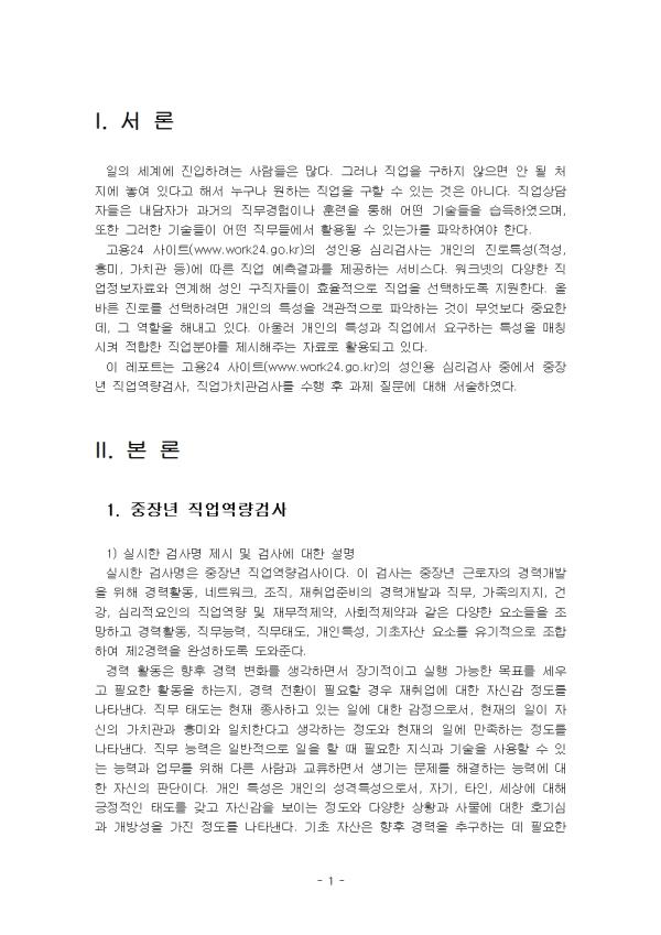 ÀÌ ·¹Æ÷Æ®´Â °í¿ë24 »çÀÌÆ®(www.work24.go.kr)ÀÇ ¼ºÀÎ¿ë ½É¸®°Ë»ç Áß¿¡¼­ ÁßÀå³â Á÷¾÷¿ª·®°Ë»ç, Á÷¾÷°¡Ä¡°ü°Ë»ç¸¦ ¼öÇà ÈÄ °úÁ¦ Áú¹®¿¡ ´ëÇØ ¼­¼úÇÏ¿´´Ù.