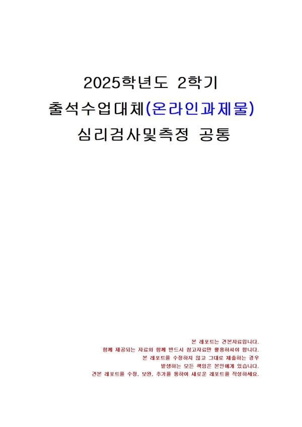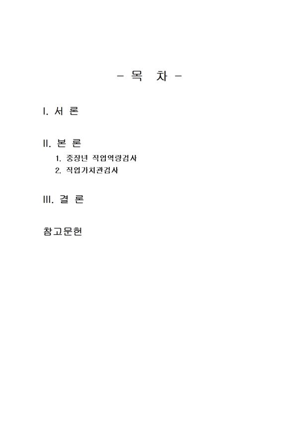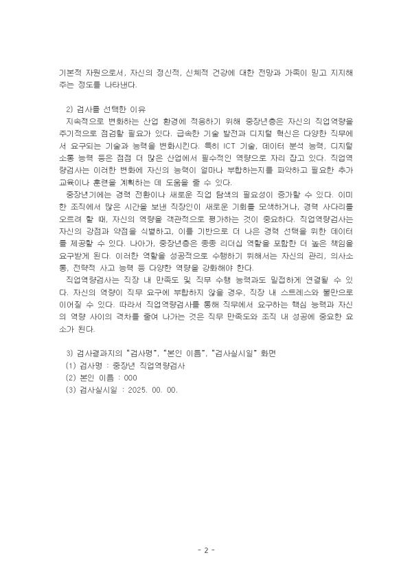 1. ½Ç½ÃÇÑ °Ë»ç¸í Á¦½Ã ¹× °Ë»ç¿¡ ´ëÇÑ ¼³¸í (ºÐ·®: 30~40ÁÙ) - °í¿ë24 »çÀÌÆ®ÀÇ °Ë»ç ¼Ò°³¸¦ ±×´ë·Î ¿Å°Ü ÀûÁö ¸»°í, ÀÚ½ÅÀÌ ÀÌÇØÇÑ ¹Ù¸¦ ¿ä¾àÁ¤¸®ÇÒ °Í. 2. °¢ °Ë»ç¸¦ ¼±ÅÃÇÑ ÀÌÀ¯ (ºÐ·®: 10~20ÁÙ) - °ÀǸ¦ Åä´ë·Î °Ë»ç´ë»óÀÇ Æ¯¼º°ú ÇÊ¿ä, °Ë»ç½Ç½Ã ¸ñÀû¿¡ ºÎÇÕÇÏ´Â °Ë»ç¸¦ ¼±ÅÃÇÒ °Í. 3. °Ë»ç°á°úÁö 2°³ÀÇ ¡°°Ë»ç¸í¡±, ¡°º»ÀÎ À̸§¡±, ¡°°Ë»ç½Ç½ÃÀÏ¡± ȸé Á¦½Ã (ºÐ·®: 1Àå À̳») - 2025³â 8¿ù ÀÌÈÄ, º»ÀÎ ½Ç¸íÀ¸·Î °Ë»ç¸¦ ½Ç½ÃÇϰí, °Ë»ç°á°úÁöÀÇ °Ë»ç¸í, º»ÀÎ À̸§, °Ë»ç ½Ç½ÃÀÏ ºÎºÐÀ» ȸéĸóÇÏ¿© Æ÷ÇÔÇÒ °Í. Çʼö»çÇ×ÀÌ¸ç ½Äº°°¡´ÉÇØ¾ß ÇÔ. 4. °Ë»ç°á°ú ¼³¸í (ºÐ·®: 60~80ÁÙ ³»¿Ü) - ±¸Ã¼ÀûÀÎ °á°ú ¼öÄ¡¿Í ÁÖ¿ä ³»¿ëÀ» Æ÷ÇÔÇϵÇ, °Ë»ç°á°úÁö ³»¿ëÀ» ±×´ë·Î ¿Å°Ü ÀûÁö ¸»°í, ÀÚ½ÅÀÌ ÀÌÇØÇÑ ¹Ù¸¦ Á¤¸®ÇÏ¿© ÀÛ¼ºÇÒ °Í. 5. °Ë»ç ½Ç½Ã°úÁ¤°ú °á°ú¸¦ ÅëÇØ Àڽſ¡ ´ëÇØ ¾Ë°Ô µÈ Á¡°ú ÇâÈÄ °èȹ (ºÐ·®: 30~40ÁÙ) - ÀÚ±âÀÌÇØ, ´ëÀΰü°è, Áø·Î Ãø¸é¿¡¼ ÀÛ¼ºÇÒ °Í. - ¸ñ Â÷ - I. ¼ ·Ð II. º» ·Ð 1. ÁßÀå³â Á÷¾÷¿ª·®°Ë»ç 2. Á÷¾÷°¡Ä¡°ü°Ë»ç III. °á ·Ð Âü°í¹®Çå ** ÇÔ²² Á¦°øµÇ´Â Âü°íÀÚ·á ÇÑ±ÛÆÄÀÏ ** 1. ¼ºÀÎ¿ë ¼º°ÝÀ¯Çü°Ë»ç.hwp 2. ¼ºÀοë Áø·ÎÀû¼º°Ë»ç.hwp 3. Á÷¹«½ºÆ®·¹½º°Ë»ç.hwp 4. Á÷¹«Èï¹Ì°Ë»ç.hwp 5. Á÷¾÷°¡Ä¡°ü°Ë»ç.hwp ÀÚ·á³»¿ë ¹Ì¸®º¸±â