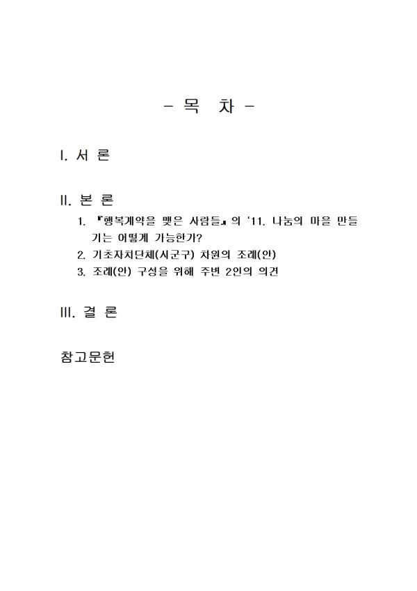 - ³»°¡ »ì°í ÀÖ´Â Áö¿ª»çȸ¿¡¼ ¡®º¸ÅëÀÇ »îÀÌ Ãë¾àÇÑ Áý´Ü(°èÃþ)¡¯À» ã¾Æ³»¾î ¨ç À̵éÀ» À§ÇÑ ±âÃÊÀÚÄ¡´Üü(½Ã±º±¸) Â÷¿øÀÇ Á¶·Ê(¾È)À» ¸¸µå½Ã¿À. ¨è Á¶·Ê(¾È) ±¸¼ºÀ» À§ÇØ ÁÖº¯ 2ÀÎÀÇ ÀǰßÀ» ûÃëÇϰí, ³»¿ëµµ ÇÔ²² ÀÚÀ¯·Ó°Ô ±â¼úÇϽÿÀ. - º» Áß°£ °úÁ¦ÀÇ °á°ú¹° ÀÛ¼º °ú¾÷Àº ÃÑ 2°³ÀÓ. ¨ç°ú ¨è - ¸ñ Â÷ - I. ¼ ·Ð II. º» ·Ð 1. ¡ºÇູ°è¾àÀ» ¸ÎÀº »ç¶÷µé¡»ÀÇ ¡®11. ³ª´®ÀÇ ¸¶À» ¸¸µé±â´Â ¾î¶»°Ô °¡´ÉÇѰ¡? 2. ±âÃÊÀÚÄ¡´Üü(½Ã±º±¸) Â÷¿øÀÇ Á¶·Ê(¾È) 3. Á¶·Ê(¾È) ±¸¼ºÀ» À§ÇØ ÁÖº¯ 2ÀÎÀÇ ÀÇ°ß III. °á ·Ð Âü°í¹®Çå ** ÇÔ²² Á¦°øµÇ´Â Âü°íÀÚ·á ÇÑ±ÛÆÄÀÏ ** 1. ±âÃÊÀÚÄ¡´Üü Â÷¿øÀÇ Á¶·Ê(¾È).hwp 2. ±âÃÊÀÚÄ¡´Üü Â÷¿øÀÇ Á¶·Ê(¾È)2.hwp 3. ±âÃÊÀÚÄ¡´Üü Â÷¿øÀÇ Á¶·Ê(¾È)3.hwp 4. ±âÃÊÀÚÄ¡´Üü Â÷¿øÀÇ Á¶·Ê(¾È)4.hwp 5. ÀÇ°ß Ã»Ãë ³»¿ë.hwp 6. ÀÇ°ß Ã»Ãë ³»¿ë2.hwp 7. ÀÇ°ß Ã»Ãë ³»¿ë3.hwp 8. ÀÇ°ß Ã»Ãë ³»¿ë4.hwp ÀÚ·á³»¿ë ¹Ì¸®º¸±â