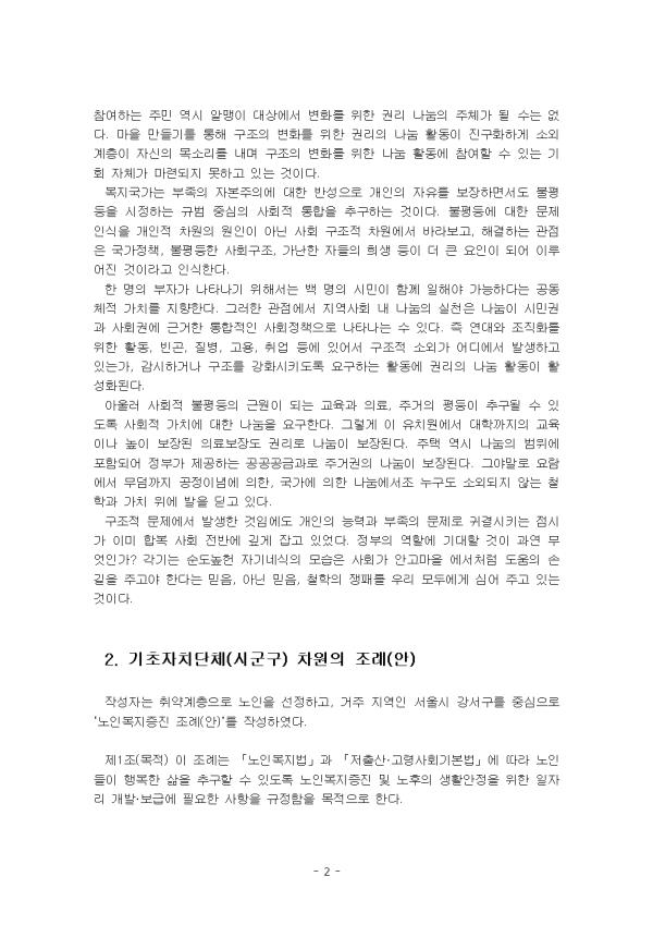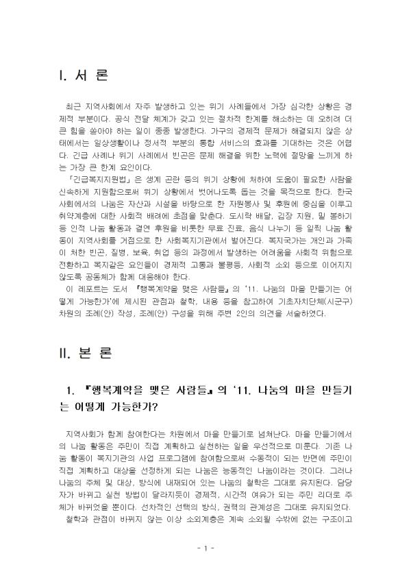 ÃÖ±Ù Áö¿ª»çȸ¿¡¼ ÀÚÁÖ ¹ß»ýÇϰí ÀÖ´Â À§±â »ç·Êµé¿¡¼ °¡Àå ½É°¢ÇÑ »óȲÀº °æÁ¦Àû ºÎºÐÀÌ´Ù. °ø½Ä Àü´Þ ü°è°¡ °®°í ÀÖ´Â ÀýÂ÷Àû ÇѰ踦 ÇØ¼ÒÇÏ´Â µ¥ ¿ÀÈ÷·Á ´õ Å« ÈûÀ» ½ñ¾Æ¾ß ÇÏ´Â ÀÏÀÌ Á¾Á¾ ¹ß»ýÇÑ´Ù. °¡±¸ÀÇ °æÁ¦Àû ¹®Á¦°¡ ÇØ°áµÇÁö ¾ÊÀº »óÅ¿¡¼´Â ÀÏ»ó»ýȰÀ̳ª Á¤¼Àû ºÎºÐÀÇ ÅëÇÕ ¼ºñ½ºÀÇ È¿°ú¸¦ ±â´ëÇÏ´Â °ÍÀº ¾î·Æ´Ù. ±ä±Þ »ç·Ê³ª À§±â »ç·Ê¿¡¼ ºó°ïÀº ¹®Á¦ ÇØ°áÀ» À§ÇÑ ³ë·Â¿¡ Àý¸ÁÀ» ´À³¢°Ô ÇÏ´Â °¡Àå Å« ÇÑ°è ¿äÀÎÀÌ´Ù. ¡¸±ä±Þº¹ÁöÁö¿ø¹ý¡¹Àº »ý°è °ï¶õ µîÀÇ À§±â »óȲ¿¡ óÇÏ¿© µµ¿òÀÌ ÇÊ¿äÇÑ »ç¶÷À» ½Å¼ÓÇÏ°Ô Áö¿øÇÔÀ¸·Î½á À§±â »óȲ¿¡¼ ¹þ¾î³ªµµ·Ï µ½´Â °ÍÀ» ¸ñÀûÀ¸·Î ÇÑ´Ù. Çѱ¹ »çȸ¿¡¼ÀÇ ³ª´®Àº ÀÚ»ê°ú ½Ã¼³À» ¹ÙÅÁÀ¸·Î ÇÑ ÀÚ¿øºÀ»ç ¹× ÈÄ¿ø¿¡ Áß½ÉÀ» ÀÌ·ç°í Ãë¾à°èÃþ¿¡ ´ëÇÑ »çȸÀû ¹è·Á¿¡ ÃÊÁ¡À» ¸ÂÃá´Ù. µµ½Ã¶ô ¹è´Þ, ±èÀå Áö¿ø, ¹Ø “ýÇϱ⠵î ÀÎÀû ³ª´® Ȱµ¿°ú °á¿¬ ÈÄ¿øÀ» ºñ·ÔÇÑ ¹«·á Áø·á, À½½Ä ³ª´©±â µî ÀÏÂï ³ª´® Ȱµ¿ÀÌ Áö¿ª»çȸ¸¦ °ÅÁ¡À¸·Î ÇÑ »çȸº¹Áö±â°ü¿¡¼ ¹ú¾îÁø´Ù. º¹Áö±¹°¡´Â °³Àΰú °¡Á·ÀÌ Ã³ÇÑ ºó°ï, Áúº´, º¸À°, Ãë¾÷ µîÀÇ °úÁ¤¿¡¼ ¹ß»ýÇÏ´Â ¾î·Á¿òÀ» »çȸÀû À§ÇèÀ¸·Î ÀüȯÇÏ°í º¹Áö°°Àº ¿äÀεéÀÌ °æÁ¦Àû °íÅë°ú ºÒÆòµî, »çȸÀû ¼Ò¿Ü µîÀ¸·Î À̾îÁöÁö ¾Êµµ·Ï °øµ¿Ã¼°¡ ÇÔ²² ´ëÀÀÇØ¾ß ÇÑ´Ù. ÀÌ ·¹Æ÷Æ®´Â µµ¼ ¡ºÇູ°è¾àÀ» ¸ÎÀº »ç¶÷µé¡»ÀÇ ¡®11. ³ª´®ÀÇ ¸¶À» ¸¸µé±â´Â ¾î¶»°Ô °¡´ÉÇѰ¡¡¯¿¡ Á¦½ÃµÈ °üÁ¡°ú öÇÐ, ³»¿ë µîÀ» Âü°íÇÏ¿© ±âÃÊÀÚÄ¡´Üü(½Ã±º±¸) Â÷¿øÀÇ Á¶·Ê(¾È) ÀÛ¼º, Á¶·Ê(¾È) ±¸¼ºÀ» À§ÇØ ÁÖº¯ 2ÀÎÀÇ ÀǰßÀ» ¼¼úÇÏ¿´´Ù. II. º» ·Ð 1. ¡ºÇູ°è¾àÀ» ¸ÎÀº »ç¶÷µé¡»ÀÇ ¡®11. ³ª´®ÀÇ ¸¶À» ¸¸µé±â´Â ¾î¶»°Ô °¡´ÉÇѰ¡? Áö¿ª»çȸ°¡ ÇÔ²² Âü¿©ÇÑ´Ù´Â Â÷¿ø¿¡¼ ¸¶À» ¸¸µé±â·Î ³ÑÃij´Ù. ¸¶À» ¸¸µé±â¿¡¼ÀÇ ³ª´® Ȱµ¿Àº ÁÖ¹ÎÀÌ Á÷Á¢ °èȹÇÏ°í ½ÇõÇÏ´Â ÀÏÀ» ¿ì¼±ÀûÀ¸·Î ¹Ì·é´Ù. ±âÁ¸ ³ª´® Ȱµ¿ÀÌ º¹Áö±â°üÀÇ »ç¾÷ ÇÁ·Î±×·¥¿¡ Âü¿©ÇÔÀ¸·Î½á ¼öµ¿ÀûÀÌ µÇ´Â ¹Ý¸é¿¡ ÁÖ¹ÎÀÌ Á÷Á¢ °èȹÇÏ°í ´ë»óÀ» ¼±Á¤ÇÏ°Ô µÇ´Â ³ª´®Àº ´Éµ¿ÀûÀÎ ³ª´®À̶ó´Â °ÍÀÌ´Ù. ±×·¯³ª ³ª´®ÀÇ ÁÖü ¹× ´ë»ó, ¹æ½Ä¿¡ ³»ÀçµÇ¾î ÀÖ´Â ³ª´®ÀÇ Ã¶ÇÐÀº ±×´ë·Î À¯ÁöµÈ´Ù. ´ã´çÀÚ°¡ ¹Ù²î°í ½Çõ ¹æ¹ýÀÌ ´Þ¶óÁöµíÀÌ °æÁ¦Àû, ½Ã°£Àû ¿©À¯°¡ µÇ´Â ÁֹΠ¸®´õ·Î ÁÖü°¡ ¹Ù²î¾úÀ» »ÓÀÌ´Ù. ¼±Â÷ÀûÀÎ ¼±ÅÃÀÇ ¹æ½Ä, ±Ç·ÂÀÇ °ü°è¼ºÀº ±×´ë·Î À¯ÁöµÇ¾ú´Ù. öÇаú °üÁ¡ÀÌ ¹Ù²îÁö ¾Ê´Â ÀÌ»ó ¼Ò¿Ü°èÃþÀº °è¼Ó ¼Ò¿ÜµÉ ¼ö¹Û¿¡ ¾ø´Â ±¸Á¶À̰í Âü¿©ÇÏ´Â ÁֹΠ¿ª½Ã ¾Ë¸ÍÀÌ ´ë»ó¿¡¼ º¯È¸¦ À§ÇÑ ±Ç¸® ³ª´®ÀÇ ÁÖü°¡ µÉ ¼ö´Â ¾ø´Ù. ¸¶À» ¸¸µé±â¸¦ ÅëÇØ ±¸Á¶ÀÇ º¯È¸¦ À§ÇÑ ±Ç¸®ÀÇ ³ª´® Ȱµ¿ÀÌ Áø±¸ÈÇÏ°Ô ¼Ò¿Ü°èÃþÀÌ ÀÚ½ÅÀÇ ¸ñ¼Ò¸®¸¦ ³»¸ç ±¸Á¶ÀÇ º¯È¸¦ À§ÇÑ ³ª´® Ȱµ¿¿¡ Âü¿©ÇÒ ¼ö ÀÖ´Â ±âȸ ÀÚü°¡ ¸¶·ÃµÇÁö ¸øÇϰí ÀÖ´Â °ÍÀÌ´Ù. º¹Áö±¹°¡´Â ºÎÁ·ÀÇ ÀÚº»ÁÖÀÇ¿¡ ´ëÇÑ ¹Ý¼ºÀ¸·Î °³ÀÎÀÇ ÀÚÀ¯¸¦ º¸ÀåÇϸ鼵µ ºÒÆòµîÀ» ½ÃÁ¤ÇÏ´Â ±Ô¹ü Áß½ÉÀÇ »çȸÀû ÅëÇÕÀ» Ãß±¸ÇÏ´Â °ÍÀÌ´Ù. ºÒÆòµî¿¡ ´ëÇÑ ¹®Á¦ ÀνÄÀ» °³ÀÎÀû Â÷¿øÀÇ ¿øÀÎÀÌ ¾Æ´Ñ »çȸ ±¸Á¶Àû Â÷¿ø¿¡¼ ¹Ù¶óº¸°í, ÇØ°áÇÏ´Â °üÁ¡Àº ±¹°¡Á¤Ã¥, ºÒÆòµîÇÑ »çȸ±¸Á¶, °¡³ÇÑ ÀÚµéÀÇ Èñ»ý µîÀÌ ´õ Å« ¿äÀÎÀÌ µÇ¾î ÀÌ·ç¾îÁø °ÍÀ̶ó°í ÀνÄÇÑ´Ù. ÇÑ ¸íÀÇ ºÎÀÚ°¡ ³ªÅ¸³ª±â À§Çؼ´Â ¹é ¸íÀÇ ½Ã¹ÎÀÌ ÇÔ²² ÀÏÇØ¾ß °¡´ÉÇÏ´Ù´Â °øµ¿Ã¼Àû °¡Ä¡¸¦ ÁöÇâÇÑ´Ù. ±×·¯ÇÑ °üÁ¡¿¡¼ Áö¿ª»çȸ ³» ³ª´®ÀÇ ½ÇõÀº ³ª´®ÀÌ ½Ã¹Î±Ç°ú »çȸ±Ç¿¡ ±Ù°ÅÇÑ ÅëÇÕÀûÀÎ »çȸÁ¤Ã¥À¸·Î ³ªÅ¸³ª´Â ¼ö ÀÖ´Ù. Áï ¿¬´ë¿Í Á¶Á÷ȸ¦ À§ÇÑ È°µ¿, ºó°ï, Áúº´, °í¿ë, Ãë¾÷ µî¿¡ ÀÖ¾î¼ ±¸Á¶Àû ¼Ò¿Ü°¡ ¾îµð¿¡¼ ¹ß»ýÇϰí Àִ°¡, °¨½ÃÇϰųª ±¸Á¶¸¦ °È½Ã۵µ·Ï ¿ä±¸Çϴ Ȱµ¿¿¡ ±Ç¸®ÀÇ ³ª´® Ȱµ¿ÀÌ È°¼ºÈµÈ´Ù. ¾Æ¿ï·¯ »çȸÀû ºÒÆòµîÀÇ ±Ù¿øÀÌ µÇ´Â ±³À°°ú ÀÇ·á, ÁÖ°ÅÀÇ ÆòµîÀÌ Ãß±¸µÉ ¼ö ÀÖµµ·Ï »çȸÀû °¡Ä¡¿¡ ´ëÇÑ ³ª´®À» ¿ä±¸ÇÑ´Ù. ±×·¸°Ô ÀÌ À¯Ä¡¿ø¿¡¼ ´ëÇбîÁöÀÇ ±³À°À̳ª ³ôÀÌ º¸ÀåµÈ ÀǷẸÀåµµ ±Ç¸®·Î ³ª´®ÀÌ º¸ÀåµÈ´Ù. ÁÖÅà ¿ª½Ã ³ª´®ÀÇ ¹üÀ§¿¡ Æ÷ÇԵǾî Á¤ºÎ°¡ Á¦°øÇÏ´Â °ø°ø°ø±Ý°ú·Î ÁְűÇÀÇ ³ª´®ÀÌ º¸ÀåµÈ´Ù. ±×¾ß¸»·Î ¿ä¶÷¿¡¼ ¹«´ý±îÁö °øÁ¤À̳信 ÀÇÇÑ, ±¹°¡¿¡ ÀÇÇÑ ³ª´®¿¡¼Á¶ ´©±¸µµ ¼Ò¿ÜµÇÁö ¾Ê´Â öÇаú °¡Ä¡ À§¿¡ ¹ßÀ» µó°í ÀÖ´Ù. ±¸Á¶Àû ¹®Á¦¿¡