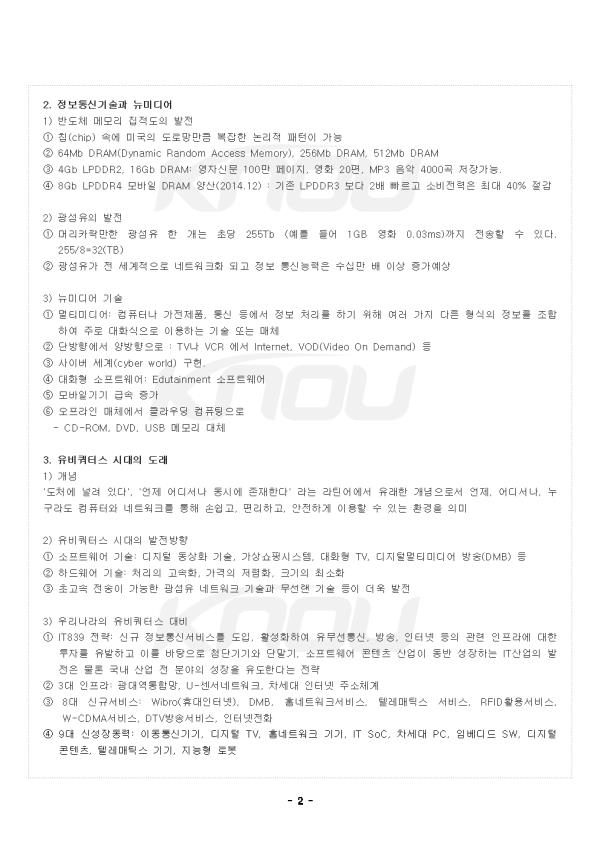 1. Á¤º¸È »çȸ¿Í Á¤º¸Çõ¸í 1) Á¤º¸È »çȸÀÇ ¹ßÀü ¨ç 1980³â´ë: Á¤º¸ÀÇ ½Ã´ë ¨è 1990³â´ë: Áö½ÄÀÇ ½Ã´ë ¨é 2000³â´ë: ÁöÇýÀÇ ½Ã´ë 2) ÀϺ»ÀÇ Á¤Ä¡°æÁ¦ÇÐÀÚÀÎ ¿À¸®°¡»ç °¡ÁîÈÄ¹Ì ±³¼ö´Â Á¤º¸»çȸ ÀÌÈÄÀÇ ¹ßÀü´Ü°è¸¦ Á¤º¸»çȸ, °íµµÁ¤º¸»çȸ·Î ºÐ·ù 3) °¡»ó°ú »çÀ̹ö ¨ç Áö±Ý±îÁö ½Ã°£°ú °ø°£ÀÇ Àå¾Ö·Î ÀÎÇÑ ¸ðµç Á¦ÇÑ»çÇ×µéÀÌ »ç¶óÁü ¨è °¡»ó±³À°(virtual education), °¡»ó±³½Ç(virtual class-room), e-·¯´×(e-Learning), »çÀ̹ö±³À°, »çÀ̹öÇб³(cyber school), °¡»ó¿©Çà(virtual travel), °¡»ó±Ù¹«(virtual work), °¡»ó¼îÇÎ(virtual shopping), »çÀ̹ö¼îÇÎ(cyber shopping) 2. Á¤º¸Åë½Å±â¼ú°ú ´º¹Ìµð¾î 1) ¹ÝµµÃ¼ ¸Þ¸ð¸® ÁýÀûµµÀÇ ¹ßÀü ¨ç Ĩ(chip) ¼Ó¿¡ ¹Ì±¹ÀÇ µµ·Î¸Á¸¸Å º¹ÀâÇÑ ³í¸®Àû ÆÐÅÏÀÌ °¡´É ¨è 64Mb DRAM(Dynamic Random Access Memory), 256Mb DRAM, 512Mb DRAM ¨é 4Gb LPDDR2, 16Gb DRAM: ¿µÀڽŹ® 100¸¸ ÆäÀÌÁö, ¿µÈ 20Æí, MP3 À½¾Ç 4000°î ÀúÀå°¡´É. ¨ê 8Gb LPDDR4 ¸ð¹ÙÀÏ DRAM ¾ç»ê(2014.12) : ±âÁ¸ LPDDR3 º¸´Ù 2¹è ºü¸£°í ¼ÒºñÀü·ÂÀº ÃÖ´ë 40% Àý°¨ - Áß·« - |