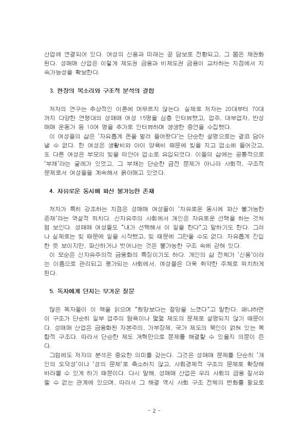 ±èÁÖÈñÀÇ ¡º·¹À̵ð Å©·¹µ÷¡»Àº ¼º¸Å¸Å »ê¾÷À» ´Ü¼øÈ÷ ¡®¹üÁË¡¯³ª ¡®µµ´öÀû Ÿ¶ô¡¯ÀÇ ¹®Á¦·Î º¸Áö ¾Ê°í, ÀÚº»ÁÖÀÇ¿Í ±ÝÀ¶È ¼Ó¿¡¼ ¾î¶»°Ô ±¸Á¶ÀûÀ¸·Î ÀÚ¸® Àâ¾Æ¿Ô´ÂÁö¸¦ ޱ¸Çϴ åÀÌ´Ù. ÀúÀÚ´Â ¼º¸Å¸Å¸¦ ÇϳªÀÇ »çȸ°æÁ¦Àû ¡®»ê¾÷¡¯À¸·Î ¹Ù¶óº»´Ù. Áï, ¼º¸Å¸Å´Â ÁöÇϼ¼°èÀÇ Àº¹ÐÇÑ °Å·¡¿¡ ¸Ó¹«¸£´Â °ÍÀÌ ¾Æ´Ï¶ó, Á¦µµ±Ç ±ÝÀ¶°ú ±ä¹ÐÇÏ°Ô ¿¬°áµÇ¾î ÀÖ´Â °Å´ëÇÑ ÃàÀûÀÇ ÀåÄ¡¶ó´Â °ÍÀÌ´Ù. Ã¥ÀÇ Á¦¸ñÀ̱⵵ ÇÑ ¡°·¹À̵ð Å©·¹µ÷¡±À̶ó´Â °³³äÀº ÀÌ·¯ÇÑ ºÐ¼®À» »ó¡ÇÑ´Ù. ¡®Å©·¹µ÷(credit)¡¯Àº ½Å¿ë, Áï ±ÝÀ¶ ÀÚº»ÁÖÀǰ¡ ÀÛµ¿ÇÏ´Â ±âº» ¿ø¸®¸¦ ÀǹÌÇÑ´Ù. ½Å¿ëÀº ´Ü¼øÇÑ °æÁ¦Àû °Å·¡¸¦ ³Ñ¾î Àΰ£ÀÇ °¡´É¼º°ú ¹Ì·¡¸¦ ´ãº¸·Î »ï´Â Á¦µµ´Ù. ÀúÀڴ ƯÈ÷ ¿©¼ºµéÀÌ ¡®½Å¿ë¡¯À̶ó´Â À̸§À¸·Î °ü¸®µÇ°í ÅëÁ¦µÇ´Â Çö½ÇÀ» ¤¾î³½´Ù. ¿©±â¼ ¼º¸Å¸Å ¿©¼ºµéÀº ´Ü¼øÈ÷ ¡°µ·À» ¹ö´Â ³ëµ¿ÀÚ¡±°¡ ¾Æ´Ï¶ó, ±ÝÀ¶Àû ºÎ並 ¶°¾ÈÀ½À¸·Î½á ´õ¿í Ãë¾àÇÑ À§Ä¡¿¡ ³õÀÌ°Ô µÈ´Ù. ´Ù½Ã ¸»ÇØ, ¿©¼ºµéÀº ÀÚÀ¯·Î¿î ÁÖüó·³ º¸ÀÌÁö¸¸ ½ÇÁ¦·Î´Â ºú°ú ±ÝÀ¶ °ü°è¸Á ¾È¿¡¼ ÆÄ»êÇÒ ¼öµµ, ¿ÏÀüÈ÷ ¹þ¾î³¯ ¼öµµ ¾ø´Â ¸ð¼øµÈ Á¸Àç·Î »ì¾Æ°£´Ù´Â °ÍÀÌ´Ù. 1. ¼ÒµæÀÌ ¾Æ´Ñ ¡®ºÎ䡯ÀÇ ¹®Á¦ ÀúÀÚ°¡ ÁÖ¸ñÇϴ ù ¹øÂ° ÁöÁ¡Àº ¼º¸Å¸Å¸¦ ¼ÒµæÀÇ ¹®Á¦°¡ ¾Æ´Ï¶ó ¡®ºÎä °ü°è¡¯ÀÇ ¹®Á¦·Î ÀçÇØ¼®ÇÏ´Â ºÎºÐÀÌ´Ù. ÈçÈ÷ ¼º¸Å¸Å ¿©¼ºµéÀÌ ¡°µ·À» ¹ú±â À§ÇØ ¾÷¼Ò¿¡ µé¾î°£´Ù¡±¶ó°í »ý°¢Çϱ⠽±Áö¸¸, ½ÇÁ¦·Î´Â ÀÌ¹Ì ºúÀ» Áö°í Àְųª ºúÀ» Áö°Ô µÇ´Â ±¸Á¶ ¼Ó¿¡ µé¾î°¡´Â °æ¿ì°¡ ¸¹´Ù. °í±Ý¸® »çä, Àϼö, ½Å¿ë´ëÃâÀº À̵éÀÇ »î¿¡ ±í¼÷ÀÌ ÆÄ°íµç´Ù. °á±¹ ¼º¸Å¸Å ¿©¼ºÀº ¡°µ·À» ¹ø´Ù¡±±âº¸´Ù ¡°ºÎ並 °±±â À§ÇØ °è¼Ó ÀÏÇÒ ¼ö¹Û¿¡ ¾ø´Â Á¸À硱°¡ µÈ´Ù. ÀúÀÚ´Â ÀÌ °úÁ¤À» ´Ü¼øÇÑ °³ÀÎÀû ¼±ÅÃÀ̳ª µµ´öÀû ½ÇÆÐ·Î º¸Áö ¾Ê´Â´Ù. ¿ÀÈ÷·Á ±ÝÀ¶ ½Ã½ºÅÛ°ú ¾÷ÁÖÀÇ ÀÌÇØ°ü°è, ±×¸®°í ¼º¸Å¸Å »ê¾÷À» ¹¬ÀÎÇÏ´Â ±¹°¡Àû Á¦µµ°¡ ¸Â¹°·Á ¸¸µé¾î³½ ±¸Á¶Àû ÀåÄ¡¶ó°í º»´Ù. °á±¹ ºÎä´Â ¼º¸Å¸Å ¿©¼ºµéÀ» »ê¾÷ ¼Ó¿¡ ¡®ºÙÀâ¾Æ µÎ´Â¡¯ °¡Àå °·ÂÇÑ ¼ö´ÜÀÌ´Ù. 2. ¼º¸Å¸Å »ê¾÷°ú ±ÝÀ¶ÀÇ ¿¬°á ÀÌ Ã¥ÀÌ µ¶Ã¢ÀûÀÎ ÀÌÀ¯´Â ¼º¸Å¸Å »ê¾÷°ú ±ÝÀ¶ÀÇ Á¢Á¡À» ³¯Ä«·Ó°Ô µå·¯³½´Ù´Â Á¡ÀÌ´Ù. ¼º¸Å¸Å´Â ÀüÅëÀûÀ¸·Î »çȸÀÇ À½Áö¿¡¼ ´Ù·ç¾îÁö´Â ÁÖÁ¦Áö¸¸, ÀúÀÚ´Â ±ÝÀ¶À̾߸»·Î ¼º¸Å¸Å »ê¾÷À» ¶°¹ÞÄ¡´Â ±Ùº»Àû µ¿·ÂÀÓÀ» º¸¿©ÁØ´Ù. ¿¹¸¦ µé¾î, ¾÷¼Ò´Â ´Ü¼øÈ÷ Çö±Ý °Å·¡¸¸À¸·Î ¿î¿µµÇÁö ¾Ê´Â´Ù. ¿©¼ºµéÀÌ ºúÀ» Áö°Ô ¸¸µå´Â ´ëºÎ¾÷ÀÚ, ½Å¿ë°Å·¡¸¦ ¸Å°³ÇÏ´Â »çä¾÷ÀÚ, ½ÉÁö¾î ÇÕ¹ýÀû ±ÝÀ¶±â°ü±îÁö ÀÌ »ê¾÷¿¡ ¿¬°áµÇ¾î ÀÖ´Ù. ¿©¼ºÀÇ ½Å¿ë°ú ¹Ì·¡´Â °ð ´ãº¸·Î ÀüȯµÇ°í, ±× ¸öÀº ä±ÇȵȴÙ. ¼º¸Å¸Å »ê¾÷Àº ÀÌ·¸°Ô Á¦µµ±Ç ±ÝÀ¶°ú ºñÁ¦µµ±Ç ±ÝÀ¶ÀÌ ±³Â÷ÇÏ´Â ÁöÁ¡¿¡¼ Áö¼Ó°¡´É¼ºÀ» È®º¸ÇÑ´Ù. 3. ÇöÀåÀÇ ¸ñ¼Ò¸®¿Í ±¸Á¶Àû ºÐ¼®ÀÇ °áÇÕ ÀúÀÚÀÇ ¿¬±¸´Â Ãß»óÀûÀÎ À̷п¡ ¸Ó¹«¸£Áö ¾Ê´Â´Ù. ½ÇÁ¦·Î ÀúÀÚ´Â 20´ëºÎÅÍ 70´ë±îÁö ´Ù¾çÇÑ ¿¬·É´ëÀÇ ¼º¸Å¸Å ¿©¼º 15¸íÀ» ½ÉÃþ ÀÎÅͺäÇß°í, ¾÷ÁÖ, ´ëºÎ¾÷ÀÚ, ¹Ý¼º¸Å¸Å ¿îµ¿°¡ µî 10¿© ¸íÀ» Ãß°¡·Î ÀÎÅͺäÇÏ¸ç »ý»ýÇÑ Áõ¾ðÀ» ¼öÁýÇß´Ù. ÀÌ ¿©¼ºµéÀÇ »îÀº ¡®ÀÚÀ¯·Ó°Ô µ·À» ¹ú·¯ µé¾î¿Ô´Ù¡¯´Â ´Ü¼øÇÑ ¼³¸íÀ¸·Î´Â °áÄÚ ´ã¾Æ³¾ ¼ö ¾ø´Ù. ÇÑ ¿©¼ºÀº »ýȰºñ¿Í ¾ÆÀÌ ¾çÀ°ºñ ¶§¹®¿¡ ºúÀ» Áö°í ¾÷¼Ò¿¡ µé¾î°¬°í, ¶Ç ´Ù¸¥ ¿©¼ºÀº ºÎ¸ðÀÇ ºúÀ» ¶°¾È¾Æ ¾÷¼Ò·Î À¯ÀԵǾú´Ù. À̵éÀÇ »î¿¡´Â °øÅëÀûÀ¸·Î ¡®ºÎ䡯¶ó´Â ±¼·¹°¡ ÀÖ¾ú°í, ±× ºÎä´Â ´Ü¼øÇÑ ±ÝÀü ¹®Á¦°¡ ¾Æ´Ï¶ó »çȸÀû, ±¸Á¶Àû ¹®Á¦·Î¼ ¿©¼ºµéÀ» °è¼ÓÇØ¼ ¿Ä¾Æ¸Å°í ÀÖ¾ú´Ù. 4. ÀÚÀ¯·Î¿î µ¿½Ã¿¡ ÆÄ»ê ºÒ°¡´ÉÇÑ Á¸Àç ÀúÀÚ°¡ ƯÈ÷ °Á¶ÇÏ´Â ÁöÁ¡Àº ¼º¸Å¸Å ¿©¼ºµéÀÌ ¡®ÀÚÀ¯·Î¿î µ¿½Ã¿¡ ÆÄ»ê ºÒ°¡´ÉÇÑ Á¸À硯¶ó´Â ¿ª¼³Àû À§Ä¡´Ù. ½ÅÀÚÀ¯ÁÖÀÇ »çȸ¿¡¼ °³ÀÎÀº ÀÚÀ¯·Î¿î ¼±ÅÃÀ» ÇÏ´Â °Íó·³ º¸ÀδÙ. ¼º¸Å¸Å ¿©¼ºµéµµ ¡°³»°¡ ¼±ÅÃÇØ¼ ÀÌ ÀÏÀ» ÇÑ´Ù¡±°í ¸»Çϱ⵵ ÇÑ´Ù. ±×·¯³ª ½ÇÁ¦·Î´Â ºú ¶§¹®¿¡ ÀÏÀ» ½ÃÀÛÇß°í, ºú ¶§¹®¿¡ ±×¸¸µÑ ¼öµµ ¾ø´Ù. ÀÚÀ¯·Ó°Ô ÁøÀÔÇÑ µí º¸ÀÌÁö¸¸, ÆÄ»êÇϰųª ¹þ¾î³ª´Â °ÍÀº ºÒ°¡´ÉÇÑ ±¸Á¶ ¼Ó¿¡ °¤Çô ÀÖ´Ù. ÀÌ ¸ð¼øÀº ½ÅÀÚÀ¯ÁÖÀÇÀû ±ÝÀ¶ÈÀÇ Æ¯Â¡À̱⵵ ÇÏ´Ù. °³ÀÎÀÇ »î Àüü°¡ ¡®½Å¿ë¡¯À̶ó´Â À̸§À¸·Î °ü¸®µÇ°í Æò°¡µÇ´Â »çȸ¿¡¼, ¿©¼ºµé