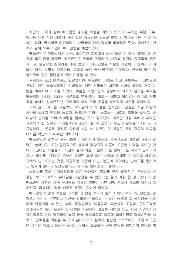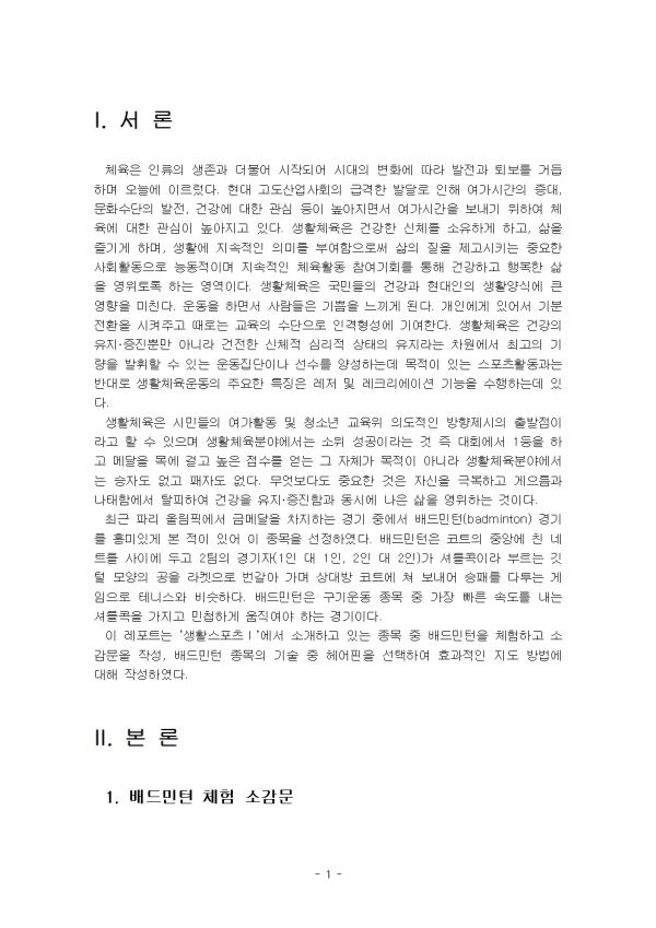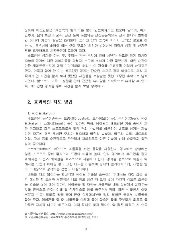 üÀ°Àº ÀηùÀÇ »ýÁ¸°ú ´õºÒ¾î ½ÃÀÛµÇ¾î ½Ã´ëÀÇ º¯È¿¡ µû¶ó ¹ßÀü°ú Å𺸸¦ °ÅµìÇÏ¸ç ¿À´Ã¿¡ À̸£·¶´Ù. Çö´ë °íµµ»ê¾÷»çȸÀÇ ±Þ°ÝÇÑ ¹ß´Þ·Î ÀÎÇØ ¿©°¡½Ã°£ÀÇ Áõ´ë, ¹®È¼ö´ÜÀÇ ¹ßÀü, °Ç°¿¡ ´ëÇÑ °ü½É µîÀÌ ³ô¾ÆÁö¸é¼ ¿©°¡½Ã°£À» º¸³»±â À§ÇÏ¿© üÀ°¿¡ ´ëÇÑ °ü½ÉÀÌ ³ô¾ÆÁö°í ÀÖ´Ù. »ýȰüÀ°Àº °Ç°ÇÑ ½Åü¸¦ ¼ÒÀ¯ÇÏ°Ô Çϰí, »îÀ» Áñ±â°Ô Çϸç, »ýȰ¿¡ Áö¼ÓÀûÀÎ Àǹ̸¦ ºÎ¿©ÇÔÀ¸·Î½á »îÀÇ ÁúÀ» Á¦°í½ÃŰ´Â Áß¿äÇÑ »çȸȰµ¿À¸·Î ´Éµ¿ÀûÀ̸ç Áö¼ÓÀûÀΠüÀ°È°µ¿ Âü¿©±âȸ¸¦ ÅëÇØ °Ç°Çϰí ÇູÇÑ »îÀ» ¿µÀ§Åä·Ï ÇÏ´Â ¿µ¿ªÀÌ´Ù. »ýȰüÀ°Àº ±¹¹ÎµéÀÇ °Ç°°ú Çö´ëÀÎÀÇ »ýȰ¾ç½Ä¿¡ Å« ¿µÇâÀ» ¹ÌÄ£´Ù. ¿îµ¿À» ÇÏ¸é¼ »ç¶÷µéÀº ±â»ÝÀ» ´À³¢°Ô µÈ´Ù. °³Àο¡°Ô ÀÖ¾î¼ ±âºÐÀüȯÀ» ½ÃÄÑÁÖ°í ¶§·Î´Â ±³À°ÀÇ ¼ö´ÜÀ¸·Î ÀΰÝÇü¼º¿¡ ±â¿©ÇÑ´Ù. »ýȰüÀ°Àº °Ç°ÀÇ À¯Áö¡¤ÁõÁø»Ó¸¸ ¾Æ´Ï¶ó °ÇÀüÇÑ ½ÅüÀû ½É¸®Àû »óÅÂÀÇ À¯Áö¶ó´Â Â÷¿ø¿¡¼ ÃÖ°íÀÇ ±â·®À» ¹ßÈÖÇÒ ¼ö ÀÖ´Â ¿îµ¿Áý´ÜÀ̳ª ¼±¼ö¸¦ ¾ç¼ºÇϴµ¥ ¸ñÀûÀÌ ÀÖ´Â ½ºÆ÷Ã÷Ȱµ¿°ú´Â ¹Ý´ë·Î »ýȰüÀ°¿îµ¿ÀÇ ÁÖ¿äÇÑ Æ¯Â¡Àº ·¹Àú ¹× ·¹Å©¸®¿¡ÀÌ¼Ç ±â´ÉÀ» ¼öÇàÇϴµ¥ ÀÖ´Ù. »ýȰüÀ°Àº ½Ã¹ÎµéÀÇ ¿©°¡È°µ¿ ¹× û¼Ò³â ±³À°À§ ÀǵµÀûÀÎ ¹æÇâÁ¦½ÃÀÇ Ãâ¹ßÁ¡À̶ó°í ÇÒ ¼ö ÀÖÀ¸¸ç »ýȰüÀ°ºÐ¾ß¿¡¼´Â ¼ÒÀ§ ¼º°øÀ̶ó´Â °Í Áï ´ëȸ¿¡¼ 1µîÀ» ÇÏ°í ¸Þ´ÞÀ» ¸ñ¿¡ °É°í ³ôÀº Á¡¼ö¸¦ ¾ò´Â ±× ÀÚü°¡ ¸ñÀûÀÌ ¾Æ´Ï¶ó »ýȰüÀ°ºÐ¾ß¿¡¼´Â ½ÂÀÚµµ ¾ø°í ÆÐÀÚµµ ¾ø´Ù. ¹«¾ùº¸´Ùµµ Áß¿äÇÑ °ÍÀº ÀÚ½ÅÀ» ±Øº¹ÇÏ°í °ÔÀ¸¸§°ú ³ªÅÂÇÔ¿¡¼ Å»ÇÇÇÏ¿© °Ç°À» À¯Áö¡¤ÁõÁøÇÔ°ú µ¿½Ã¿¡ ³ªÀº »îÀ» ¿µÀ§ÇÏ´Â °ÍÀÌ´Ù. ÃÖ±Ù ÆÄ¸® ¿Ã¸²ÇÈ¿¡¼ ±Ý¸Þ´ÞÀ» Â÷ÁöÇÏ´Â °æ±â Áß¿¡¼ ¹èµå¹ÎÅÏ(badminton) °æ±â¸¦ Èï¹ÌÀÖ°Ô º» ÀûÀÌ ÀÖ¾î ÀÌ Á¾¸ñÀ» ¼±Á¤ÇÏ¿´´Ù. ¹èµå¹ÎÅÏÀº ÄÚÆ®ÀÇ Áß¾Ó¿¡ Ä£ ³×Æ®¸¦ »çÀÌ¿¡ µÎ°í 2ÆÀÀÇ °æ±âÀÚ(1ÀÎ ´ë 1ÀÎ, 2ÀÎ ´ë 2ÀÎ)°¡ ¼ÅƲÄÛÀ̶ó ºÎ¸£´Â ±êÅÐ ¸ð¾çÀÇ °øÀ» ¶óÄÏÀ¸·Î ¹ø°¥¾Æ °¡¸ç »ó´ë¹æ ÄÚÆ®¿¡ ÃÄ º¸³»¾î ½ÂÆÐ¸¦ ´ÙÅõ´Â °ÔÀÓÀ¸·Î Å״Ͻº¿Í ºñ½ÁÇÏ´Ù. ¹èµå¹ÎÅÏÀº ±¸±â¿îµ¿ Á¾¸ñ Áß °¡Àå ºü¸¥ ¼Óµµ¸¦ ³»´Â ¼ÅƲÄÛÀ» °¡Áö°í ¹ÎøÇÏ°Ô ¿òÁ÷¿©¾ß ÇÏ´Â °æ±âÀÌ´Ù. ÀÌ ·¹Æ÷Æ®´Â ¡®»ýȰ½ºÆ÷Ã÷¥°¡¯¿¡¼ ¼Ò°³Çϰí ÀÖ´Â Á¾¸ñ Áß ¹èµå¹ÎÅÏÀ» üÇèÇÏ°í ¼Ò°¨¹®À» ÀÛ¼º, ¹èµå¹ÎÅÏ Á¾¸ñÀÇ ±â¼ú Áß Çì¾îÇÉÀ» ¼±ÅÃÇÏ¿© È¿°úÀûÀÎ Áöµµ ¹æ¹ý¿¡ ´ëÇØ ÀÛ¼ºÇÏ¿´´Ù. II. º» ·Ð 1. ¹èµå¹ÎÅÏ Ã¼Çè ¼Ò°¨¹® ÃÖ±Ù¿¡ °¡Á·°ú ÇÔ²² ¹èµå¹ÎÅÏ °æ±â¸¦ üÇèÇÒ ±âȸ°¡ ÀÖ¾ú´Ù. ¿ì¸®´Â ÁÖ¸» ¿ÀÈÄ, ¾ÆÆÄÆ® ³»¿¡ ÀÛÀº ½Ã¼³¿¡ ÀÚ¸® ÀâÀº ¹èµå¹ÎÅÏ ÄÚÆ®·Î ÇâÇß´Ù. ¾ÆÆÄÆ® ³»¿¡ ÀÛÀº ½Ã¼³ÀÌ ÀÖ´Ù. Æò¼Ò¿¡µµ ÀÌ¿ëÇÏ·Á´Â »ç¶÷µéÀÌ ¸¹¾Æ ¹ß±æÀ» µÇµ¹¸®°ï ÇÑ´Ù. ÀÛ¼ºÀÚ´Â °¡Á·°ú °°ÀÌ ¿ÀÈÄ ½Ã°£¿¡ ¹èµå¹ÎÅÏÀ» üÇèÇÏ¿´´Ù. ¹èµå¹ÎÅÏÀº µÞ¸¶´ç¿¡¼ Çϵç, Á¶Á÷ÀûÀΠŬ·´¿¡¼ Çϵç Áñ±æ ¼ö ÀÖ´Â °ÔÀÓÀÌ´Ù. °Ç°¿¡ ÁÁÀº Á¡À» µéÀÚ¸é, ¹èµå¹ÎÅÏÀº ±ÙÀ°À» Á¶ÀýÇϰí, ½ÉÀå°ú Ç÷°üÀÇ ¾çÈ£ÇÔÀ» ÁõÁø½Ã۰í, ºÒÇÊ¿äÇÑ Ä®·Î¸®¸¦ Å¿ö ¾ø¾Ø´Ù. ¹èµå¹ÎÅÏÀº Àú·ÅÇÑ °ÔÀÓÀÌ´Ù. Àåºñ¶ó°í ÇØºÁ¾ß ¶óÄÏ, ¼ÅƲ°ú ÁöÁö±âµÕ, ±×¸®°í ³îÀÌ °ø°£(Æò¸é)ÀÌ ÀüºÎÀÌ´Ù. Àü±¹ÀÇ ¸ðµç Áö¿ª»çȸ¿¡ ÇöÁö Ŭ·´µéÀÌ ÀÖ¾î ÀÌ¿ëÇÒ ¼ö ÀÖ´Ù. óÀ½¿¡´Â Á¶±Ý ¾î»öÇÏ°í ³¸¼³¾úÁö¸¸, ¹èµå¹ÎÅÏ ¶óÄÏÀ» Àâ°í ¼ÅƲÄÛÀ» ÁÖ°í¹ÞÀ¸¸ç ¿ì¸®´Â Á¡Á¡ ¸±·º½ºÇØÁö±â ½ÃÀÛÇß´Ù. ¸Å¹ø ¼ÅƲÄÛÀÌ ³×Æ®¸¦ ³Ñ¾î°¥ ¶§¸¶´Ù ¼·Î ´«ºûÀ» ¸¶ÁÖÄ¡¸ç ¹Ì¼Ò¸¦ Áö¾ú´Ù. °ÔÀÓÀº ÀÚ¿¬½º·´°Ô °æÀï¿¡¼ °ú°ÅÀÇ Áñ°Å¿î Ãß¾ïÀ» ¶°¿Ã¸®¸ç ÇϳªÀÇ ÀÀÁýµÈ ¾×¼ÇÀ¸·Î º¯Çذ¬´Ù. ¶§·Î´Â ¼Åø°í ¾îÀ̾ø´Â ½Ç¼ö·Î ¼ÅƲÄÛÀ» ³õÄ¡±â ÀϾ¥¿´Áö¸¸, ±×¶§¸¶´Ù ¿ì¸® ¸ðµÎ ¿ôÀ½À» ÅͶ߸®¸ç ¼·Î¸¦ °Ý·ÁÇß´Ù. °¡Á· °£ÀÇ °Å¸®´Â ¼ÅƲÄÛÀÌ ¿À°í°¨¿¡ µû¶ó Á¡Á¡ Á¼ÇôÁ³°í, ´Ü¼øÇÑ °ÔÀÓ ÀÌ»óÀÇ ½Ã°£À» º¸³»°í ÀÖÀ½À» ´À²¼´Ù. ¹èµå¹ÎÅÏÀ̶ó´Â ½ºÆ÷Ã÷´Â ¼·ÎÀÇ È£ÈíÀ» ¸ÂÃß°í, »ó´ë¹æÀÇ ´«Ä¡¸¦ º¸¸ç ŸÀ̹ÖÀ» ¸ÂÃß´Â °ÍÀÌ Áß¿äÇß´Ù. ÀÌ·¯ÇÑ °úÁ¤ ¼Ó¿¡¼ ¿ì¸®´Â ¼·Î¿¡ ´ëÇÑ ½Å·Ú¿Í ÀÇÁö¸¦ ´õ¿í °ø°íÈ÷ ÇÒ ¼ö ÀÖ¾ú´Ù. ´©±º°¡ ½Ç¼ö¸¦ ÇÏ´õ¶óµµ ´Ù±×ħº¸´Ù´Â ¿ôÀ½°ú °Ý·Á·Î »óȲÀ» ³Ñ±æ ¼ö ÀÖ¾ú´ø ÀÌ °æÇèÀº ¿ì¸® °¡Á·ÀÇ È¸ñÀ» ´Ù½Ã±Ý È®ÀÎÇÏ°Ô ÇØÁÖ´Â ±âȸ¿´´Ù. ¹èµå¹ÎÅÏÀÇ ½Ç·ÂÀº ÇÏ·ç