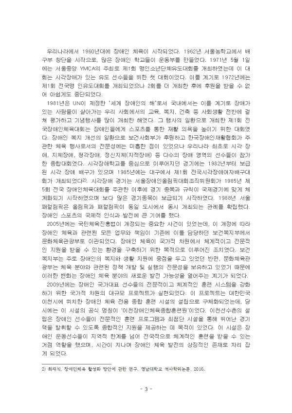 Àå¾ÖÀÎ ½ºÆ÷Ã÷´Â Àå¾ÖÀÎ °³ÀÎÀÌ Âü¿©ÇÏ¸ç ½ºÆ÷Ã÷ ȯ°æ¿¡¼ Àå¾ÖÀÎ °³ÀÎÀÇ Çʿ信 ¸Â°Ô Á¶Á¤µÈ ½ºÆ÷Ã÷·Î Á¤ÀÇÇÒ ¼ö ÀÖ´Ù. Àå¾ÖÀÎ ½ºÆ÷Ã÷´Â Àå¾Ö°¡ ¾ø´Â »ç¶÷À¸·Î »ì¾Æ°¥ ¼ö ÀÖ´Â Çå¹ýÀû ±Ç¸®ÀÌÀÚ, Àΰ£ÀÌ Ä¡·á¿Í ÀçȰÀ» ³Ñ¾î ´©¸± ¼ö ÀÖ´Â ¹®È»ýȰÀÌ´Ù. ¶ÇÇÑ, Àå¾ÖÀÎ ½ºÆ÷Ã÷´Â Àå¾ÖÀεéÀÇ ½Åü ±â´É Çâ»ó, ½É¸®Àû °Ç° ¹× »çȸÀû ÀûÀÀ·ÂÀ» ÁõÁø½Ãų ¼ö ÀÖ´Ù. ¼¼°è´ëÀü ÀÌÀü¿¡ ´ëºÎºÐÀÇ Àå¾ÖÀμ±¼öµéÀº Á¶Á÷ÈµÈ ½ºÆ÷Ã÷ °æ±â¿¡ Âü¿©±âȸ°¡ ¾ø¾ú´Ù. ´Ù¸¸, ÀϺÎÀÇ Àå¾ÖÀμ±¼öµéÀÌ ÀÏ¹Ý ¿Ã¸²ÇÈ´ëȸ¿¡ °³ÀÎÀûÀ¸·Î Âü°¡ÇÏ¿´´Ù. Á¶Á÷ÈµÈ ½ºÆ÷Ã÷°æ±â´ëȸ¿¡ óÀ½À¸·Î Âü¿©ÇÑ Àå¾ÖÀ¯ÇüÀº û°¢Àå¾ÖÀÎ(³ó¾ÆÀÎ)ÀÌ´Ù. Á¦1ȸ µ¥Çø²ÇÈ´ëȸ°¡ °³ÃÖµÈ ¿¬µµ´Â 1924³âÀÌ´Ù. ±¹Á¦³ó¾ÆÀνºÆ÷Ã÷À§¿øÈ¸(ICSD)´Â 1986³â ±¹Á¦Á¶Á¤À§¿øÈ¸(ICC)¿¡ Âü¿©ÇÏ¿´À¸³ª, IPC°¡ Çù¾à³»¿ëÀ» ÁöŰÁö ¾Ê¾Ò´Ù´Â ÀÌÀ¯·Î 1995³â Çï½ÌŰ ÃÑȸ¿¡¼ ¸¸ÀåÀÏÄ¡·Î Å»Å𸦠°áÁ¤ÇÏ¿´´Ù. ÆÐ·²¸²ÇÈÀ̶ó´Â¸íĪÀÌ °ø½ÄÀûÀÎ ´ëȸ¸íĪÀ¸·Î »ç¿ëµÈ ´ëȸ´Â 1988³â ¼¿ïÆÐ·²¸²ÇÈ´ëȸºÎÅÍÀÌ´Ù. ´ç½Ã 1960³â ·Î¸¶´ëȸ´Â ±¹Á¦½ºÅäÅ©¸Ç´õºô´ëȸ·ÎºÒ·ÈÀ¸¸ç, ÈÄ´ë¿¡ µé¾î Á¦1ȸ ÆÐ·²¸²ÇÈ´ëȸ·ÎÀÎÁ¤Çϰí ÀÖ´Ù. Àå¾ÖÀνºÆ÷Ã÷ÀÇ ¿ª»ç¸¦ À¯·´ Áß½ÉÀ¸·Î »ìÆìº¸¾ÒÀ» ¶§¿¡ Àå¾ÖÀνºÆ÷Ã÷´Â ¡®Ã»°¢Àå¾ÖÀÎÀÇ Á¶Á÷ÈµÈ ½ºÆ÷Ã÷ Âü¿©¡¯¸¦ ½ÃÀÛÀ¸·Î ¡®ÀçȰÀ» À§ÇÑ ½ºÆ÷Ã÷°æ±âÀÇ µµÀÔ¡¯, ¡®±¹Á¦½ºÅäÅ©¸Ç´õºô°æ±â´ëȸÀÇ ½ÃÀÛ¡¯, ¡®Àå¾ÖÀ¯Çüº° °æ±â´ÜüÀÇ µîÀå°ú Âü¿© Àå¾ÖÀ¯ÇüÀÇ È®´ë¡¯ ±×¸®°í ¡®ÆÐ·²¸²ÇÈ ½Ã´ëÀÇ ½ÃÀÛ¡¯ ¼øÀ¸·Î ¹ßÀüÇÑ °ÍÀ» È®ÀÎÇÒ ¼ö ÀÖ´Ù. ¿ì¸®³ª¶ó Àå¾ÖÀνºÆ÷Ã÷´Â Çѱ¹ÀüÀï Àü»óÀÚµéÀÇ ÀçȰÀÇ ¼ö´ÜÀ¸·Î ½ÃÀ۵Ǿú´Ù. UNÀÌ Á¦Á¤ÇÑ ¼¼°èÀå¾ÖÀÎÀÇ ÇØ ÀüÈÄ·Î Âü°¡¹üÀ§°¡ ¹Î°£¿µ¿ªÀ¸·Î È®´ëµÇ¾ú´Ù. ±×¸®°í 1988³â ¼¿ïÆÐ·²¸²ÇÈÀÇ ¼º°øÀûÀÎ °³ÃÖ ÀÌÈÄ·Î ¿ì¸®³ª¶ó Àå¾ÖÀνºÆ÷Ã÷´Â Àü±â¸¦ ¸ÂÀÌÇÏ¿´°í, 2005³â Àå¾ÖÀÎüÀ° ¾÷¹«°¡ º¸°Çº¹ÁöºÎ¿¡¼ ¹®ÈüÀ°°ü±¤ºÎ·Î À̰üµÊ¿¡ µû¶ó ±¹¹ÎüÀ°À¸·Î µµ¾àÇÏ¿´´Ù. ÀÌ ·¹Æ÷Æ®´Â Àå¾ÖÀνºÆ÷Ã÷ÀÇ ¿ª»ç¸¦ ÅÃÇÏ¿© ¼¼úÇϰí, Àå¾ÖÀνºÆ÷Ã÷ÀÇ ¹ßÀüÀ» ÅëÇÑ »çȸÀû Àǹ̿¡ ´ëÇÏ¿© ÀÚ½ÅÀÇ °ßÇØ¸¦ ¼¼úÇÏ¿´´Ù. II. º» ·Ð 1. Àå¾ÖÀνºÆ÷Ã÷ÀÇ ¿ª»ç 1) ±¹Á¦ Àå¾ÖÀνºÆ÷Ã÷ÀÇ ¿ª»ç Á¶Á÷ÈµÈ ½ºÆ÷Ã÷ °æ±â ´ëȸ¿¡ óÀ½À¸·Î Âü¿©ÇÑ Àå¾ÖÀ¯ÇüÀº û°¢Àå¾Ö¸¦ °¡Áø »ç¶÷µé, Áï ³ó¾ÆÀÎÀ¸·Î, À̵éÀÌ ½ºÆ÷Ã÷ ¿ª»ç¿¡¼ Áß¿äÇÑ ½ÃÀÛÁ¡À» ÀÌ·ç¾ú´Ù. À̵éÀº û°¢Àå¾Ö·Î ÀÎÇØ ¼ÒÅë°ú Á¤º¸ Á¢±Ù¼ºÀÌ Á¦ÇѵǴ ȯ°æ ¼Ó¿¡¼µµ ½ºÆ÷Ã÷¸¦ ÅëÇÑ »çȸÀû Ȱµ¿¿¡ Âü¿©Çϸç Àå¾ÖÀÎÀÇ ½ºÆ÷Ã÷ Âü¿© °¡´É¼ºÀ» ³Î¸® ¾Ë·È´Ù. ƯÈ÷, Á¦1ȸ µ¥Çø²ÇÈ(´ç½Ã ±¹Á¦³ó¾ÆÀÎ ½ºÆ÷Ã÷ °æ±â) ´ëȸ°¡ °³ÃÖµÈ ¿¬µµ´Â 1924³âÀ¸·Î, Àå¾ÖÀÎÀ» À§ÇÑ ±¹Á¦ ½ºÆ÷Ã÷ ´ëȸÀÇ ½ÃÃÊ·Î ±â·ÏµÇ°í ÀÖ´Ù. 9°³±¹ ³ó¾ÆÀÎ ¼±¼öµéÀÌ Âü°¡ÇØ Ã³À½À¸·Î ¿¸®´Â ±¹Á¦ ³ó¾ÆÀÎ ´ëȸ°¡ µÇ¾ú´Ù. ÀÌ ´ëȸ´Â û°¢Àå¾ÖÀεéÀÌ ¸ð¿© ½ºÆ÷Ã÷¸¦ ¸Å°³·Î ±¹Á¦ÀûÀÎ ±³·ù¿Í ÈÇÕÀ» µµ¸ðÇÑ ¿ª»çÀûÀÎ »ç°ÇÀ¸·Î, ÀÌÈÄ Àå¾ÖÀÎ ½ºÆ÷Ã÷ÀÇ ¹ßÀü¿¡ Áß´ëÇÑ ¿µÇâÀ» ¹ÌÃÆ´Ù. ±¹Á¦³ó¾ÆÀνºÆ÷Ã÷À§¿øÈ¸(International Committee of Sports for the Deaf, ICSD)´Â û°¢Àå¾ÖÀÎÀ» À§ÇÑ ½ºÆ÷Ã÷ ¹ßÀü°ú Á¶Á÷Àû °ü¸®¸¦ ´ã´çÇÏ´Â ¼¼°èÀûÀÎ ±â°üÀ¸·Î, Àå¾Ö À¯Çü¿¡ µû¸¥ ½ºÆ÷Ã÷ Á¶Á÷ÀÇ Ã¼°èÀû È®¸³¿¡ ±â¿©ÇؿԴÙ. ±¸Æ®¸¸(Ludwig Guttmann) ¹Ú»ç´Â 1948³â Àü»ó Àå¾ÖÀÎÀ» À§ÇÑ ½ºÅäÅ©¸Ç´õºô(Stoke Mandeville) °æ±â¸¦ °³ÃÖÇß°í, ¿À´Ã³¯ ÆÐ·²¸²ÇÈÀ¸·Î ¹ßÀüÇß´Ù. ÆÐ·²¸²ÇÈÀº 1960³â ÀÌÅ»¸®¾Æ ·Î¸¶¿¡¼ ù °ø½Ä ´ëȸ¸¦ °³ÃÖÇϸç, Àå¾ÖÀÎ ¼±¼öµé¿¡°Ô ÀÚ½ÅÀÇ ´É·ÂÀ» ¼¼°è¿¡ º¸¿©ÁÙ ±âȸ¸¦ Á¦°øÇß´Ù. 1986³â¿¡´Â ÀÌ À§¿øÈ¸°¡ ±¹Á¦Á¶Á¤À§¿øÈ¸(International Coordinating Committee, ICC)¿¡ Âü¿©ÇÏ¸ç ´Ù¸¥ Àå¾Ö À¯ÇüÀ» À§ÇÑ ±¹Á¦ ½ºÆ÷Ã÷ ´Üüµé°ú Çù·ÂÇÏ·Á´Â ³ë·ÂÀ» º¸¿©ÁÖ¾ú´Ù. ±×·¯³ª ÀÌÈÄ Çù·Â °úÁ¤¿¡¼ ±¹Á¦ÆÐ·²¸²ÇÈÀ§¿øÈ¸(IPC)°¡ Çù¾à ³»¿ëÀ» ÁؼöÇÏÁö ¾Ê¾Ò´Ù´Â ÀÌÀ¯·Î, ICSD´Â 1995³â Çï½ÌŰ¿¡¼ ¿¸° ÃÑȸ¿¡¼ ¸¸ÀåÀÏÄ¡·Î Å»Å𸦠°áÁ¤ÇÏ¿´´Ù. À̴ û°¢Àå¾ÖÀÎ ½ºÆ÷Ã÷ ´Üü°¡ µ¶¸³ÀûÀ¸·Î Ȱµ¿À» À¯ÁöÇϰí, ÀÚüÀûÀÎ ´ëȸ¸¦ Áö¼ÓÀûÀ¸·Î ¿î¿µÇÏ¸é¼ ±× Á¤Ã¼¼ºÀ» ÁöÄѳª°¡±â À§ÇØ ÀÌ·ç¾îÁø Á¶Ä¡¿´´Ù. ÇÑÆí, Àå¾ÖÀÎ ¿Ã¸²ÇÈ ´ëȸÀÇ ¸íĪÀÎ 'ÆÐ·²¸²ÇÈ'À̶ó´Â À̸§ÀÌ °ø½ÄÀûÀÎ ´ëȸ ¸íĪÀ¸·Î óÀ½ »ç¿ëµ