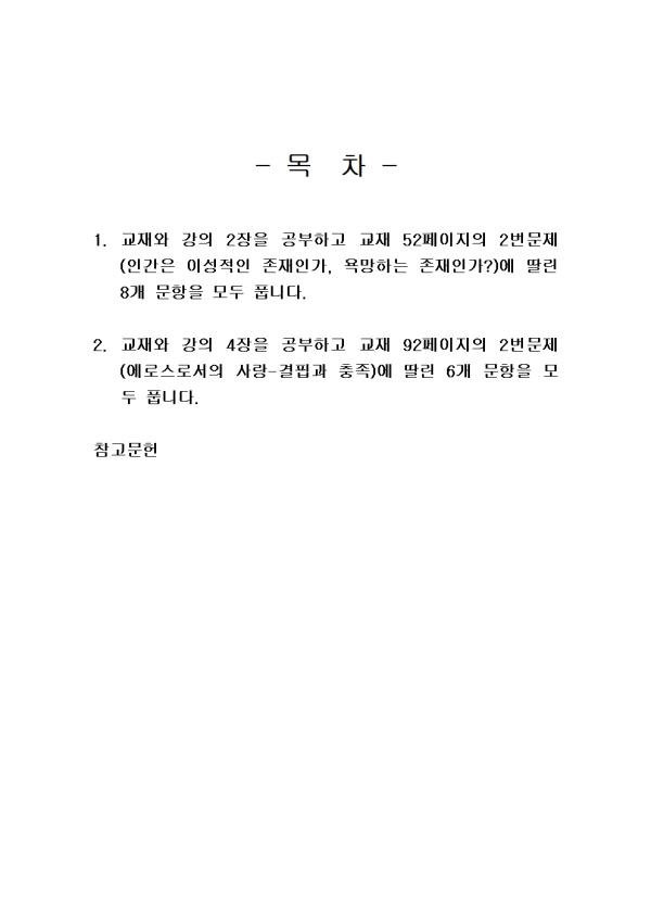 2. ±³Àç¿Í °ÀÇ 4ÀåÀ» °øºÎÇÏ°í ±³Àç 92ÆäÀÌÁöÀÇ 2¹ø¹®Á¦ (¿¡·Î½º·Î¼ÀÇ »ç¶û-°áÇ̰ú ÃæÁ·)¿¡ µþ¸° 6°³ ¹®Ç×À» ¸ðµÎ DZ´Ï´Ù. ÃּҺз® Á¦ÇÑÀº ¾øÀ¸¸ç ÃÖ´ë A4Áö 3ÂʱîÁö ÀÛ¼ºÇÒ ¼ö ÀÖ½À´Ï´Ù. - ¸ñ Â÷ - 1. ±³Àç¿Í °ÀÇ 2ÀåÀ» °øºÎÇÏ°í ±³Àç 52ÆäÀÌÁöÀÇ 2¹ø¹®Á¦ (Àΰ£Àº À̼ºÀûÀÎ Á¸ÀçÀΰ¡, ¿å¸ÁÇÏ´Â Á¸ÀçÀΰ¡?)¿¡ µþ¸° 8°³ ¹®Ç×À» ¸ðµÎ DZ´Ï´Ù. 2. ±³Àç¿Í °ÀÇ 4ÀåÀ» °øºÎÇÏ°í ±³Àç 92ÆäÀÌÁöÀÇ 2¹ø¹®Á¦ (¿¡·Î½º·Î¼ÀÇ »ç¶û-°áÇ̰ú ÃæÁ·)¿¡ µþ¸° 6°³ ¹®Ç×À» ¸ðµÎ DZ´Ï´Ù. Âü°í¹®Çå ** ÇÔ²² Á¦°øµÇ´Â Âü°íÀÚ·á ÇÑ±ÛÆÄÀÏ ** 1. ±³Àç¿Í °ÀÇ 2ÀåÀ» °øºÎÇÏ°í ±³Àç 52ÆäÀÌÁöÀÇ 2¹ø¹®Á¦.hwp 2. ±³Àç¿Í °ÀÇ 2ÀåÀ» °øºÎÇÏ°í ±³Àç 52ÆäÀÌÁöÀÇ 2¹ø¹®Á¦(2).hwp 3. ±³Àç¿Í °ÀÇ 2ÀåÀ» °øºÎÇÏ°í ±³Àç 52ÆäÀÌÁöÀÇ 2¹ø¹®Á¦(3).hwp 4. ±³Àç¿Í °ÀÇ 4ÀåÀ» °øºÎÇÏ°í ±³Àç 92ÆäÀÌÁöÀÇ 2¹ø¹®Á¦.hwp 5. ±³Àç¿Í °ÀÇ 4ÀåÀ» °øºÎÇÏ°í ±³Àç 92ÆäÀÌÁöÀÇ 2¹ø¹®Á¦(2).hwp 6. ±³Àç¿Í °ÀÇ 4ÀåÀ» °øºÎÇÏ°í ±³Àç 92ÆäÀÌÁöÀÇ 2¹ø¹®Á¦(3).hwp ÀÚ·á³»¿ë ¹Ì¸®º¸±â
