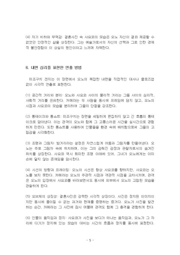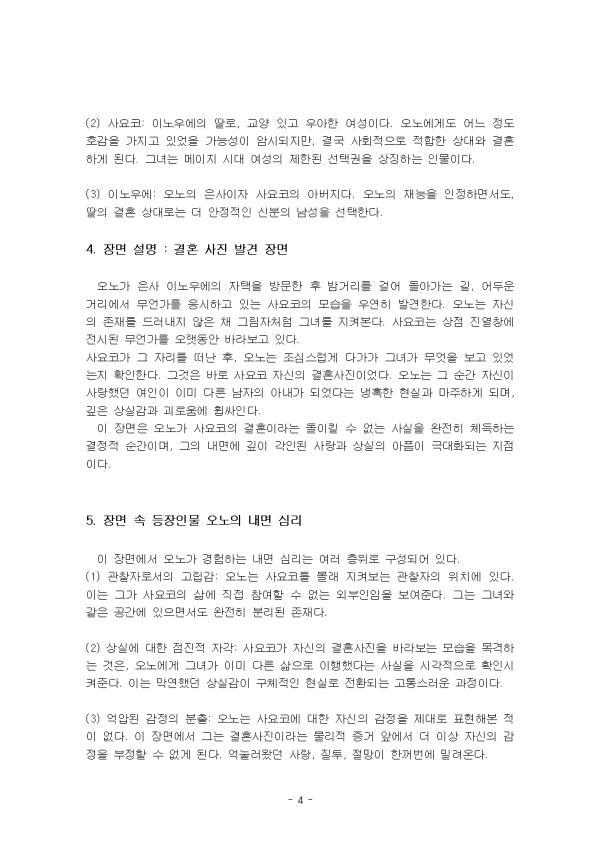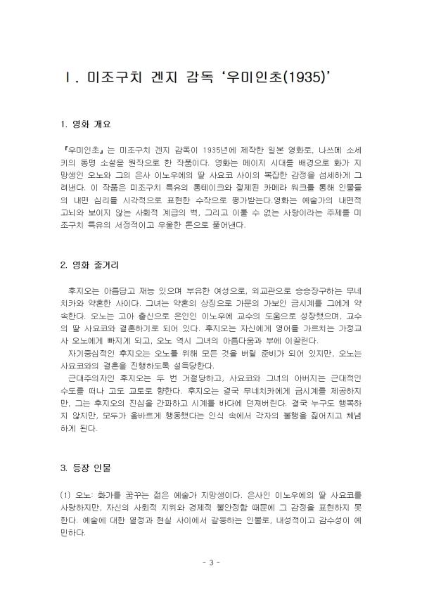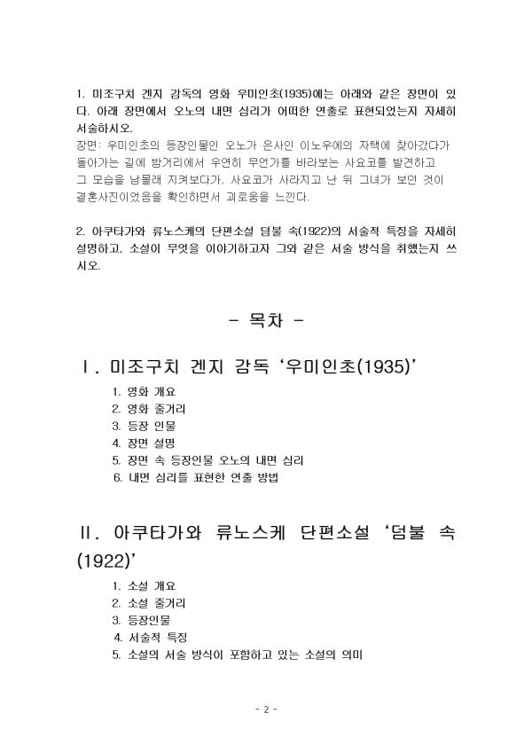 Àå¸é: ¿ì¹ÌÀÎÃÊÀÇ µîÀåÀι°ÀÎ ¿À³ë°¡ Àº»çÀÎ À̳ë¿ì¿¡ÀÇ ÀÚÅÿ¡ ã¾Æ°¬´Ù°¡ µ¹¾Æ°¡´Â ±æ¿¡ ¹ã°Å¸®¿¡¼ ¿ì¿¬È÷ ¹«¾ð°¡¸¦ ¹Ù¶óº¸´Â »ç¿äÄÚ¸¦ ¹ß°ßÇÏ°í ±× ¸ð½ÀÀ» ³²¸ô·¡ ÁöÄѺ¸´Ù°¡, »ç¿äÄÚ°¡ »ç¶óÁö°í ³ µÚ ±×³à°¡ º¸´ø °ÍÀÌ °áÈ¥»çÁøÀ̾úÀ½À» È®ÀÎÇÏ¸é¼ ±«·Î¿òÀ» ´À³¤´Ù. 2. ¾ÆÄퟰ¡¿Í ·ù³ë½ºÄÉÀÇ ´ÜÆí¼Ò¼³ ´ýºÒ ¼Ó(1922)ÀÇ ¼¼úÀû Ư¡À» ÀÚ¼¼È÷ ¼³¸íÇϰí, ¼Ò¼³ÀÌ ¹«¾ùÀ» À̾߱âÇϰíÀÚ ±×¿Í °°Àº ¼¼ú ¹æ½ÄÀ» ÃëÇß´ÂÁö ¾²½Ã¿À. - ¸ñÂ÷ - ¥°. ¹ÌÁ¶±¸Ä¡ °ÕÁö °¨µ¶ ¡®¿ì¹ÌÀÎÃÊ(1935)¡¯ 1. ¿µÈ °³¿ä 2. ¿µÈ ÁٰŸ® 3. µîÀå Àι° 4. Àå¸é ¼³¸í 5. Àå¸é ¼Ó µîÀåÀι° ¿À³ëÀÇ ³»¸é ½É¸® 6. ³»¸é ½É¸®¸¦ Ç¥ÇöÇÑ ¿¬Ãâ ¹æ¹ý Âü°í¹®Çå ¥±. ¾ÆÄퟰ¡¿Í ·ù³ë½ºÄÉ ´ÜÆí¼Ò¼³ ¡®´ýºÒ ¼Ó(1922)¡¯ 1. ¼Ò¼³ °³¿ä 2. ¼Ò¼³ ÁٰŸ® 3. µîÀåÀι° 4. ¼¼úÀû Ư¡ 5. ¼Ò¼³ÀÇ ¼¼ú ¹æ½ÄÀÌ Æ÷ÇÔÇϰí ÀÖ´Â ¼Ò¼³ÀÇ ÀÇ¹Ì Âü°í¹®Çå ** ÇÔ²² Á¦°øµÇ´Â Âü°íÀÚ·áÆÄÀÏ ** 1. ¹ÌÁ¶±¸Ä¡ °ÕÁö °¨µ¶ÀÇ ¿µÈ_¿ì¹ÌÀÎÃÊ º¸°í¼.hwp 2. ¹ÌÁ¶±¸Ä¡ °ÕÁö °¨µ¶ÀÇ ¿µÈ_¿ì¹ÌÀÎÃÊ º¸°í¼2.hwp 3. ¹ÌÁ¶±¸Ä¡ °ÕÁö °¨µ¶ÀÇ ¿µÈ_¿ì¹ÌÀÎÃÊ º¸°í¼3.hwp 4. ¹ÌÁ¶±¸Ä¡ °ÕÁö °¨µ¶ÀÇ ¿µÈ_¿ì¹ÌÀÎÃÊ¿¡ ´ëÇÏ¿©.hwp 5. ¹ÌÁ¶±¸Ä¡ °ÕÁö °¨µ¶ÀÇ ¿µÈ_¿ì¹ÌÀÎÃÊ¿¡ ´ëÇÏ¿©2.hwp 6. ¾ÆÄퟰ¡¿Í ·ù³ë½ºÄÉ_´ýºí¼Ó_º¸°í¼.hwp 7. ¾ÆÄퟰ¡¿Í ·ù³ë½ºÄÉ_´ýºí¼Ó_º¸°í¼2.hwp 8. ¾ÆÄퟰ¡¿Í ·ù³ë½ºÄÉ_´ýºí¼Ó_º¸°í¼3.hwp 9. ¾ÆÄퟰ¡¿Í ·ù³ë½ºÄÉ_´ýºí¼Ó¿¡ ´ëÇÏ¿©.hwp 10.¾ÆÄퟰ¡¿Í ·ù³ë½ºÄÉ_´ýºí¼Ó¿¡ ´ëÇÏ¿©2.hwp 11. ¾ÆÄퟰ¡¿Í ·ù³ë½ºÄÉ_´ýºí¼Ó¿¡ ´ëÇÏ¿©3.hwp ÀÚ·á³»¿ë ¹Ì¸®º¸±â