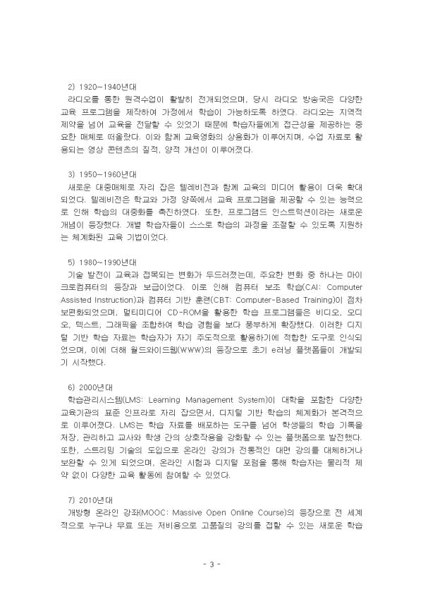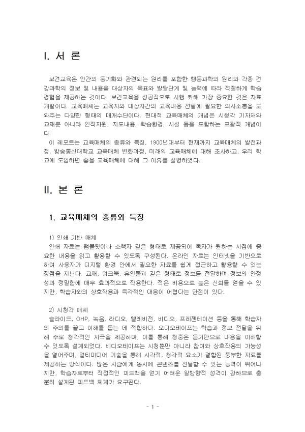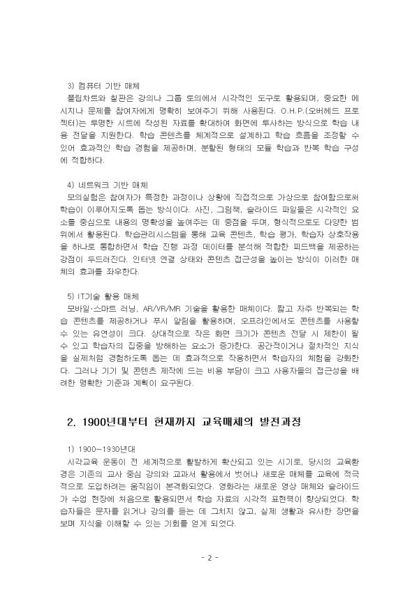 º¸°Ç±³À°Àº Àΰ£ÀÇ µ¿±âÈ¿Í °ü·ÃµÇ´Â ¿ø¸®¸¦ Æ÷ÇÔÇÑ Çൿ°úÇÐÀÇ ¿ø¸®¿Í °¢Á¾ °Ç°°úÇÐÀÇ Á¤º¸ ¹× ³»¿ëÀ» ´ë»óÀÚÀÇ ¸ñÇ¥¿Í ¹ß´Þ´Ü°è ¹× ´É·Â¿¡ µû¶ó ÀûÀýÇÏ°Ô ÇнÀ°æÇèÀ» Á¦°øÇÏ´Â °ÍÀÌ´Ù. º¸°Ç±³À°À» ¼º°øÀûÀ¸·Î ½ÃÇà À§ÇØ °¡Àå Áß¿äÇÑ °ÍÀº ÀÚ·á °³¹ßÀÌ´Ù. ±³À°¸Åü´Â ±³À°ÀÚ¿Í ´ë»óÀÚ°£ÀÇ ±³À°³»¿ë Àü´Þ¿¡ ÇÊ¿äÇÑ ÀÇ»ç¼ÒÅëÀ» µµ¿ÍÁÖ´Â ´Ù¾çÇÑ ÇüÅÂÀÇ ¸Å°³¼ö´ÜÀÌ´Ù. Çö´ëÀû ±³À°¸ÅüÀÇ °³³äÀº ½Ãû°¢ ±âÀÚÀç¿Í ±³Àç»Ó ¾Æ´Ï¶ó ÀÎÀûÀÚ¿ø, Áöµµ³»¿ë, ÇнÀȯ°æ, ½Ã¼³ µîÀ» Æ÷ÇÔÇÏ´Â Æ÷°ýÀû °³³äÀÌ´Ù. ÀÌ ·¹Æ÷Æ®´Â ±³À°¸ÅüÀÇ Á¾·ù¿Í Ư¡, 1900³â´ëºÎÅÍ ÇöÀç±îÁö ±³À°¸ÅüÀÇ ¹ßÀü°úÁ¤, ¹æ¼ÛÅë½Å´ëÇб³ ±³À°¸Åü º¯È°úÁ¤, ¹Ì·¡ÀÇ ±³À°¸Åü¿¡ ´ëÇØ Á¶»çÇϰí, ¿ì¸® Çб³¿¡ µµÀÔÇϸé ÁÁÀ» ±³À°¸Åü¿¡ ´ëÇØ ±× ÀÌÀ¯¸¦ ¼³¸íÇÏ¿´´Ù. II. º» ·Ð 1. ±³À°¸ÅüÀÇ Á¾·ù¿Í Ư¡ 1) Àμ⠱â¹Ý ¸Åü Àμâ ÀÚ·á´Â ÆÔÇø´À̳ª ¼ÒÃ¥ÀÚ °°Àº ÇüÅ·ΠÁ¦°øµÇ¾î µ¶ÀÚ°¡ ¿øÇÏ´Â ½ÃÁ¡¿¡ Áß¿äÇÑ ³»¿ëÀ» Àаí Ȱ¿ëÇÒ ¼ö ÀÖµµ·Ï ±¸¼ºµÈ´Ù. ¿Â¶óÀÎ ÀÚ·á´Â ÀÎÅͳÝÀ» ±â¹ÝÀ¸·Î ÇÏ¿© »ç¿ëÀÚ°¡ µðÁöÅРȯ°æ ¾È¿¡¼ ÇÊ¿äÇÑ ÀڷḦ ½±°Ô Á¢±ÙÇϰí Ȱ¿ëÇÒ ¼ö ÀÖ´Â ÀåÁ¡À» Áö´Ñ´Ù. ±³Àç, ¿öÅ©ºÏ, À¯Àι°°ú °°Àº ÇüÅ·ΠÁ¤º¸¸¦ Àü´ÞÇϸç Á¤º¸ÀÇ ¾ÈÁ¤¼º°ú Á¤¹ÐÇÔ¿¡ ¸Å¿ì È¿°úÀûÀ¸·Î ÀÛ¿ëÇÑ´Ù. ÀûÀº ºñ¿ëÀ¸·Î ³ôÀº ½Å·Ú¸¦ ¾òÀ» ¼ö ÀÖÁö¸¸, ÇнÀÀÚ¿ÍÀÇ »óÈ£ÀÛ¿ë°ú Áï°¢ÀûÀÎ ´ëÀÀÀÌ ¾î·Æ´Ù´Â ´ÜÁ¡ÀÌ ÀÖ´Ù. 2) ½Ãû°¢ ¸Åü ½½¶óÀ̵å, OHP, ³ìÀ½, ¶óµð¿À, ÅÚ·¹ºñÀü, ºñµð¿À, ÇÁ·¹Á¨Å×ÀÌ¼Ç µîÀ» ÅëÇØ ÇнÀÀÚÀÇ ÁÖÀǸ¦ ²ø°í ÀÌÇØ¸¦ µ½´Â µ¥ ÀûÇÕÇÏ´Ù. ¿Àµð¿ÀÅ×ÀÌÇÁ´Â ÇнÀ°ú Á¤º¸ Àü´ÞÀ» À§ÇØ ÁַΠû°¢ÀûÀÎ ÀÚ±ØÀ» Á¦°øÇϸç, À̸¦ ÅëÇØ ûÁßÀº µè±â¸¸À¸·Î ³»¿ëÀ» ÀÌÇØÇÒ ¼ö ÀÖµµ·Ï ¼³°èµÇ¾ú´Ù. ºñµð¿ÀÅ×ÀÌÇÁ´Â ½Ãû»Ó¸¸ ¾Æ´Ï¶ó Âü¿©¿Í »óÈ£ÀÛ¿ëÀÇ °¡´É¼ºÀ» ¿¾îÁÖ¸ç, ¸ÖƼ¹Ìµð¾î ±â¼úÀ» ÅëÇØ ½Ã°¢Àû, û°¢Àû ¿ä¼Ò°¡ °áÇÕµÈ Ç³ºÎÇÑ ÀڷḦ Á¦°øÇÏ´Â ¹æ½ÄÀÌ´Ù. ¸¹Àº »ç¶÷¿¡°Ô µ¿½Ã¿¡ ÄÜÅÙÃ÷¸¦ Àü´ÞÇÒ ¼ö ÀÖ´Â ´É·ÂÀÌ ¶Ù¾î³ªÁö¸¸, ÇнÀÀڷκÎÅÍ Á÷Á¢ÀûÀÎ Çǵå¹éÀ» ¾ò±â ¾î·Á¿î ÀϹæÇâÀû ¼º°ÝÀÌ °ÇÏ¹Ç·Î ÃæºÐÈ÷ ¼³°èµÈ Çǵå¹é ü°è°¡ ¿ä±¸µÈ´Ù. 3) ÄÄÇ»ÅÍ ±â¹Ý ¸Åü Çø³Â÷Æ®¿Í Ä¥ÆÇÀº °Àdzª ±×·ì ÅäÀÇ¿¡¼ ½Ã°¢ÀûÀÎ µµ±¸·Î Ȱ¿ëµÇ¸ç, Áß¿äÇÑ ¸Þ½ÃÁö³ª ¹®Á¦¸¦ Âü¿©ÀÚ¿¡°Ô ¸íÈ®È÷ º¸¿©ÁÖ±â À§ÇØ »ç¿ëµÈ´Ù. O.H.P.(¿À¹öÇìµå ÇÁ·ÎÁ§ÅÍ)´Â Åõ¸íÇÑ ½ÃÆ®¿¡ ÀÛ¼ºµÈ ÀڷḦ È®´ëÇÏ¿© ȸ鿡 Åõ»çÇÏ´Â ¹æ½ÄÀ¸·Î ÇнÀ ³»¿ë Àü´ÞÀ» Áö¿øÇÑ´Ù. ÇнÀ ÄÜÅÙÃ÷¸¦ ü°èÀûÀ¸·Î ¼³°èÇϰí ÇнÀ È帧À» Á¶Á¤ÇÒ ¼ö ÀÖ¾î È¿°úÀûÀÎ ÇнÀ °æÇèÀ» Á¦°øÇϸç, ºÐÇÒµÈ ÇüÅÂÀÇ ¸ðµâ ÇнÀ°ú ¹Ýº¹ ÇнÀ ±¸¼º¿¡ ÀûÇÕÇÏ´Ù. 4) ³×Æ®¿öÅ© ±â¹Ý ¸Åü ¸ðÀǽÇÇèÀº Âü¿©ÀÚ°¡ ƯÁ¤ÇÑ °úÁ¤À̳ª »óȲ¿¡ Á÷Á¢ÀûÀ¸·Î °¡»óÀ¸·Î Âü¿©ÇÔÀ¸·Î½á ÇнÀÀÌ ÀÌ·ç¾îÁöµµ·Ï µ½´Â ¹æ½ÄÀÌ´Ù. »çÁø, ±×¸²Ã¥, ½½¶óÀÌµå ÆÄÀϵéÀº ½Ã°¢ÀûÀÎ ¿ä¼Ò¸¦ Áß½ÉÀ¸·Î ³»¿ëÀÇ ¸íÈ®¼ºÀ» ³ô¿©ÁÖ´Â µ¥ ÁßÁ¡À» µÎ¸ç, Çü½ÄÀûÀ¸·Îµµ ´Ù¾çÇÑ ¹üÀ§¿¡¼ Ȱ¿ëµÈ´Ù. ÇнÀ°ü¸®½Ã½ºÅÛÀ» ÅëÇØ ±³À° ÄÜÅÙÃ÷, ÇнÀ Æò°¡, ÇнÀÀÚ »óÈ£ÀÛ¿ëÀ» Çϳª·Î ÅëÇÕÇÏ¸é¼ ÇнÀ ÁøÇà °úÁ¤ µ¥ÀÌÅ͸¦ ºÐ¼®ÇØ ÀûÇÕÇÑ Çǵå¹éÀ» Á¦°øÇÏ´Â °Á¡ÀÌ µÎµå·¯Áø´Ù. ÀÎÅÍ³Ý ¿¬°á »óÅÂ¿Í ÄÜÅÙÃ÷ Á¢±Ù¼ºÀ» ³ôÀÌ´Â ¹æ½ÄÀÌ ÀÌ·¯ÇÑ ¸ÅüÀÇ È¿°ú¸¦ Á¿ìÇÑ´Ù. 5) IT±â¼ú Ȱ¿ë ¸Åü ¸ð¹ÙÀÏ¡¤½º¸¶Æ® ·¯´×, AR/VR/MR ±â¼úÀ» Ȱ¿ëÇÑ ¸ÅüÀÌ´Ù. ª°í ÀÚÁÖ ¹Ýº¹µÇ´Â ÇнÀ ÄÜÅÙÃ÷¸¦ Á¦°øÇϰųª Ǫ½Ã ¾Ë¸²À» Ȱ¿ëÇϸç, ¿ÀÇÁ¶óÀο¡¼µµ ÄÜÅÙÃ÷¸¦ »ç¿ëÇÒ ¼ö ÀÖ´Â À¯¿¬¼ºÀÌ Å©´Ù. »ó´ëÀûÀ¸·Î ÀÛÀº ȸé Å©±â°¡ ÄÜÅÙÃ÷ Àü´Þ ½Ã Á¦ÇÑÀÌ µÉ ¼ö ÀÖ°í ÇнÀÀÚÀÇ ÁýÁßÀ» ¹æÇØÇÏ´Â ¿ä¼Ò°¡ Áõ°¡ÇÑ´Ù. °ø°£ÀûÀ̰ųª ÀýÂ÷ÀûÀÎ Áö½ÄÀ» ½ÇÁ¦Ã³·³ °æÇèÇϵµ·Ï µ½´Â µ¥ È¿°úÀûÀ¸·Î ÀÛ¿ëÇÏ¸é¼ ÇнÀÀÚÀÇ Ã¼ÇèÀ» °ÈÇÑ´Ù. ±×·¯³ª ±â±â ¹× ÄÜÅÙÃ÷ Á¦ÀÛ¿¡ µå´Â ºñ¿ë ºÎ´ãÀÌ Å©°í »ç¿ëÀÚµéÀÇ Á¢±Ù¼ºÀ» ¹è·ÁÇÑ ¸íÈ®ÇÑ ±âÁذú °èȹÀÌ ¿ä±¸µÈ´Ù. 2. 1900³â´ëºÎÅÍ ÇöÀç±îÁö ±³À°¸ÅüÀÇ ¹ßÀü°úÁ¤ 1) 1900~1930³â´ë ½Ã°¢±³À° ¿îµ¿ÀÌ Àü ¼¼°èÀûÀ¸·Î Ȱ¹ßÇÏ°Ô È®»êµÇ°í ÀÖ´Â ½Ã±â·Î, ´ç½ÃÀÇ ±³À°È¯°æÀº ±âÁ¸ÀÇ ±³»ç Á᫐ °ÀÇ¿Í ±³°ú¼ Ȱ¿ë¿¡¼ ¹þ¾î³ª »õ·Î¿î ¸Åü¸¦ ±³À°¿¡ Àû±ØÀûÀ¸·Î µµÀÔÇÏ·Á´Â ¿òÁ÷ÀÓÀÌ º