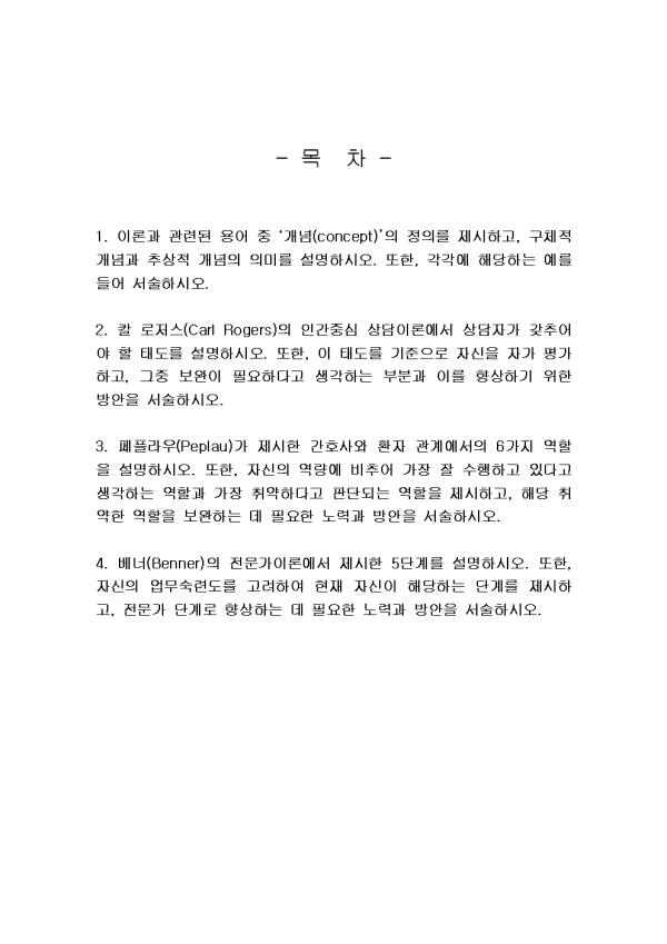1. À̷аú °ü·ÃµÈ ¿ë¾î Áß ¡®°³³ä(concept)¡¯ÀÇ Á¤ÀǸ¦ Á¦½ÃÇϰí, ±¸Ã¼Àû °³³ä°ú Ãß»óÀû °³³äÀÇ Àǹ̸¦ ¼³¸íÇϽÿÀ. ¶ÇÇÑ, °¢°¢¿¡ ÇØ´çÇÏ´Â ¿¹¸¦ µé¾î ¼¼úÇϽÿÀ. 2. Ä® ·ÎÀú½º(Carl Rogers)ÀÇ Àΰ£Á᫐ »ó´ãÀ̷п¡¼ »ó´ãÀÚ°¡ °®Ãß¾î¾ß ÇÒ Åµµ¸¦ ¼³¸íÇϽÿÀ. ¶ÇÇÑ, ÀÌ Åµµ¸¦ ±âÁØÀ¸·Î ÀÚ½ÅÀ» ÀÚ°¡ Æò°¡Çϰí, ±×Áß º¸¿ÏÀÌ ÇÊ¿äÇÏ´Ù°í »ý°¢ÇÏ´Â ºÎºÐ°ú À̸¦ Çâ»óÇϱâ À§ÇÑ ¹æ¾ÈÀ» ¼¼úÇϽÿÀ. 3. ÆäÇöó¿ì(Peplau)°¡ Á¦½ÃÇÑ °£È£»ç¿Í ȯÀÚ °ü°è¿¡¼ÀÇ 6°¡Áö ¿ªÇÒÀ» ¼³¸íÇϽÿÀ. ¶ÇÇÑ, ÀÚ½ÅÀÇ ¿ª·®¿¡ ºñÃß¾î °¡Àå Àß ¼öÇàÇϰí ÀÖ´Ù°í »ý°¢ÇÏ´Â ¿ªÇÒ°ú °¡Àå Ãë¾àÇÏ´Ù°í ÆÇ´ÜµÇ´Â ¿ªÇÒÀ» Á¦½ÃÇϰí, ÇØ´ç Ãë¾àÇÑ ¿ªÇÒÀ» º¸¿ÏÇÏ´Â µ¥ ÇÊ¿äÇÑ ³ë·Â°ú ¹æ¾ÈÀ» ¼¼úÇϽÿÀ. 4. º£³Ê(Benner)ÀÇ Àü¹®°¡À̷п¡¼ Á¦½ÃÇÑ 5´Ü°è¸¦ ¼³¸íÇϽÿÀ. ¶ÇÇÑ, ÀÚ½ÅÀÇ ¾÷¹«¼÷·Ãµµ¸¦ °í·ÁÇÏ¿© ÇöÀç ÀÚ½ÅÀÌ ÇØ´çÇÏ´Â ´Ü°è¸¦ Á¦½ÃÇϰí, Àü¹®°¡ ´Ü°è·Î Çâ»óÇÏ´Â µ¥ ÇÊ¿äÇÑ ³ë·Â°ú ¹æ¾ÈÀ» ¼¼úÇϽÿÀ. ** ÇÔ²² Á¦°øµÇ´Â Âü°íÀÚ·áÆÄÀÏ ** 1. °³³äÀÇÁ¤ÀÇ.hwp 2. °³³äÀÇÁ¤ÀÇ2.hwp 3. °³³äÀÇÁ¤ÀÇ3.hwp 4. ±¸Ã¼Àû°³³ä°úÃß»óÀû°³³ä.hwp 5. ±¸Ã¼Àû°³³ä°úÃß»óÀû°³³ä2.hwp 6. ³ªÀÇ °£È£»ç ´Ü°è¿¡ ´ëÇÑ Æò°¡.hwp 7. ³ªÀÇ °£È£»ç ´Ü°è¿¡ ´ëÇÑ Æò°¡2.hwp 8. ³ªÀÇ °£È£»ç ¿ªÇÒº¸¿Ï°ú ³ë·Â¹æ¾È.hwp 9. ³ªÀÇ °£È£»ç ¿ªÇÒº¸¿Ï°ú ³ë·Â¹æ¾È2.hwp 10.³»¿ª·®¿¡ ºñÃß¾î º» °£È£»çÀÇ ¿ªÇÒ.hwp 11.º£³ÊÀÇ °£È£ Àü¹®¼º ¹ß´Þ 5´Ü°è.hwp 12.³ªÀÇ °£È£»ç·Î¼ º¸¿ÏÁ¡°ú Çâ»óÀ» À§ÇÑ ¹æ¾È.hwp 13.³ªÀÇ °£È£»ç·Î¼ º¸¿ÏÁ¡°ú Çâ»óÀ» À§ÇÑ ¹æ¾È2.hwp 14.Ä®·ÎÀú½º Àΰ£Á᫐ »ó´ãÀ̷п¡¼ »ó´ãÀÚ°¡ °®Ãß¾î¾ß ÇÒ Åµµ.hwp 15.ŵµ¸¦ ±âÁØÀ¸·Î ÇÑ ³ªÀÇ Æò°¡.hwp 16.ŵµ¸¦ ±âÁØÀ¸·Î ÇÑ ³ªÀÇ Æò°¡2.hwp 17. ÆäÇöó¿ì°¡ Á¦½ÃÇÑ °£È£»çÀÇ 6°¡Áö ¿ªÇÒ.hwp ÀÚ·á³»¿ë ¹Ì¸®º¸±â