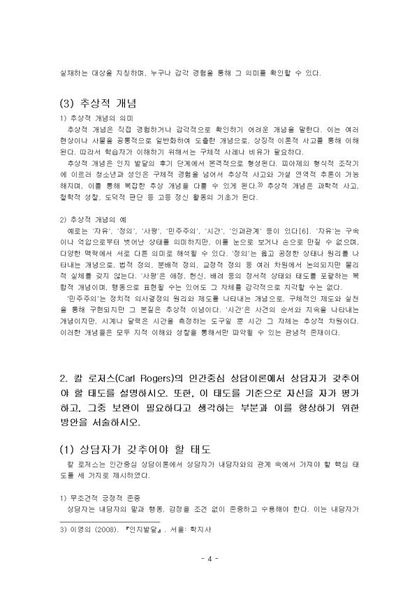 (1) °³³äÀÇ Á¤ÀÇ °³³äÀ̶õ ƯÁ¤ Çö»óÀ̳ª »ç¹°, »ç°Ç¿¡ ´ëÇÑ °øÅëÀû ¼Ó¼º°ú º»ÁúÀ» Ãß»óÈÇÏ¿© ÀϹÝÈÇÑ ÀÎÁöÀû ´ÜÀ§·Î Á¤ÀÇÇÒ ¼ö ÀÖ´Ù. ´Ù½Ã ¸»ÇØ, °³³äÀº °³º°ÀûÀÌ°í ±¸Ã¼ÀûÀÎ »ç¹°À̳ª °æÇè¿¡¼ °øÅëµÈ Ư¡À» »Ì¾Æ³»¾î ¹üÁÖÈÇϰí, À̸¦ ÅëÇØ »ç°í¿Í ÀÇ»ç¼ÒÅëÀ» °¡´ÉÇÏ°Ô ÇÏ´Â ±âÃÊÀûÀÎ »ç°í µµ±¸¶ó ÇÒ ¼ö ÀÖ´Ù. ¿¹¸¦ µé¾î, ¡®³ª¹«¡¯¶ó´Â °³³äÀº ¼Ò³ª¹«, º¢³ª¹«, ´ÀƼ³ª¹«¿Í °°ÀÌ ¼·Î ´Ù¸¥ ±¸Ã¼Àû »ç·ÊµéÀ» ¹¾îÁÖ´Â »óÀ§ ¹üÁÖÀû ÀÎ½Ä ´ÜÀ§·Î ÀÛ¿ëÇÑ´Ù. ÀÌ·¯ÇÑ °³³äÀº Àΰ£ÀÌ ¼¼°è¸¦ ÀÌÇØÇÏ°í ºÐ·ùÇÏ¸ç »õ·Î¿î Áö½ÄÀ» ½ÀµæÇÏ´Â µ¥ ÇÙ½ÉÀûÀÎ ¿ªÇÒÀ» ´ã´çÇÑ´Ù. µû¶ó¼ °³³äÀº ´Ü¼øÈ÷ ¿ë¾îÀÇ Á¤ÀǸ¦ ³Ñ¾î Àνİú »ç°íÀÇ Æ²À» Çü¼ºÇÏ´Â ±âº» ±¸Á¶¶ó°í ÇÒ ¼ö ÀÖ´Ù. °³³äÀº Àΰ£ÀÌ - Áß·« - 2. Ä® ·ÎÀú½º(Carl Rogers)ÀÇ Àΰ£Á᫐ »ó´ãÀ̷п¡¼ »ó´ãÀÚ°¡ °®Ãß¾î¾ß ÇÒ Åµµ¸¦ ¼³¸íÇϽÿÀ. ¶ÇÇÑ, ÀÌ Åµµ¸¦ ±âÁØÀ¸·Î ÀÚ½ÅÀ» ÀÚ°¡ Æò°¡Çϰí, ±×Áß º¸¿ÏÀÌ ÇÊ¿äÇÏ´Ù°í »ý°¢ÇÏ´Â ºÎºÐ°ú À̸¦ Çâ»óÇϱâ À§ÇÑ ¹æ¾ÈÀ» ¼¼úÇϽÿÀ. (1) »ó´ãÀÚ°¡ °®Ãß¾î¾ß ÇÒ Åµµ Ä® ·ÎÀú½º´Â Àΰ£Á᫐ »ó´ãÀ̷п¡¼ »ó´ãÀÚ°¡ ³»´ãÀÚ¿ÍÀÇ °ü°è ¼Ó¿¡¼ °¡Á®¾ß ÇÒ ÇÙ½É Åµµ¸¦ ¼¼ °¡Áö·Î Á¦½ÃÇÏ¿´´Ù. 1) ¹«Á¶°ÇÀû ±àÁ¤Àû Á¸Áß »ó´ãÀÚ´Â ³»´ãÀÚÀÇ ¸»°ú Çൿ, °¨Á¤À» Á¶°Ç ¾øÀÌ Á¸ÁßÇÏ°í ¼ö¿ëÇØ¾ß ÇÑ´Ù. ÀÌ´Â ³»´ãÀÚ°¡ - Áß·« - |