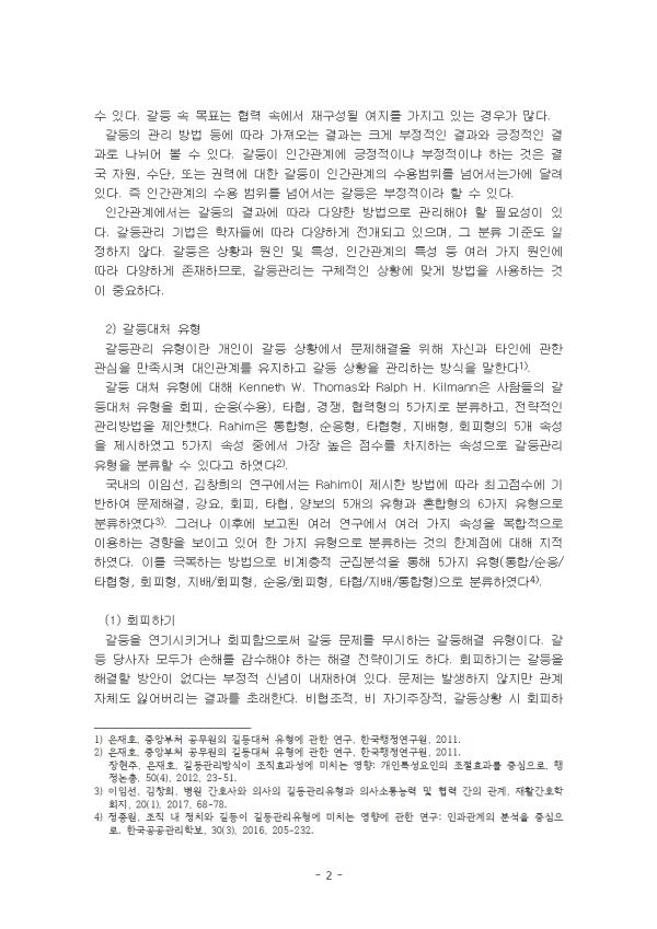 ´©±¸µç ¼¼»óÀ» »ì¸é¼ °¥µîÀ» °ÞÁö ¾ÊÀ» ¼ö´Â ¾ø´Ù. ´Ù¸¸ °¥µîÀÌ ¹ß»ý ÇßÀ» °æ¿ì ¾î¶»°Ô ÇØ°áÇÏ´À³Ä¿¡ µû¶ó °á°ú°¡ ´Þ¶óÁø´Ù. »ç¶÷¿¡ µû¶ó °¥µî¿¡ ´ëÇÑ ´ëÀÀ°ú ½ºÆ®·¹½º´Â ´Ù¸£°Ô ³ªÅ¸³´Ù. ¾î¶² »ç¶÷Àº ¾ÆÁÖ ÀÛÀº °¥µî¿¡µµ Å« »óó¸¦ ¹Þ°í ¾î¶² »ç¶÷Àº ¸Å¿ì Å« °¥µîµµ ÀÇ¿¬ÇÏ°Ô ´ëóÇÏ¿© ½ºÆ®·¹½º¸¦ Àû°Ô ¹Þ´Â´Ù. °¥µîÀº µÎ »ç¶÷ ¶Ç´Â Áý´ÜÀÌ ¼·ÎÀÇ ÀǰßÀ̳ª ¸ñÇ¥°¡ ´Ù¸£°Å³ª ºÒÀÏÄ¡ÇÑ´Ù´Â °ÍÀ» ÀνÄÇßÀ» ¶§ Á¸ÀçÇÑ´Ù. °¥µîÀ» Á¤ÀÇÇÏ·Á¸é, ´ç»çÀÚµé »çÀÌ¿¡ ¹®Á¦³ª Â÷À̰¡ Á¸ÀçÇÑ´Ù´Â °ÍÀ» ÀÌÇØÇϰí, À̸¦ ÀÎÁöÇÏ´Â °úÁ¤ÀÌ ÇÊ¿äÇÏ´Ù. »ó´ë¹æÀÌ ³ªÀÇ ¾î·Á¿òÀ̳ª °íÃæÀ» ÀüÇô ÀÎÁöÇÏÁö ¸øÇÑ »óŶó¸é, °¥µîÀº ¾ÆÁ÷ Çü¼ºµÇÁö ¾ÊÀº »óÅ·Πº¼ ¼ö ÀÖ´Ù. µû¶ó¼ °¥µîÀÇ ¼º¸³ ¿ä°Ç Áß Çϳª´Â ¹®Á¦°¡ Á¸ÀçÇÑ´Ù´Â ¾çÃøÀÇ ÀνÄÀÌ´Ù. ÀÌ ·¹Æ÷Æ®´Â °ÀÇ ¹× ±³Àç 13° ¡°³ªÀÇ °¥µî ½ºÅ¸ÀÏ¡±ÀÇ ³»¿ëÀ» ¹ÙÅÁÀ¸·Î °¥µî°ú °¥µî´ëó À¯Çü¿¡ ´ëÇØ ÇмúÀûÀ¸·Î Á¤¸®ÇÑ ÈÄ, ³ªÀÇ »î¿¡¼ °æÇèÇß´ø ´ëÀΰü°è °¥µîÀ» ¹ÙÅÁÀ¸·Î ³ªÀÇ °¥µî ÇØ°á À¯ÇüÀ» ºÐ¼®Çϰí, ÀÌ·¯ÇÑ ºÐ¼® °úÁ¤¿¡¼ ¹è¿îÁ¡°ú ´À³¤Á¡À» ±â¼úÇÏ¿´´Ù. II. º» ·Ð 1. °¥µî°ú °¥µî´ëó À¯Çü 1) °¥µî °¥µîÀº ¾ç¸³ ºÒ°¡´ÉÇÑ ¸ñÇ¥, ºÎÁ·ÇÑ ÀÚ¿ø, ¸ñÇ¥´Þ¼º¿¡ ´ëÇÑ »ó´ë¹æÀÇ ¹æÇظ¦ Áö°¢ÇÑ »óÈ£ÀÇÁ¸ÀûÀÎ ´ç»çÀÚ°¡ Ç¥ÃâÇÑ ºÐÀïÀÌ´Ù. °¥µîÀº Àΰ£°ü°è ³»¿¡¼ÀÇ °ü¸®°¡ Áß¿äÇÏ°Ô ´ëµÎµÇ°í ÀÖ´Ù. ÀûÁ¤ÇÑ ¼öÁØÀÇ °¥µîÀ» À¯ÁöÇϸé¼, ±× ¼ø±â´ÉÀ» ÃÖ´ë·Î ²ø¾î¿Ã¸®´Â °ÍÀÌ °¥µî´ëÀÀÀÇ ¸ñÀûÀÌ µÈ´Ù. ±×¸®°í, °¥µîÀÇ ±â´ÉÀÌ ¼ø±â´ÉÀÎÁö ¿ª±â´ÉÀÎÁö¸¦ ÆÇ´ÜÇÏ´Â ±âÁØÀº ±× °á°ú¶ó ÇÒ ¼ö ÀÖ´Ù ÇÏ¿´´Ù. °¥µîÀº ¿©·¯ ´Ü°è¸¦ °ÅÄ¡¸é¼ ¹ß»ýµÇ¾î ½Éȵǰí ÇØ¼ÒµÇ´Â °úÁ¤À» °ÅÄ¡°Ô µÇ¹Ç·Î, ¾î¶°ÇÑ °úÁ¤À» °ÅÄ¡´À³Ä¿¡ µû¶ó ÃÊ·¡ÇÏ´Â °á°úµµ ´Ù¸£°Ô µÈ´Ù. °¥µî »óȲÀº µÑ ÀÌ»óÀÇ ´ç»çÀÚ°¡ °¢ÀÚÀÇ ¸ñÇ¥¸¦ Ãß±¸Çϸç, ±× ¸ñÇ¥°¡ »óÃæµÈ´Ù°í ´À²¸Áú ¶§ ¹ß»ýÇÑ´Ù. °¥µî¿¡ °ü·ÃµÈ ¸ñÇ¥´Â ¿ÏÀüÈ÷ ¾ç¸³ÇÒ ¼ö ¾ø´Â °Í¸¸Àº ¾Æ´Ï´Ù. °Ñº¸±â¿¡´Â ¼·Î ¸ð¼øµÇ¾î º¸ÀÌ´Â ¸ñÇ¥µéµµ, ´ëȸ¦ ÅëÇØ ¼·ÎÀÇ Àǵµ¸¦ ÀÌÇØÇϰí À¶ÈÁ¡À» ãÀ¸¸é Á¶È¸¦ ÀÌ·ç¾î °øÅëÀÇ ¸ñÇ¥·Î ³ª¾Æ°¥ ¼ö ÀÖ´Â °æ¿ì°¡ ¸¹´Ù. ÇÑ »ç¶÷Àº È¿À²¼ºÀ», ´Ù¸¥ »ç¶÷Àº âÀǼºÀ» Áß½ÃÇÑ´Ù´Â ÀÇ°ß Â÷À̰¡ ÀÖÀ» ¶§, ÀÌ µÎ °¡Áö ¸ñÇ¥´Â »óÃæÇÏ´Â µí º¸ÀÌÁö¸¸, °áÇÕµÈ ÇüÅÂ·Î ÇØ°áÃ¥À» µµÃâÇÒ °¡´É¼º ¶ÇÇÑ Á¸ÀçÇÒ ¼ö ÀÖ´Ù. °¥µî ¼Ó ¸ñÇ¥´Â Çù·Â ¼Ó¿¡¼ À籸¼ºµÉ ¿©Áö¸¦ °¡Áö°í ÀÖ´Â °æ¿ì°¡ ¸¹´Ù. °¥µîÀÇ °ü¸® ¹æ¹ý µî¿¡ µû¶ó °¡Á®¿À´Â °á°ú´Â Å©°Ô ºÎÁ¤ÀûÀÎ °á°ú¿Í ±àÁ¤ÀûÀÎ °á°ú·Î ³ª´µ¾î º¼ ¼ö ÀÖ´Ù. °¥µîÀÌ Àΰ£°ü°è¿¡ ±àÁ¤ÀûÀÌ³Ä ºÎÁ¤ÀûÀÌ³Ä ÇÏ´Â °ÍÀº °á±¹ ÀÚ¿ø, ¼ö´Ü, ¶Ç´Â ±Ç·Â¿¡ ´ëÇÑ °¥µîÀÌ Àΰ£°ü°èÀÇ ¼ö¿ë¹üÀ§¸¦ ³Ñ¾î¼´Â°¡¿¡ ´Þ·Á ÀÖ´Ù. Áï Àΰ£°ü°èÀÇ ¼ö¿ë ¹üÀ§¸¦ ³Ñ¾î¼´Â °¥µîÀº ºÎÁ¤ÀûÀ̶ó ÇÒ ¼ö ÀÖ´Ù. Àΰ£°ü°è¿¡¼´Â °¥µîÀÇ °á°ú¿¡ µû¶ó ´Ù¾çÇÑ ¹æ¹ýÀ¸·Î °ü¸®ÇØ¾ß ÇÒ Çʿ伺ÀÌ ÀÖ´Ù. °¥µî°ü¸® ±â¹ýÀº ÇÐÀڵ鿡 µû¶ó ´Ù¾çÇÏ°Ô Àü°³µÇ°í ÀÖÀ¸¸ç, ±× ºÐ·ù ±âÁصµ ÀÏÁ¤ÇÏÁö ¾Ê´Ù. °¥µîÀº »óȲ°ú ¿øÀÎ ¹× Ư¼º, Àΰ£°ü°èÀÇ Æ¯¼º µî ¿©·¯ °¡Áö ¿øÀο¡ µû¶ó ´Ù¾çÇÏ°Ô Á¸ÀçÇϹǷÎ, °¥µî°ü¸®´Â ±¸Ã¼ÀûÀÎ »óȲ¿¡ ¸Â°Ô ¹æ¹ýÀ» »ç¿ëÇÏ´Â °ÍÀÌ Áß¿äÇÏ´Ù. 2) °¥µî´ëó À¯Çü °¥µî°ü¸® À¯ÇüÀ̶õ °³ÀÎÀÌ °¥µî »óȲ¿¡¼ ¹®Á¦ÇذáÀ» À§ÇØ ÀڽŰú ŸÀο¡ °üÇÑ °ü½ÉÀ» ¸¸Á·½ÃÄÑ ´ëÀΰü°è¸¦ À¯ÁöÇÏ°í °¥µî »óȲÀ» °ü¸®ÇÏ´Â ¹æ½ÄÀ» ¸»ÇÑ´Ù. °¥µî ´ëó À¯Çü¿¡ ´ëÇØ Kenneth W. Thomas¿Í Ralph H. KilmannÀº »ç¶÷µéÀÇ °¥µî´ëó À¯ÇüÀ» ȸÇÇ, ¼øÀÀ(¼ö¿ë), ŸÇù, °æÀï, Çù·ÂÇüÀÇ 5°¡Áö·Î ºÐ·ùÇϰí, Àü·«ÀûÀÎ °ü¸®¹æ¹ýÀ» Á¦¾ÈÇß´Ù. RahimÀº ÅëÇÕÇü, ¼øÀÀÇü, ŸÇùÇü, Áö¹èÇü, ȸÇÇÇüÀÇ 5°³ ¼Ó¼ºÀ» Á¦½ÃÇÏ¿´°í 5°¡Áö ¼Ó¼º Áß¿¡¼ °¡Àå ³ôÀº Á¡¼ö¸¦ Â÷ÁöÇÏ´Â ¼Ó¼ºÀ¸·Î °¥µî°ü¸® À¯ÇüÀ» ºÐ·ùÇÒ ¼ö ÀÖ´Ù°í ÇÏ¿´´Ù. ±¹³»ÀÇ ÀÌÀÓ¼±, ±èâÈñÀÇ ¿¬±¸¿¡¼´Â RahimÀÌ Á¦½ÃÇÑ ¹æ¹ý¿¡ µû¶ó ÃÖ°íÁ¡¼ö¿¡ ±â¹ÝÇÏ¿© ¹®Á¦Çذá, °¿ä, ȸÇÇ, ŸÇù, ¾çº¸ÀÇ 5°³ÀÇ À¯Çü°ú È¥ÇÕÇüÀÇ 6°¡Áö À¯ÇüÀ¸·Î ºÐ·ùÇÏ¿´´Ù. ±×·¯³ª ÀÌÈÄ¿¡ º¸°íµÈ ¿©·¯ ¿¬±¸¿¡¼ ¿©·¯ °¡Áö ¼Ó¼ºÀ» º¹ÇÕÀûÀ¸·Î ÀÌ¿ëÇÏ´Â °æÇâÀ» º¸À̰í ÀÖ¾î ÇÑ °¡Áö À¯ÇüÀ¸·Î ºÐ·ùÇÏ´Â °ÍÀÇ