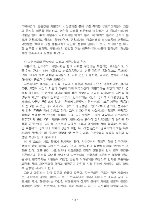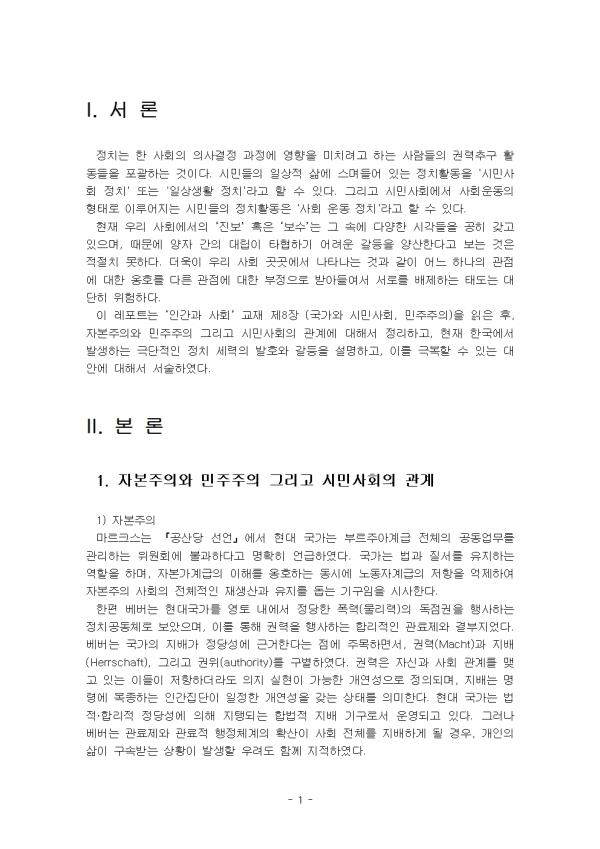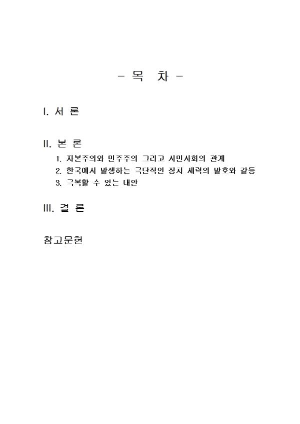 ¨ç ¸ÕÀú ¡®Àΰ£°ú »çȸ¡¯ ±³Àç Á¦8Àå (±¹°¡¿Í ½Ã¹Î»çȸ, ¹ÎÁÖÁÖÀÇ)À» ÀÐÀº ÈÄ, ÀÚº»ÁÖÀÇ¿Í ¹ÎÁÖÁÖÀÇ ±×¸®°í ½Ã¹Î»çȸÀÇ °ü°è¿¡ ´ëÇØ¼ Á¤¸®Çϰí, ¨è ±³Àç¿¡ ¼³¸íµÈ ÀÌ·ÐÀ̳ª °³³äÀ» »ç¿ëÇÏ¿© ÇöÀç Çѱ¹¿¡¼ ¹ß»ýÇÏ´Â ±Ø´ÜÀûÀÎ Á¤Ä¡ ¼¼·ÂÀÇ ¹ßÈ£¿Í °¥µîÀ» ¼³¸íÇϰí, ¨é À̸¦ ±Øº¹ÇÒ ¼ö ÀÖ´Â ´ë¾È¿¡ ´ëÇØ¼ ¼¼úÇϽÿÀ. - ¸ñ Â÷ - I. ¼ ·Ð II. º» ·Ð 1. ÀÚº»ÁÖÀÇ¿Í ¹ÎÁÖÁÖÀÇ ±×¸®°í ½Ã¹Î»çȸÀÇ °ü°è 2. Çѱ¹¿¡¼ ¹ß»ýÇÏ´Â ±Ø´ÜÀûÀÎ Á¤Ä¡ ¼¼·ÂÀÇ ¹ßÈ£¿Í °¥µî 3. ±Øº¹ÇÒ ¼ö ÀÖ´Â ´ë¾È III. °á ·Ð Âü°í¹®Çå ** ÇÔ²² Á¦°øµÇ´Â Âü°íÀÚ·á ÇÑ±ÛÆÄÀÏ ** 1. ±Øº¹ÇÒ ¼ö ÀÖ´Â ´ë¾È.hwp 2. ±Øº¹ÇÒ ¼ö ÀÖ´Â ´ë¾È2.hwp 3. ÀÚº»ÁÖÀÇ¿Í ¹ÎÁÖÁÖÀÇ ±×¸®°í ½Ã¹Î»çȸÀÇ °ü°è.hwp 4. ÀÚº»ÁÖÀÇ¿Í ¹ÎÁÖÁÖÀÇ ±×¸®°í ½Ã¹Î»çȸÀÇ °ü°è2.hwp 5. Çѱ¹¿¡¼ ¹ß»ýÇÏ´Â ±Ø´ÜÀûÀÎ Á¤Ä¡ ¼¼·ÂÀÇ ¹ßÈ£¿Í °¥µî.hwp 6. Çѱ¹¿¡¼ ¹ß»ýÇÏ´Â ±Ø´ÜÀûÀÎ Á¤Ä¡ ¼¼·ÂÀÇ ¹ßÈ£¿Í °¥µî2.hwp 7. ¼·Ð ÀÛ¼º½Ã ÂüÁ¶.hwp 8. °á·Ð ÀÛ¼º½Ã ÂüÁ¶.hwp 9. ¼·Ð ÀÛ¼º½Ã ÂüÁ¶2.hwp 10. °á·Ð ÀÛ¼º½Ã ÂüÁ¶2.hwp ÀÚ·á³»¿ë ¹Ì¸®º¸±â