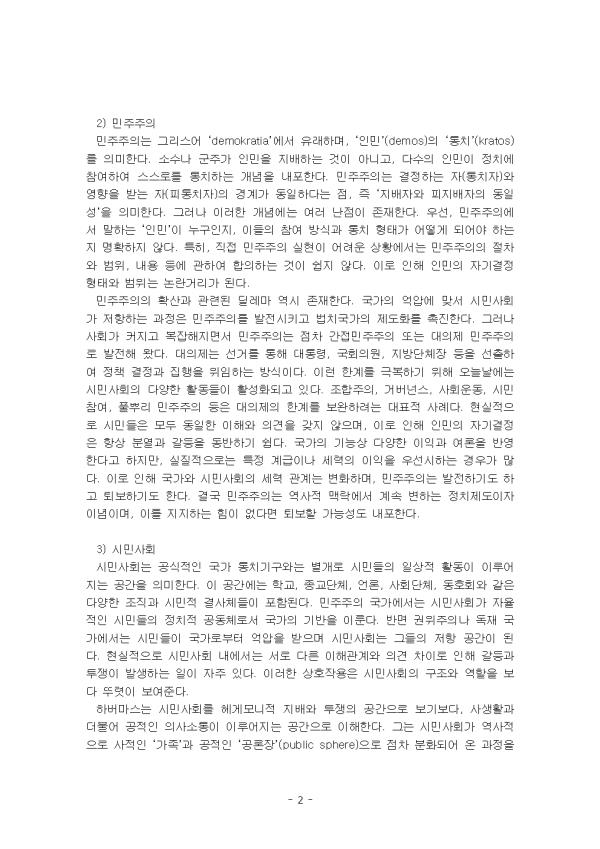 Á¤Ä¡´Â ÇÑ »çȸÀÇ ÀÇ»ç°áÁ¤ °úÁ¤¿¡ ¿µÇâÀ» ¹ÌÄ¡·Á°í ÇÏ´Â »ç¶÷µéÀÇ ±Ç·ÂÃß±¸ Ȱµ¿µéÀ» Æ÷°ýÇÏ´Â °ÍÀÌ´Ù. ½Ã¹ÎµéÀÇ ÀÏ»óÀû »î¿¡ ½º¸çµé¾î ÀÖ´Â Á¤Ä¡È°µ¿À» '½Ã¹Î»çȸ Á¤Ä¡' ¶Ç´Â 'ÀÏ»ó»ýȰ Á¤Ä¡'¶ó°í ÇÒ ¼ö ÀÖ´Ù. ±×¸®°í ½Ã¹Î»çȸ¿¡¼ »çȸ¿îµ¿ÀÇ ÇüÅ·ΠÀÌ·ç¾îÁö´Â ½Ã¹ÎµéÀÇ Á¤Ä¡È°µ¿Àº '»çȸ ¿îµ¿ Á¤Ä¡'¶ó°í ÇÒ ¼ö ÀÖ´Ù. ÇöÀç ¿ì¸® »çȸ¿¡¼ÀÇ ¡®Áøº¸¡¯ ȤÀº ¡®º¸¼ö¡¯´Â ±× ¼Ó¿¡ ´Ù¾çÇÑ ½Ã°¢µéÀ» °øÈ÷ °®°í ÀÖÀ¸¸ç, ¶§¹®¿¡ ¾çÀÚ °£ÀÇ ´ë¸³ÀÌ Å¸ÇùÇϱ⠾î·Á¿î °¥µîÀ» ¾ç»êÇÑ´Ù°í º¸´Â °ÍÀº ÀûÀýÄ¡ ¸øÇÏ´Ù. ´õ¿íÀÌ ¿ì¸® »çȸ °÷°÷¿¡¼ ³ªÅ¸³ª´Â °Í°ú °°ÀÌ ¾î´À ÇϳªÀÇ °üÁ¡¿¡ ´ëÇÑ ¿ËÈ£¸¦ ´Ù¸¥ °üÁ¡¿¡ ´ëÇÑ ºÎÁ¤À¸·Î ¹Þ¾Æµé¿©¼ ¼·Î¸¦ ¹èÁ¦Çϴ ŵµ´Â ´ë´ÜÈ÷ À§ÇèÇÏ´Ù. ÀÌ ·¹Æ÷Æ®´Â ¡®Àΰ£°ú »çȸ¡¯ ±³Àç Á¦8Àå (±¹°¡¿Í ½Ã¹Î»çȸ, ¹ÎÁÖÁÖÀÇ)À» ÀÐÀº ÈÄ, ÀÚº»ÁÖÀÇ¿Í ¹ÎÁÖÁÖÀÇ ±×¸®°í ½Ã¹Î»çȸÀÇ °ü°è¿¡ ´ëÇØ¼ Á¤¸®Çϰí, ÇöÀç Çѱ¹¿¡¼ ¹ß»ýÇÏ´Â ±Ø´ÜÀûÀÎ Á¤Ä¡ ¼¼·ÂÀÇ ¹ßÈ£¿Í °¥µîÀ» ¼³¸íÇϰí, À̸¦ ±Øº¹ÇÒ ¼ö ÀÖ´Â ´ë¾È¿¡ ´ëÇØ¼ ¼¼úÇÏ¿´´Ù. II. º» ·Ð 1. ÀÚº»ÁÖÀÇ¿Í ¹ÎÁÖÁÖÀÇ ±×¸®°í ½Ã¹Î»çȸÀÇ °ü°è 1) ÀÚº»ÁÖÀÇ ¸¶¸£Å©½º´Â ¡º°ø»ê´ç ¼±¾ð¡»¿¡¼ Çö´ë ±¹°¡´Â ºÎ¸£Á־ưè±Þ ÀüüÀÇ °øµ¿¾÷¹«¸¦ °ü¸®ÇÏ´Â À§¿øÈ¸¿¡ ºÒ°úÇÏ´Ù°í ¸íÈ®È÷ ¾ð±ÞÇÏ¿´´Ù. ±¹°¡´Â ¹ý°ú Áú¼¸¦ À¯ÁöÇÏ´Â ¿ªÇÒÀ» Çϸç, ÀÚº»°¡°è±ÞÀÇ ÀÌÇØ¸¦ ¿ËÈ£ÇÏ´Â µ¿½Ã¿¡ ³ëµ¿ÀÚ°è±ÞÀÇ ÀúÇ×À» ¾ïÁ¦ÇÏ¿© ÀÚº»ÁÖÀÇ »çȸÀÇ ÀüüÀûÀÎ Àç»ý»ê°ú À¯Áö¸¦ µ½´Â ±â±¸ÀÓÀ» ½Ã»çÇÑ´Ù. ÇÑÆí º£¹ö´Â Çö´ë±¹°¡¸¦ ¿µÅä ³»¿¡¼ Á¤´çÇÑ Æø·Â(¹°¸®·Â)ÀÇ µ¶Á¡±ÇÀ» Çà»çÇÏ´Â Á¤Ä¡°øµ¿Ã¼·Î º¸¾ÒÀ¸¸ç, À̸¦ ÅëÇØ ±Ç·ÂÀ» Çà»çÇÏ´Â ÇÕ¸®ÀûÀÎ °ü·áÁ¦¿Í °áºÎÁö¾ú´Ù. º£¹ö´Â ±¹°¡ÀÇ Áö¹è°¡ Á¤´ç¼º¿¡ ±Ù°ÅÇÑ´Ù´Â Á¡¿¡ ÁÖ¸ñÇϸé¼, ±Ç·Â(Macht)°ú Áö¹è(Herrschaft), ±×¸®°í ±ÇÀ§(authority)¸¦ ±¸º°ÇÏ¿´´Ù. ±Ç·ÂÀº ÀڽŰú »çȸ °ü°è¸¦ ¸Î°í ÀÖ´Â À̵éÀÌ ÀúÇ×ÇÏ´õ¶óµµ ÀÇÁö ½ÇÇöÀÌ °¡´ÉÇÑ °³¿¬¼ºÀ¸·Î Á¤ÀǵǸç, Áö¹è´Â ¸í·É¿¡ º¹Á¾ÇÏ´Â Àΰ£Áý´ÜÀÌ ÀÏÁ¤ÇÑ °³¿¬¼ºÀ» °®´Â »óŸ¦ ÀǹÌÇÑ´Ù. Çö´ë ±¹°¡´Â ¹ýÀû¡¤ÇÕ¸®Àû Á¤´ç¼º¿¡ ÀÇÇØ ÁöÅʵǴ ÇÕ¹ýÀû Áö¹è ±â±¸·Î¼ ¿î¿µµÇ°í ÀÖ´Ù. ±×·¯³ª º£¹ö´Â °ü·áÁ¦¿Í °ü·áÀû ÇàÁ¤Ã¼°èÀÇ È®»êÀÌ »çȸ Àüü¸¦ Áö¹èÇÏ°Ô µÉ °æ¿ì, °³ÀÎÀÇ »îÀÌ ±¸¼Ó¹Þ´Â »óȲÀÌ ¹ß»ýÇÒ ¿ì·Áµµ ÇÔ²² ÁöÀûÇÏ¿´´Ù. 2) ¹ÎÁÖÁÖÀÇ ¹ÎÁÖÁÖÀÇ´Â ±×¸®½º¾î ¡®demokratia¡¯¿¡¼ À¯·¡Çϸç, ¡®ÀιΡ¯(demos)ÀÇ ¡®ÅëÄ¡¡¯(kratos)¸¦ ÀǹÌÇÑ´Ù. ¼Ò¼ö³ª ±ºÁÖ°¡ ÀιÎÀ» Áö¹èÇÏ´Â °ÍÀÌ ¾Æ´Ï°í, ´Ù¼öÀÇ ÀιÎÀÌ Á¤Ä¡¿¡ Âü¿©ÇÏ¿© ½º½º·Î¸¦ ÅëÄ¡ÇÏ´Â °³³äÀ» ³»Æ÷ÇÑ´Ù. ¹ÎÁÖÁÖÀÇ´Â °áÁ¤ÇÏ´Â ÀÚ(ÅëÄ¡ÀÚ)¿Í ¿µÇâÀ» ¹Þ´Â ÀÚ(ÇÇÅëÄ¡ÀÚ)ÀÇ °æ°è°¡ µ¿ÀÏÇÏ´Ù´Â Á¡, Áï ¡®Áö¹èÀÚ¿Í ÇÇÁö¹èÀÚÀÇ µ¿Àϼº¡¯À» ÀǹÌÇÑ´Ù. ±×·¯³ª ÀÌ·¯ÇÑ °³³ä¿¡´Â ¿©·¯ ³Á¡ÀÌ Á¸ÀçÇÑ´Ù. ¿ì¼±, ¹ÎÁÖÁÖÀÇ¿¡¼ ¸»ÇÏ´Â ¡®ÀιΡ¯ÀÌ ´©±¸ÀÎÁö, À̵éÀÇ Âü¿© ¹æ½Ä°ú ÅëÄ¡ ÇüŰ¡ ¾î¶»°Ô µÇ¾î¾ß ÇÏ´ÂÁö ¸íÈ®ÇÏÁö ¾Ê´Ù. ƯÈ÷, Á÷Á¢ ¹ÎÁÖÁÖÀÇ ½ÇÇöÀÌ ¾î·Á¿î »óȲ¿¡¼´Â ¹ÎÁÖÁÖÀÇÀÇ ÀýÂ÷¿Í ¹üÀ§, ³»¿ë µî¿¡ °üÇÏ¿© ÇÕÀÇÇÏ´Â °ÍÀÌ ½±Áö ¾Ê´Ù. ÀÌ·Î ÀÎÇØ ÀιÎÀÇ ÀÚ±â°áÁ¤ ÇüÅÂ¿Í ¹üÀ§´Â ³í¶õ°Å¸®°¡ µÈ´Ù. ¹ÎÁÖÁÖÀÇÀÇ È®»ê°ú °ü·ÃµÈ µô·¹¸¶ ¿ª½Ã Á¸ÀçÇÑ´Ù. ±¹°¡ÀÇ ¾ï¾Ð¿¡ ¸Â¼ ½Ã¹Î»çȸ°¡ ÀúÇ×ÇÏ´Â °úÁ¤Àº ¹ÎÁÖÁÖÀǸ¦ ¹ßÀü½ÃŰ°í ¹ýÄ¡±¹°¡ÀÇ Á¦µµÈ¸¦ ÃËÁøÇÑ´Ù. ±×·¯³ª »çȸ°¡ Ä¿Áö°í º¹ÀâÇØÁö¸é¼ ¹ÎÁÖÁÖÀÇ´Â Á¡Â÷ °£Á¢¹ÎÁÖÁÖÀÇ ¶Ç´Â ´ëÀÇÁ¦ ¹ÎÁÖÁÖÀÇ·Î ¹ßÀüÇØ ¿Ô´Ù. ´ëÀÇÁ¦´Â ¼±°Å¸¦ ÅëÇØ ´ëÅë·É, ±¹È¸ÀÇ¿ø, Áö¹æ´ÜüÀå µîÀ» ¼±ÃâÇÏ¿© Á¤Ã¥ °áÁ¤°ú ÁýÇàÀ» À§ÀÓÇÏ´Â ¹æ½ÄÀÌ´Ù. ÀÌ·± ÇѰ踦 ±Øº¹Çϱâ À§ÇØ ¿À´Ã³¯¿¡´Â ½Ã¹Î»çȸÀÇ ´Ù¾çÇÑ È°µ¿µéÀÌ È°¼ºÈµÇ°í ÀÖ´Ù. Á¶ÇÕÁÖÀÇ, °Å¹ö³Í½º, »çȸ¿îµ¿, ½Ã¹ÎÂü¿©, Ç®»Ñ¸® ¹ÎÁÖÁÖÀÇ µîÀº ´ëÀÇÁ¦ÀÇ ÇѰ踦 º¸¿ÏÇÏ·Á´Â ´ëÇ¥Àû »ç·Ê´Ù. Çö½ÇÀûÀ¸·Î ½Ã¹ÎµéÀº ¸ðµÎ µ¿ÀÏÇÑ ÀÌÇØ¿Í ÀǰßÀ» °®Áö ¾ÊÀ¸¸ç, ÀÌ·Î ÀÎÇØ ÀιÎÀÇ ÀÚ±â°áÁ¤Àº Ç×»ó ºÐ¿°ú °¥µîÀ» µ¿¹ÝÇϱ⠽±´Ù. ±¹°¡ÀÇ ±â´É»ó ´Ù¾çÇÑ ÀÌÀͰú ¿©·ÐÀ» ¹Ý¿µÇÑ´Ù°í ÇÏÁö¸¸, ½ÇÁúÀûÀ¸·Î´Â ƯÁ¤ °è±ÞÀ̳ª ¼¼·ÂÀÇ ÀÌÀÍÀ» ¿ì¼±½ÃÇÏ´Â °æ¿ì°¡ ¸¹´Ù. ÀÌ·Î ÀÎÇØ ±¹°¡¿Í ½Ã¹Î»çȸÀÇ ¼¼·Â °ü°è´Â º¯ÈÇ