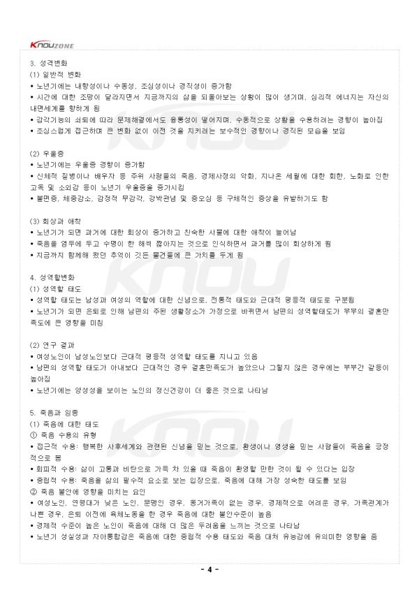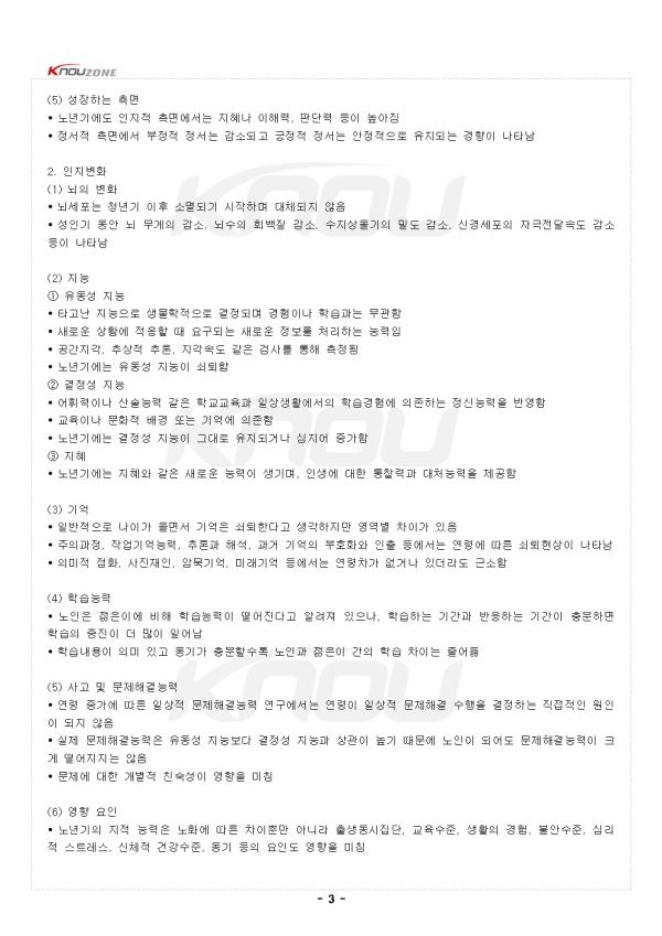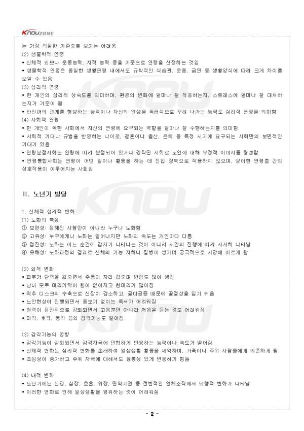 ¥°. ³ëÀÎÀÇ °³³ä 1. ³ëÀο¡ ´ëÇÑ ÀÌÇØ ¨ç ³ëÈÀÇ ÀÇ¹Ì • ³ëÈ´Â ½Ã°£ÀÇ È帧¿¡ µû¶ó À¯±âüÀÇ ¼¼Æ÷³ª Á¶Á÷¿¡¼ ÀϾ´Â Á¡ÁøÀû º¯È¸¦ ÀǹÌÇÔ • ³ëÈ´Â Àΰ£¹ß´Þ¿¡¼ ÀÚ¿¬½º·¯¿î °úÁ¤À¸·Î ´©±¸µµ ÇÇÇØ°¥ ¼ö ¾ø´Â º¸ÆíÀû °úÁ¤ÀÓ • Àΰ£¹ß´ÞÀº ¼ºÀå°úÁ¤°ú ³ëȰúÁ¤À¸·Î ±¸¼ºµÇ¸ç, ³ëȰúÁ¤Àº Àå±âÀûÀ¸·Î ÁøÇàµÊ ¨è ¼º°øÀû ³ëÈ • ¼º°øÀû ³ëÈ¿¡ ´ëÇÑ ÀνÄÀÌ º¸Æíȵǰí ÀÖÀ¸¸ç, 1986³â ¼¼°è³ë³âÇÐȸ¿¡¼ óÀ½ Á¦±âµÊ • ³ëÀκ¹Áö¼ºñ½º ÇöÀå¿¡¼´Â ÇмúÀû ³íÀǸ¦ Åä´ë·Î ÇÁ·Î±×·¥À» °³¹ßÇÏ¿© ³ëÀÎÀÇ »îÀÇ ÁúÀ» ³ôÀ̰íÀÚ ³ë·ÂÇÔ ¨é 100¼¼ »çȸ • 100¼¼ »çȸ´Â Àå¼ö°¡ º¸ÆíȵǴ ½Ã´ë·Î, ¸ðµç ¿¬·É´ëÀÇ »çȸ±¸¼º¿øÀÌ Àå±âÀû °üÁ¡¿¡¼ »ý¾Ö°èȹÀ» ±¸»óÇØ¾ß ÇÔ • º¸¶÷ ÀÖ´Â »îÀ» ¿µÀ§Çϱâ À§ÇÑ È°±âÂ÷°í ÁغñµÈ Àå¼ö»çȸ¸¦ ¸ñÇ¥·Î ÇØ¾ß ÇÔ ¨ê ³ëÈÀÇ ¹üÀ§ • ³ëÈ´Â ½ÅüÀû º¯È»Ó¸¸ ¾Æ´Ï¶ó »ý¹°ÇÐÀû º¯È, ½É¸®ÇÐÀû º¯È, »çȸÀû º¯È¸¦ Æ÷ÇÔÇÏ´Â ³ÐÀº Àǹ̸¦ Áö´Ô • ³ëȰúÁ¤¿¡¼ Àΰ£Àº ´Ù¾çÇÑ ±â¼úÀ» ½ÀµæÇÏ°í ´É·Â Çâ»óÀ» °æÇèÇÒ ¼ö ÀÖÀ¸¸ç, »îÀÇ ÁöÇý¸¦ ¾òÀ» ¼ö ÀÖÀ½ • ³ëȰúÁ¤Àº ´ÜÀÏÇÑ °úÁ¤ÀÌ ¾Æ´Ï¶ó ´Ù¾çÇÑ °úÁ¤À̸ç, ±àÁ¤Àû Ãø¸é°ú ºÎÁ¤Àû Ãø¸éÀÇ ¾ç¸é¼ºÀÌ ÀÖÀ½ ¨ë ³ëÀκ¹Áö¹ý»ó ³ëÀÎ • ³ëÀκ¹Áö¹ý Á¦2Á¶¿¡¼´Â ³ëÀÎÀ» ÈļÕÀÇ ¾çÀ°°ú ±¹°¡ ¹× »çȸÀÇ ¹ßÀü¿¡ ±â¿©ÇÏ¿© ¿Â ÀÚ·Î ±ÔÁ¤ÇÔ • ³ëÀÎÀº Á¸°æ¹ÞÀ¸¸ç °ÇÀüÇÏ°í ¾ÈÁ¤µÈ »ýȰÀ» º¸Àå¹Þ¾Æ¾ß ÇÏ´Â Á¸ÀçÀÓ • ³ëÀÎÀº ´É·Â¿¡ µû¶ó Àû´çÇÑ ÀÏ¿¡ Á¾»çÇÏ°í »çȸÀû Ȱµ¿¿¡ Âü¿©ÇÒ ±âȸ¸¦ º¸Àå¹Þ¾Æ¾ß ÇÏ´Â Á¸ÀçÀÓ • ³ëÀÎÀº °ú°Å ¿ì¸® »çȸÀÇ ¹ßÀü¿¡ ±â¿©ÇÑ ´Éµ¿ÀûÀ̰í Àû±ØÀûÀÎ Á¸Àç·Î ÀνĵǾî¾ß ÇÔ 2. ¿¬·É¿¡ µû¸¥ ³ëÀÎÀÇ Á¤ÀÇ ¨ç ¿¬·É ±âÁØÀÇ º¯È • ¿ì¸®³ª¶ó´Â ÀüÅëÀûÀ¸·Î ¸¸ 60¼¼ ȯ°©À» ÃàÇÏÇÏ´Â ¹®È°¡ ÀÖ¾úÀ¸³ª, Æò±Õ¼ö¸íÀÌ Áõ°¡ÇÏ¸é¼ È¯°©À» ³ëÀÎÀÇ ½ÃÀÛÀ¸·Î º¸´Â »ç¶÷Àº °ÅÀÇ ¾øÀ½ • ³ëÀνÇÅÂÁ¶»ç¸¦ ºñ·ÔÇÑ ´ëºÎºÐÀÇ ³ëÀκ¹ÁöÁ¤Ã¥¿¡¼´Â 65¼¼ ÀÌ»óÀ» ³ëÀÎÀ¸·Î º½ • ³ëÀÎÀå±â¿ä¾çº¸ÇèÁ¦µµ, ³ó¾îÃÌ °¡»çµµ¿ì¹Ì, ³ëÀÎÀǷẹÁö½Ã¼³ µî¿¡¼µµ 65¼¼ ÀÌ»óÀ» ³ëÀÎÀ¸·Î º¸°í ´ë»óÀÚ¸¦ ¼±Á¤ÇÔ ¨è ³ëÀÎ ÀÎ½Ä ¿¬·ÉÀÇ »ó½Â • Æò±Õ¼ö¸íÀÌ Áõ°¡ÇÏ¸é¼ ³ëÀÎÀ¸·Î º¸´Â ¿¬·É´ëµµ ³ô¾ÆÁö°í ÀÖÀ½ • 2020³âµµ ³ëÀνÇÅÂÁ¶»ç¿¡ µû¸£¸é ³ëÀÎÀ̶ó°í º¸´Â ¿¬·ÉÀ¸·Î 70~74¼¼¸¦ ¾ð±ÞÇÑ °æ¿ì°¡ 52.7%·Î °¡Àå ¸¹¾ÒÀ½ • ³ë³âÃþ¿¡¼ º¸ÀÌ´Â ´Ù¾ç¼º¿¡µµ ÁÖ¸ñÇØ¾ß ÇÔ (1) »ýȰ¿¬·É • Áֹεî·ÏÁõ»óÀÇ ¿¬·ÉÀ¸·Î ¿ì¸®°¡ ÀÏ»óÀûÀ¸·Î ³ªÀ̶ó°í ¸»ÇÏ´Â °ÍÀ» ÀǹÌÇÔ • »ýȰ¿¬·É¿¡ ±Ù°ÅÇÏ¿© ³ëÀÎÀ» ±ÔÁ¤ÇÏ°í ³ëÀÎ °ü·Ã Á¦µµÀÇ °¢Á¾ ¼ö±Þ±ÇÀ̳ª ¼ºñ½º ÀÌ¿ëÀÚ°ÝÀÇ ±âÁØÀ» Á¤ÇÔ • ¹ß´ÞÀÇ ¼Óµµ¿¡¼ °³ÀÎÂ÷°¡ ÀÖ°í ÇÑ °³ÀÎ ³»¿¡¼µµ ¹ß´Þ¿µ¿ªº°·Î ¹ß´Þ ¼Óµµ°¡ ´Ù¸£±â ¶§¹®¿¡ ³ëÀÎÀ» ±¸ºÐÇÏ´Â °¡Àå ÀûÀýÇÑ ±âÁØÀ¸·Î º¸±â´Â ¾î·Á¿ò (2) »ý¹°ÇÐÀû ¿¬·É • ½ÅüÀû ¿Ü¸ð³ª ¿îµ¿´É·Â, ÁöÀû ´É·Â µîÀ» ±âÁØÀ¸·Î ¿¬·ÉÀ» »êÁ¤ÇÏ´Â °ÍÀÓ • »ý¹°ÇÐÀû ¿¬·ÉÀº µ¿ÀÏÇÑ »ýȰ¿¬·É ³»¿¡¼µµ ±ÔÄ¢ÀûÀÎ ½Ä½À°ü, ¿îµ¿, ±Ý¿¬ µî »ýȰ¾ç½Ä¿¡ µû¶ó Å©°Ô Â÷À̸¦ º¸ÀÏ ¼ö ÀÖÀ½ (3) ½É¸®Àû ¿¬·É • ÇÑ °³ÀÎÀÇ ½É¸®Àû ¼º¼÷µµ¸¦ ÀǹÌÇϸç, ȯ°æÀÇ º¯È¿¡ ¾ó¸¶³ª Àß ÀûÀÀÇÏ´ÂÁö, ½ºÆ®·¹½º¿¡ ¾ó¸¶³ª Àß ´ëóÇÏ´ÂÁö°¡ ±âÁØÀÌ µÊ • ŸÀΰúÀÇ °ü°è¸¦ Çü¼ºÇÏ´Â ´É·ÂÀ̳ª ÀÚ½ÅÀÇ ÀλýÀ» µ¶¸³ÀûÀ¸·Î ²Ù·Á ³ª°¡´Â ´É·Âµµ ½É¸®Àû ¿¬·ÉÀ» ÀǹÌÇÔ (4) »çȸÀû ¿¬·É • ÇÑ °³ÀÎÀÌ ¼ÓÇÑ »çȸ¿¡¼ ÀÚ½ÅÀÇ ¿¬·É¿¡ ¿ä±¸µÇ´Â ¿ªÇÒÀ» ¾ó¸¶³ª Àß ¼öÇàÇÏ´ÂÁö¸¦ ÀǹÌÇÔ • »çȸÀû ±â´ë³ª ±Ô¹üÀ» ¹Ý¿µÇÏ´Â ³ªÀÌ·Î, °áÈ¥À̳ª Ãâ»ê, ÀºÅð µî ƯÁ¤ ½Ã±â¿¡ ¿ä±¸µÇ´Â »çȸ¸¸ÀÇ º¸ÆíÀûÀÎ ±â´ë°¡ ÀÖÀ½ • ¿¬·ÉºÐÀý»çȸ´Â ¿¬·É¿¡ µû¶ó ºÐÀýµÇ¾î Àְųª °æÁ÷µÈ »çȸ·Î ³ëÀο¡ ´ëÇØ ºÎÁ¤Àû À̹ÌÁö¸¦ Çü¼ºÇÔ • ¿¬·ÉÅëÇÕ»çȸ´Â ¿¬·ÉÀÌ ¾î¶² ÀÏÀ̳ª Ȱµ¿À» ÇÏ´Â µ¥ ÁøÀÔ À庮À¸·Î ÀÛ¿ëÇÏÁö ¾ÊÀ¸¸ç, »óÀÌÇÑ ¿¬·ÉÃþ °£ÀÇ »óÈ£ÀÛ¿ëÀÌ ÀÌ·ç¾îÁö´Â »çȸÀÓ ¥±. ³ë³â±â ¹ß´Þ 1. ½ÅüÀû »ý¸®Àû º¯È (1) ³ëÈÀÇ Æ¯Â¡ ¨ç º¸Æí¼º: Á¤ÇØÁø »ç¶÷¸¸ÀÌ ¾Æ´Ï¶ó ´©±¸³ª ³ëÈÇÔ ¨è °íÀ¯¼º: ´©±¸¿¡°Ô³ª ³ëÈ´Â ÀϾÁö¸¸ ³ëÈÀÇ ¼Óµµ´Â °³Àθ¶´Ù ´Ù¸§ ¨é Á¡Áø¼º: ³ëÈ´Â ¾î´À ¼ø°£¿¡ °©Àڱ⠳ªÅ¸³ª´Â °ÍÀÌ ¾Æ´Ï¶ó ½Ã°£ÀÇ ÁøÇà¿¡ µû¶ó ¼¼È÷ ³ªÅ¸³² ¨ê À¯Çؼº: ³ë