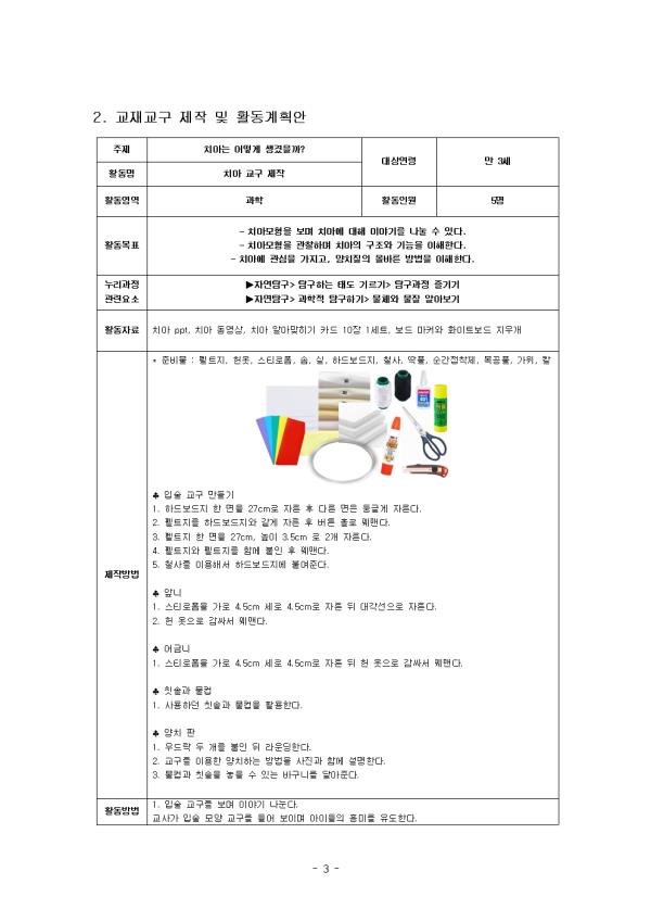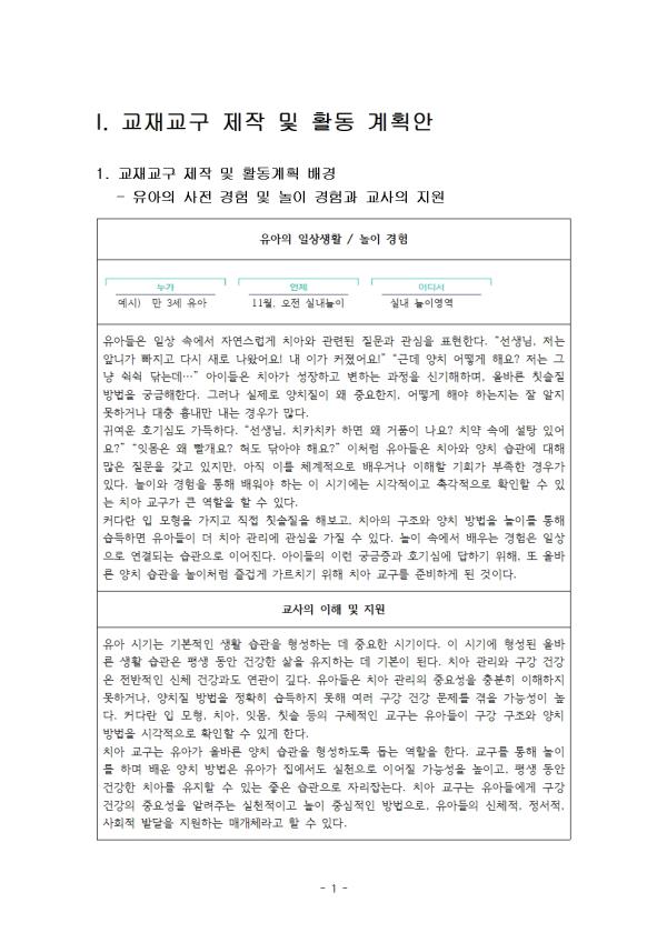 1. ±³Àç±³±¸ Á¦ÀÛ ¹× Ȱµ¿°èȹ ¹è°æ - À¯¾ÆÀÇ »çÀü °æÇè ¹× ³îÀÌ °æÇè°ú ±³»çÀÇ Áö¿ø À¯¾ÆÀÇ ÀÏ»ó»ýȰ / ³îÀÌ °æÇè À¯¾ÆµéÀº ÀÏ»ó ¼Ó¿¡¼ ÀÚ¿¬½º·´°Ô Ä¡¾Æ¿Í °ü·ÃµÈ Áú¹®°ú °ü½ÉÀ» Ç¥ÇöÇÑ´Ù. ¡°¼±»ý´Ô, Àú´Â ¾Õ´Ï°¡ ºüÁö°í ´Ù½Ã »õ·Î ³ª¿Ô¾î¿ä! ³» À̰¡ Ä¿Á³¾î¿ä!¡± ¡°±Ùµ¥ ¾çÄ¡ ¾î¶»°Ô ÇØ¿ä? Àú´Â ±×³É ½½ ´Û´Âµ¥¡¦¡± ¾ÆÀ̵éÀº Ä¡¾Æ°¡ ¼ºÀåÇÏ°í º¯ÇÏ´Â °úÁ¤À» ½Å±âÇØÇϸç, ¿Ã¹Ù¸¥ Ä©¼ÖÁú ¹æ¹ýÀ» ±Ã±ÝÇØÇÑ´Ù. ±×·¯³ª ½ÇÁ¦·Î ¾çÄ¡ÁúÀÌ ¿Ö Áß¿äÇÑÁö, ¾î¶»°Ô ÇØ¾ß ÇÏ´ÂÁö´Â Àß ¾ËÁö ¸øÇϰųª ´ëÃæ Èä³»¸¸ ³»´Â °æ¿ì°¡ ¸¹´Ù. ±Í¿©¿î È£±â½Éµµ °¡µæÇÏ´Ù. ¡°¼±»ý´Ô, ġīġī ÇÏ¸é ¿Ö °ÅǰÀÌ ³ª¿ä? Ä¡¾à ¼Ó¿¡ ¼³ÅÁ ÀÖ¾î¿ä?¡± ¡°ÀÕ¸öÀº ¿Ö »¡°³¿ä? Çôµµ ´Û¾Æ¾ß ÇØ¿ä?¡± ÀÌó·³ À¯¾ÆµéÀº Ä¡¾Æ¿Í ¾çÄ¡ ½À°ü¿¡ ´ëÇØ ¸¹Àº Áú¹®À» °®°í ÀÖÁö¸¸, ¾ÆÁ÷ À̸¦ ü°èÀûÀ¸·Î ¹è¿ì°Å³ª ÀÌÇØÇÒ ±âȸ°¡ ºÎÁ·ÇÑ °æ¿ì°¡ ÀÖ´Ù. ³îÀÌ¿Í °æÇèÀ» ÅëÇØ ¹è¿ö¾ß ÇÏ´Â ÀÌ ½Ã±â¿¡´Â ½Ã°¢ÀûÀ̰í Ã˰¢ÀûÀ¸·Î È®ÀÎÇÒ ¼ö ÀÖ´Â Ä¡¾Æ ±³±¸°¡ Å« ¿ªÇÒÀ» ÇÒ ¼ö ÀÖ´Ù. Ä¿´Ù¶õ ÀÔ ¸ðÇüÀ» °¡Áö°í Á÷Á¢ Ä©¼ÖÁúÀ» ÇØº¸°í, Ä¡¾ÆÀÇ ±¸Á¶¿Í ¾çÄ¡ ¹æ¹ýÀ» ³îÀ̸¦ ÅëÇØ ½ÀµæÇϸé À¯¾ÆµéÀÌ ´õ Ä¡¾Æ °ü¸®¿¡ °ü½ÉÀ» °¡Áú ¼ö ÀÖ´Ù. ³îÀÌ ¼Ó¿¡¼ ¹è¿ì´Â °æÇèÀº ÀÏ»óÀ¸·Î ¿¬°áµÇ´Â ½À°üÀ¸·Î À̾îÁø´Ù. ¾ÆÀ̵éÀÇ ÀÌ·± ±Ã±ÝÁõ°ú È£±â½É¿¡ ´äÇϱâ À§ÇØ, ¶Ç ¿Ã¹Ù¸¥ ¾çÄ¡ ½À°üÀ» ³îÀÌó·³ Áñ°Ì°Ô °¡¸£Ä¡±â À§ÇØ Ä¡¾Æ ±³±¸¸¦ ÁغñÇÏ°Ô µÈ °ÍÀÌ´Ù. ±³»çÀÇ ÀÌÇØ ¹× Áö¿ø À¯¾Æ ½Ã±â´Â ±âº»ÀûÀÎ »ýȰ ½À°üÀ» Çü¼ºÇÏ´Â µ¥ Áß¿äÇÑ ½Ã±âÀÌ´Ù. ÀÌ ½Ã±â¿¡ Çü¼ºµÈ ¿Ã¹Ù¸¥ »ýȰ ½À°üÀº Æò»ý µ¿¾È °Ç°ÇÑ »îÀ» À¯ÁöÇÏ´Â µ¥ ±âº»ÀÌ µÈ´Ù. Ä¡¾Æ °ü¸®¿Í ±¸° °Ç°Àº Àü¹ÝÀûÀÎ ½Åü °Ç°°úµµ ¿¬°üÀÌ ±í´Ù. À¯¾ÆµéÀº Ä¡¾Æ °ü¸®ÀÇ Á߿伺À» ÃæºÐÈ÷ ÀÌÇØÇÏÁö ¸øÇϰųª, ¾çÄ¡Áú ¹æ¹ýÀ» Á¤È®È÷ ½ÀµæÇÏÁö ¸øÇØ ¿©·¯ ±¸° °Ç° ¹®Á¦¸¦ °ÞÀ» °¡´É¼ºÀÌ ³ô´Ù. Ä¿´Ù¶õ ÀÔ ¸ðÇü, Ä¡¾Æ, ÀÕ¸ö, Ä©¼Ö µîÀÇ ±¸Ã¼ÀûÀÎ ±³±¸´Â À¯¾ÆµéÀÌ ±¸° ±¸Á¶¿Í ¾çÄ¡ ¹æ¹ýÀ» ½Ã°¢ÀûÀ¸·Î È®ÀÎÇÒ ¼ö ÀÖ°Ô ÇÑ´Ù. Ä¡¾Æ ±³±¸´Â À¯¾Æ°¡ ¿Ã¹Ù¸¥ ¾çÄ¡ ½À°üÀ» Çü¼ºÇϵµ·Ï µ½´Â ¿ªÇÒÀ» ÇÑ´Ù. ±³±¸¸¦ ÅëÇØ ³îÀ̸¦ ÇÏ¸ç ¹è¿î ¾çÄ¡ ¹æ¹ýÀº À¯¾Æ°¡ Áý¿¡¼µµ ½ÇõÀ¸·Î À̾îÁú °¡´É¼ºÀ» ³ôÀ̰í, Æò»ý µ¿¾È °Ç°ÇÑ Ä¡¾Æ¸¦ À¯ÁöÇÒ ¼ö ÀÖ´Â ÁÁÀº ½À°üÀ¸·Î ÀÚ¸®Àâ´Â´Ù. Ä¡¾Æ ±³±¸´Â À¯¾Æµé¿¡°Ô ±¸° °Ç°ÀÇ Á߿伺À» ¾Ë·ÁÁÖ´Â ½ÇõÀûÀÌ°í ³îÀÌ Áß½ÉÀûÀÎ ¹æ¹ýÀ¸·Î, À¯¾ÆµéÀÇ ½ÅüÀû, Á¤¼Àû, »çȸÀû ¹ß´ÞÀ» Áö¿øÇÏ´Â ¸Å°³Ã¼¶ó°í ÇÒ ¼ö ÀÖ´Ù. - Áß·« - |