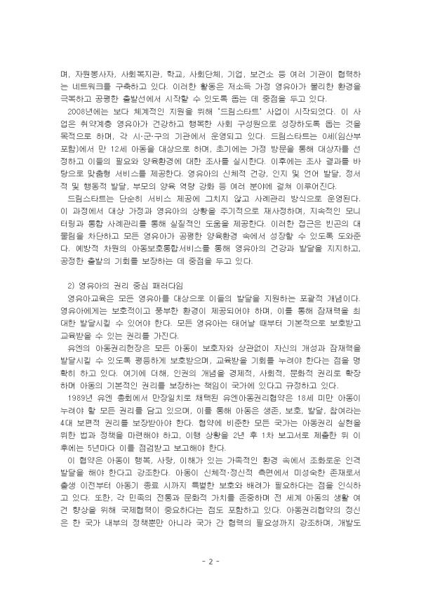 ±³À°Àº °³Àο¡°Ô´Â ÀھƽÇÇöÀÇ ¼ö´ÜÀÌ¸ç ±¹°¡ÀûÀÎ Ãø¸é¿¡¼´Â »çȸ¹ßÀüÀÇ ¼ö´ÜÀÌ´Ù. Áï °³ÀÎÀû Ãø¸é¿¡¼´Â¡®»ç¶÷À» ¸¸µå´Â °Í¡¯ÀÌÁö¸¸, »çȸÀû Ãø¸é¿¡¼´Â ±¹°¡¹ßÀüÀÇ ¿øµ¿·ÂÀ» °³¹ßÇÏ´Â °ÍÀÌ´Ù. ±×·¡¼ °¢ °¡Á¤¿¡¼´Â ¿Ã¹Ù¸¥ »ç¶÷À» ¸¸µé±â À§ÇØ ÀÚ³àµéÀÇ ±³À°¿¡ Àü½ÉÀü·ÂÇϰí, ±¹°¡¿¡¼´Â ±³À°¿¡ ¸¹Àº ÅõÀÚ¸¦ Çϰí ÀÖ´Ù. ¿µÀ¯¾Æ±³À°ÀÇ ÆÐ·¯´ÙÀÓÀº º¸ÆíÁÖÀÇ ÆÐ·¯´ÙÀÓ, ±¹°¡Ã¥ÀÓÀÇ ÆÐ·¯´ÙÀÓ, ¿µÀ¯¾ÆÀÇ ±Ç¸® ¿ì¼±½Ã ÆÐ·¯´ÙÀÓ, ´Ù¾çÇÑ ¿ä±¸ ¸ÂÃãÇü ÆÐ·¯´ÙÀÓÀ¸·Î º¯ÈÇϰí ÀÖ´Ù. Áï, »çȸÀû ¿ä±¸¿¡ µû¶ó º¸ÆíÁÖÀÇ·Î º¯ÈµÇ°í ÀÖÀ¸¸ç, ¸ðµç ±¹¹ÎÀº ¿µÀ¯¾Æ¸¦ °ÇÀüÇÏ°Ô º¸À°ÇÒ Ã¥ÀÓÀ» Áø´Ù. ¿µÀ¯¾Æ±³»ç´Â ¿µÀ¯¾Æ¹ß´Þ¿¡ Áß¿äÇÑ ¿ªÇÒÀ» ¼öÇàÇÑ´Ù. ¿µÀ¯¾ÆÀÇ Æ¯¼ºÀ» °í·ÁÇÏ¿©¾ß Çϸç, ºÎ¸ð¿Í´Â ´Þ¸® ¿µÀ¯¾Æ¸¦ °´°üÀûÀ¸·Î ´ëÇϰí, ÀûÀýÇÑ °Å¸®¸¦ µÎ°í °ü°è¸¦ À¯ÁöÇÑ´Ù. ¶ÇÇÑ Àü¹®Á÷ÀÇ ¼Ó¼ºÀ» °¡Áø ±³À°Àü¹®°¡·Î¼ ºÎ¸ð¸¦ Áö¿øÇÏ¿© ±Ã±ØÀûÀ¸·Î °¡Á¤º¹Áö ÁõÁø¿¡ ±â¿©ÇÑ´Ù. ÇÑÆí, ¿µÀ¯¾Æ±³»ç´Â ¿µÀ¯¾ÆÀÇ ½É½ÅÀ» º¸È£ÇÏ´Â ¾çÀ°ÀÚÀÌÀÚ ±³À°ÇÏ´Â ±³¼öÀÚÀÌ´Ù. ÀÌ ·¹Æ÷Æ®´Â ¿µÀ¯¾Æ±³À°ÀÇ ÆÐ·¯´ÙÀÓ¿¡ ´ëÇØ ±â¼úÇϰí, ¿µÀ¯¾Æ±³»çÀÇ Á߿伺 ¹× ¿ªÇÒ¿¡ ´ëÇØ ¼³¸íÇÏ¿´´Ù. II. º» ·Ð 1. ¿µÀ¯¾Æ±³À°ÀÇ ÆÐ·¯´ÙÀÓ 1) ±¹°¡Ã¥ÀÓÀÇ º¸ÆíÁÖÀÇ ÆÐ·¯´ÙÀÓ ¿ì¸®³ª¶ó´Â º¸À°°ú À¯¾Æ±³À°À» »çȸº¹ÁöÀÇ Áß¿äÇÑ ¿µ¿ªÀ¸·Î º¸°í ±¹°¡Â÷¿ø¿¡¼ À̸¦ Ã¥ÀÓÁö±â À§ÇÑ Á¦µµ¸¦ ¸¶·ÃÇϰí ÀÖ´Ù. Àú¼ÒµæÃþ ÀÚ³àµé¿¡°Ô °øÆòÇÑ Ãâ¹ß ±âȸ¸¦ Á¦°øÇϱâ À§ÇØ ¹Ì±¹ÀÇ ¡®Çìµå½ºÅ¸Æ®(Head Start)¡¯ ÇÁ·Î±×·¥°ú À¯»çÇÑ ¸ñÀûÀ» °¡Áø Á¤Ã¥À» ½ÃÇàÇϰí ÀÖ´Ù. ±× ÀÏȯÀ¸·Î Àú¼ÒµæÃþ ¹ÐÁýÁö¿ª¿¡ »õ¸¶À» Çùµ¿À¯¾Æ¿øÀ» ¿ì¼±ÀûÀ¸·Î ¼³Ä¡ÇØ º¸À°°ú ±³À°À» Áö¿øÇϸç, »çȸÀû ºÒÆòµîÀ» ¿ÏÈÇϱâ À§ÇÑ ³ë·ÂÀ» ±â¿ïÀ̰í ÀÖ´Ù. ¶ÇÇÑ, 2000³â´ë Ãʹݿ¡´Â À§½ºÅ¸Æ®(We Start) ¿îµ¿À» µµÀÔÇÏ¿© ¿µÀ¯¾Æ¿¡°Ô ¾çÁúÀÇ º¸À°¡¤±³À° ¼ºñ½º¸¦ Á¦°øÇϰí ÀÖ´Ù. À§½ºÅ¸Æ® ¿îµ¿Àº ´ÜÁö º¸À°°ú ±³À°¸¸ Á¦°øÇÏ´Â °ÍÀÌ ¾Æ´Ï¶ó °¡Á¤°ú ºÎ¸ð¸¦ Áö¿øÇϰí Áö¿ª»çȸ¿Í ¿¬°èÇÏ¿© Ãë¾à°èÃþ ¿µÀ¯¾ÆµéÀ» ´Ù°¢µµ·Î µ½´Â Æ÷°ýÀû ¼ºñ½º Á¦°øÀ» ¸ñÇ¥·Î ÇÑ´Ù. À̸¦ ÅëÇØ ¿µÀ¯¾Æ°¡ °¡Á¤, Áö¿ª»çȸ, ±×¸®°í ´Ù¾çÇÑ ±â°üÀÇ µµ¿òÀ» ¹Þ¾Æ °Ç°Çϸç ÇູÇÑ È¯°æ¿¡¼ ¼ºÀåÇÒ ¼ö ÀÖµµ·Ï µ½°í ÀÖ´Ù. À§½ºÅ¸Æ® ¿îµ¿Àº ¸¶À»¼¾Å͸¦ Áß½ÉÀ¸·Î Áö¿ª»çȸÀÇ ´Ù¾çÇÑ ÀÚ¿øÀ» Ȱ¿ëÇϰí ÀÖÀ¸¸ç, ÀÚ¿øºÀ»çÀÚ, »çȸº¹Áö°ü, Çб³, »çȸ´Üü, ±â¾÷, º¸°Ç¼Ò µî ¿©·¯ ±â°üÀÌ Çù·ÂÇÏ´Â ³×Æ®¿öÅ©¸¦ ±¸ÃàÇϰí ÀÖ´Ù. ÀÌ·¯ÇÑ È°µ¿Àº Àú¼Òµæ °¡Á¤ ¿µÀ¯¾Æ°¡ ºÒ¸®ÇÑ È¯°æÀ» ±Øº¹ÇÏ°í °øÆòÇÑ Ãâ¹ß¼±¿¡¼ ½ÃÀÛÇÒ ¼ö ÀÖµµ·Ï µ½´Â µ¥ ÁßÁ¡À» µÎ°í ÀÖ´Ù. 2008³â¿¡´Â º¸´Ù ü°èÀûÀÎ Áö¿øÀ» À§ÇØ ¡®µå¸²½ºÅ¸Æ®¡¯ »ç¾÷ÀÌ ½ÃÀ۵Ǿú´Ù. ÀÌ »ç¾÷Àº Ãë¾à°èÃþ ¿µÀ¯¾Æ°¡ °Ç°Çϰí ÇູÇÑ »çȸ ±¸¼º¿øÀ¸·Î ¼ºÀåÇϵµ·Ï µ½´Â °ÍÀ» ¸ñÀûÀ¸·Î Çϸç, °¢ ½Ã¡¤±º¡¤±¸ÀÇ ±â°ü¿¡¼ ¿î¿µµÇ°í ÀÖ´Ù. µå¸²½ºÅ¸Æ®´Â 0¼¼(ÀÓ»êºÎ Æ÷ÇÔ)¿¡¼ ¸¸ 12¼¼ ¾Æµ¿À» ´ë»óÀ¸·Î Çϸç, Ãʱ⿡´Â °¡Á¤ ¹æ¹®À» ÅëÇØ ´ë»óÀÚ¸¦ ¼±Á¤Çϰí À̵éÀÇ ÇÊ¿ä¿Í ¾çÀ°È¯°æ¿¡ ´ëÇÑ Á¶»ç¸¦ ½Ç½ÃÇÑ´Ù. ÀÌÈÄ¿¡´Â Á¶»ç °á°ú¸¦ ¹ÙÅÁÀ¸·Î ¸ÂÃãÇü ¼ºñ½º¸¦ Á¦°øÇÑ´Ù. ¿µÀ¯¾ÆÀÇ ½ÅüÀû °Ç°, ÀÎÁö ¹× ¾ð¾î ¹ß´Þ, Á¤¼Àû ¹× ÇൿÀû ¹ß´Þ, ºÎ¸ðÀÇ ¾çÀ° ¿ª·® °È µî ¿©·¯ ºÐ¾ß¿¡ °ÉÃÄ ÀÌ·ç¾îÁø´Ù. µå¸²½ºÅ¸Æ®´Â ´Ü¼øÈ÷ ¼ºñ½º Á¦°ø¿¡ ±×Ä¡Áö ¾Ê°í »ç·Ê°ü¸® ¹æ½ÄÀ¸·Î ¿î¿µµÈ´Ù. ÀÌ °úÁ¤¿¡¼ ´ë»ó °¡Á¤°ú ¿µÀ¯¾ÆÀÇ »óȲÀ» ÁÖ±âÀûÀ¸·Î Àç»çÁ¤Çϸç, Áö¼ÓÀûÀÎ ¸ð´ÏÅ͸µ°ú ÅëÇÕ »ç·Ê°ü¸®¸¦ ÅëÇØ ½ÇÁúÀûÀÎ µµ¿òÀ» Á¦°øÇÑ´Ù. ÀÌ·¯ÇÑ Á¢±ÙÀº ºó°ïÀÇ ´ë¹°¸²À» Â÷´ÜÇÏ°í ¸ðµç ¿µÀ¯¾Æ°¡ °øÆòÇÑ ¾çÀ°È¯°æ ¼Ó¿¡¼ ¼ºÀåÇÒ ¼ö ÀÖµµ·Ï µµ¿ÍÁØ´Ù. ¿¹¹æÀû Â÷¿øÀÇ ¾Æµ¿º¸È£ÅëÇÕ¼ºñ½º¸¦ ÅëÇØ ¿µÀ¯¾ÆÀÇ °Ç°°ú ¹ß´ÞÀ» ÁöÁöÇϰí, °øÁ¤ÇÑ Ãâ¹ßÀÇ ±âȸ¸¦ º¸ÀåÇÏ´Â µ¥ ÁßÁ¡À» µÎ°í ÀÖ´Ù. 2) ¿µÀ¯¾ÆÀÇ ±Ç¸® Á᫐ ÆÐ·¯´ÙÀÓ ¿µÀ¯¾Æ±³À°Àº ¸ðµç ¿µÀ¯¾Æ¸¦ ´ë»óÀ¸·Î À̵éÀÇ ¹ß´ÞÀ» Áö¿øÇÏ´Â Æ÷°ýÀû °³³äÀÌ´Ù. ¿µÀ¯¾Æ¿¡°Ô´Â º¸È£ÀûÀ̰í dzºÎÇÑ È¯°æÀÌ Á¦°øµÇ¾î¾ß Çϸç, À̸¦ ÅëÇØ ÀáÀç·ÂÀ» ÃÖ´ëÇÑ ¹ß´Þ½Ãų ¼ö ÀÖ¾î¾ß ÇÑ´Ù. ¸ðµç ¿µÀ¯¾Æ´Â ž ¶§ºÎÅÍ ±âº»ÀûÀ¸·Î º¸È£¹Þ°í ±³À
