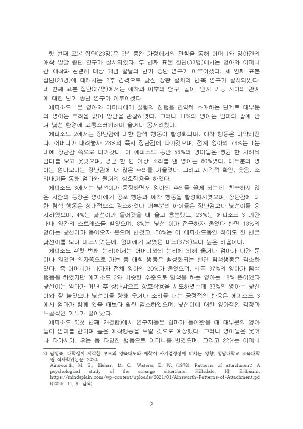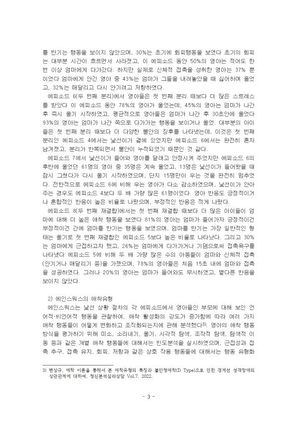 ¿À´Ã³¯ °¡Á·±¸Á¶ÀÇ º¯È·Î ºÎ¸ðµéÀÇ Àڳ࿡ ´ëÇÑ °ü½ÉÀº º¸´Ù Áõ°¡µÇ°í ÀÖ´Ù. ÀÌ·Î ÀÎÇÏ¿© Àڳ࿡ ´ëÇÑ °úº¸È£ °úÀ× °£¼·ÀÌ ÀÚ³àµéÀÇ Á¤¼¹ß´Þ ¹× ¼º°Ý µî¿¡ ¿ª±â´ÉÀûÀÎ ¿µÇâÀ» ¹ÌÄ¥ ¼öµµ ÀÖ´Ù. ƯÈ÷, ¾ÖÂøÀº ¿µ¾Æ¿Í ¾î¸Ó´Ï °£ÀÇ À¯´ë°ü°è¸¦ ¼³¸íÇÏ´Â °³³äÀ¸·Î, ´Ù¸¥ »ç¶÷¿¡°Ô Á¢±ÙÀ» Ãß±¸Çϰí À¯ÁöÇÏ·Á´Â Çൿ, ȤÀº ±× Á¢±ÙÀÌ ¼Õ»óµÇ¾úÀ» ¶§ ±×°ÍÀ» ȸº¹½ÃŰ·Á´Â ÇൿÀÌ´Ù. ÀÌ·¯ÇÑ ¿µ¾ÆÀÇ Çൿ¾ç½ÄÀº ±×µéÀÌ ¸ÎÀº ¾ÖÂøÀÇ ÁúÀÌ ¾î¶°ÇϳĿ¡ µû¶ó Á¤ÇØÁø´Ù. ÀÌ·¯ÇÑ ÀüÁ¦ ¼Ó¿¡¼ ¾ÖÂøÀÇ ÁúÀ» ÃøÁ¤Çϱâ À§ÇØ º¼ºñ(John Mostyn Bowlby)ÀÇ Á¦ÀÚÀÎ ¿¡Àνº¿ö½º(Mary Ainsworth)´Â ¡®³¸¼± »óȲ½ÇÇ衯À» °³¹ßÇØ ³Â´Ù. ¿¡Àνº¿ö½º(Mary Ainsworth)´Â ¡°³¸¼± »óȲ¡±À̶ó°í ºÒ¸®´Â °íµµ·Î Á¶Á÷ÈµÈ ½ÇÇè½Ç »óȲ¿¡¼ »ýÈÄ 12°³¿ù¿¡¼ 18°³¿ù »çÀÌÀÇ ¿µ¾ÆµéÀ» ´ë»óÀ¸·Î ½ÇÇèÇÏ¿´´Ù. ¿¡Àνº¿ö½º´Â ¿µ¾Æ°¡ ¾çÀ°ÀÚ¿Í ³¸¼± »ç¶÷°ú ºÐ¸®¿Í Àç°áÇյǴ ¿¡ÇǼҵ带 °æÇèÇÏ¸é¼ µµÃâµÇ´Â ´Ù¾çÇÑ ¹ÝÀÀÀ» ¾ÖÂøÀ¯Çü¿¡ µû¶ó ºÐ·ùÇÏ¿´´Ù. ¿¬±¸ÀÇ °á°ú¸¦ Åä´ë·Î ¾î¸°¾ÆÀ̵éÀÇ ¾ÖÂøÀ¯ÇüÀ» ¡®¾ÈÁ¤Çü¡¯, ¡®ºÒ¾ÈÁ¤ ȸÇÇÇü¡¯, ¡®ºÒ¾ÈÁ¤ ÀúÇ×Çü¡¯ÀÇ ¼¼ ÇüÅ·ΠÀ¯ÇüÈÇÏ¿´´Ù. ÀÌ ·¹Æ÷Æ®´Â °ÀÇ ¹× ±³Àç 4° ¡°¾ÖÂø°ú ºÎ¸ð-ÀÚ³à°ü°è¡±¿¡¼ ¿¡Àνº¿ö½ºÀÇ ÀÌ·ÐÀ» ¹ÙÅÁÀ¸·Î ¾ÖÂøÀ¯Çü¿¡ ´ëÇØ ÇмúÀûÀ¸·Î Á¤¸®ÇÑ ÈÄ, ³ª¿Í °¡Á·(¶Ç´Â ³ª¿Í °ü°è¸Î°í ÀÖ´Â »ç¶÷µé)ÀÇ ¾ÖÂøÀ¯ÇüÀ» ºÐ¼®Çϰí, ¹è¿îÁ¡°ú ´À³¤Á¡À» ±â¼úÇÏ¿´´Ù. II. º» ·Ð 1. ¿¡Àνº¿ö½ºÀÇ ¾ÖÂøÀ¯Çü 1) ¿¡Àνº¿ö½ºÀÇ ¾ÖÂø ¿¬±¸ ¿¡Àνº¿ö½º´Â ¾ÖÂøÀ̶õ µÎ »ç¶÷ »çÀÌÀÇ ¾ÖÁ¤Àû ¹× Á¤¼Àû À¯´ë¸¦ ÀǹÌÇÏ´Â °ÍÀ¸·Î ¾ÖÂø ´ë»ó°ú ±ÙÁ¢Çϰí Á¢ÃËÇÏ·Á´Â ¼ºÇâÀ» Áö¼ÓÀûÀ¸·Î °®°í ÀÖ´Â Àΰ£ÀÇ ³»Àû »óŸ¦ ³ªÅ¸³»´Â °ÍÀ̶ó°í °³³äÈÇÏ¿´´Ù. ¿¡Àνº¿ö½º´Â ¹Ì±¹ º¼Æ¼¸ð¾î(Baltimore) Áö¿ª¿¡¼ ³¸¼± »óȲ ÀýÂ÷¸¦ »ç¿ëÇÏ¿© ¹éÀÎ Áß·ùÃþ °¡Á¤ÀÇ ¿µ¾Æ 106¸í(48ÁÖ 6ÀÏ-57ÁÖ 6ÀÏ)°ú ±×µéÀÇ ¾î¸Ó´Ï¸¦ ´ë»óÀ¸·Î ¿¬±¸ÇÏ¿´´Ù. °¢±â µ¶¸³ÀûÀÎ ³× °³ÀÇ Ç¥º» Áý´ÜÀº 1¼¼ ¶§ ³¸¼± »óȲ ÀýÂ÷¸¦ ÅëÇØ ¿µ¾Æ ¾ÖÂø Çൿ¿¡ ´ëÇÑ °üÂû°ú ¾ÖÂø À¯Çü ºÐ·ù°¡ ÀÌ·ç¾îÁ³´Ù. ù ¹øÂ° Ç¥º» Áý´Ü(23¸í)Àº 5³â µ¿¾È °¡Á¤¿¡¼ÀÇ °üÂûÀ» ÅëÇØ ¾î¸Ó´Ï¿Í ¿µ¾Æ°£ÀÇ ¾ÖÂø ¹ß´Þ Á¾´Ü ¿¬±¸°¡ ½Ç½ÃµÇ¾ú´Ù. µÎ ¹øÂ° Ç¥º» Áý´Ü(33¸í)¿¡¼´Â ¿µ¾Æ¿Í ¾î¸Ó´Ï°£ ¾ÖÂø°ú °ü·ÃÇØ ´ë»ó °³³ä ¹ß´ÞÀÇ ´Ü±â Á¾´Ü ¿¬±¸°¡ ÀÌ·ç¾îÁ³´Ù. ¼¼ ¹øÂ° Ç¥º» Áý´Ü(23¸í)¿¡ ´ëÇØ¼´Â 2ÁÖ °£°ÝÀ¸·Î ³¸¼± »óȲ ÀýÂ÷ÀÇ ¹Ýº¹ ¿¬±¸°¡ ½Ç½ÃµÇ¾ú´Ù. ³× ¹øÂ° Ç¥º» Áý´Ü(27¸í)¿¡¼´Â ¾ÖÂø°ú ÀÌÈÄÀÇ Å½±¸, ³îÀÌ, ÀÎÁö ±â´É »çÀÌÀÇ °ü°è¿¡ ´ëÇÑ ´Ü±â Á¾´Ü ¿¬±¸°¡ ÀÌ·ç¾îÁ³´Ù. ¿¡ÇǼҵå 1Àº ¿µ¾Æ¿Í ¾î¸Ó´Ï¿¡°Ô ½ÇÇèÀÇ ÁøÇàÀ» °£·«È÷ ¼Ò°³ÇÏ´Â ´Ü°è·Î ´ëºÎºÐÀÇ ¿µ¾Æ´Â µÎ·Á¿ò ¾øÀÌ ¹æ¾ÈÀ» °üÂûÇÏ¿´´Ù. ±×·¯³ª 11%ÀÇ ¿µ¾Æ´Â ¾ö¸¶ÀÇ ÆÈ¿¡ ¾È°Ü ³¸¼± ȯ°æ¿¡ °íÅ뽺·¯¿öÇÏ¸ç ¿ï°Å³ª ¸ö¼¸®ÃÆ´Ù. ¿¡ÇǼҵå 2¿¡¼´Â Àå³°¨¿¡ ´ëÇÑ Å½»ö ÇൿÀÌ È°¼ºÈµÇ¸ç, ¾ÖÂø ÇൿÀº ¹Ì¾àÇØÁø´Ù. ¾î¸Ó´Ï°¡ ³»·Á³õÀÚ 28%ÀÇ Áï½Ã Àå³°¨¿¡ ´Ù°¡°¬À¸¸ç, Àüü ¿µ¾ÆÀÇ 78%´Â 1ºÐ³»¿¡ Àå³°¨ ÂÊÀ¸·Î ´Ù°¡°¬´Ù. ÀÌ ¿¡ÇÇ¼Òµå µ¿¾È 53%ÀÇ ¿µ¾ÆµéÀº Æò±Õ ÇÑ Â÷·Ê¾¿ ¾ö¸¶¸¦ º¸°í ¿ô¾úÀ¸¸ç, Æò±Õ ÇÑ ¹ø ÀÌ»ó ¼Ò¸®¸¦ ³½ ¿µ¾Æ´Â 80%¿´´Ù. ´ëºÎºÐÀÇ ¿µ¾Æ´Â ¾ö¸¶º¸´Ù´Â Àå³°¨¿¡ ´õ ¸¹Àº ÁÖÀǸ¦ ±â¿ï¿´´Ù. ±×¸®°í ½Ã°¢Àû È®ÀÎ, ¿ôÀ½, ¼Ò¸®³»±â¸¦ ÅëÇØ ¾ö¸¶¿Í ¿ø°Å¸® »óÈ£ÀÛ¿ëÀ» ÇÏ¿´´Ù. ¿¡ÇǼҵå 3¿¡¼´Â ³¸¼±À̰¡ µîÀåÇÏ¸é¼ ¿µ¾ÆÀÇ ÁÖÀǸ¦ ²ø°Ô µÇ´Âµ¥, Ä£¼÷ÇÏÁö ¾ÊÀº »ç¶÷ÀÇ µîÀåÀº ¿µ¾Æ¿¡°Ô °øÆ÷ Çൿ°ú ¾ÖÂø ÇൿÀ» Ȱ¼ºÈ½ÃÄ×À¸¸ç, Àå³°¨¿¡ ´ëÇÑ Å½»ö ÇൿÀº »ó´ëÀûÀ¸·Î °¨¼ÒÇÏ¿´´Ù ´ëºÎºÐÀÇ ¾ÆÀ̵éÀº Àå³°¨º¸´Ù ³¸¼±À̸¦ ÀÀ½ÃÇÏ¿´À¸¸ç, 4%´Â ³¸¼±À̰¡ µé¾î°¬À» ¶§ ¿ï°í ÈïºÐÇß°í, 23%´Â ¿¡ÇǼҵå 3 ±â°£ ³»³» ¾à°£ÀÇ ½ºÆ®·¹½º¸¦ ¹Þ¾ÒÀ¸¸ç, 8%´Â ³¸¼± À̰¡ Á¢±ÙÇÏÀÚ ¿ï¾ú´Ù ¹Ý¸é 18%ÀÇ ¿µ¾Æ´Â ³¸¼±À̰¡ µé¾î¿ÀÀÚ ¿ôÀ¸¸ç ¹Ý°å°í, 58%´Â ÀÌ ¿¡ÇǼҵ嵿¾È Àû¾îµµ ÇÑ ¹øÀº ³¸¼±À̸¦ º¸¸ç ¹Ì¼ÒÁö¾ú´Âµ¥, ¾ö¸¶¿¡°Ô º¸¿´´ø ¹Ì¼Ò(37%)º¸´Ù ³ôÀº ºñÀ²ÀÌ´Ù. ¿¡ÇǼҵå 4(ù ¹øÂ° ºÐ¸®)¿¡¼´Â ¾î¸Ó´Ï¿ÍÀÇ ºÐ¸®¿¡ ÀÇÇØ ¿ï°Å³ª ¾ö¸¶°¡ ³ª°£ ¹®À̳ª ¾É¾Ò´ø ÀÇÀÚÂÊÀ¸·Î °¡´Â µî ¾ÖÂø ÇൿÀº Ȱ¼ºÈµÇ´Â ¹Ý¸é Ž»öÇൿÀº °¨¼ÒÇÏ¿´´Ù. Áï ¾î¸Ó´Ï