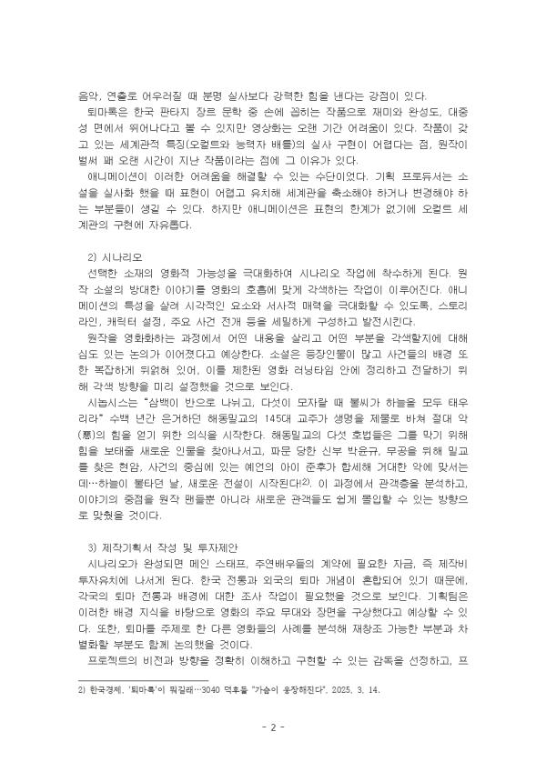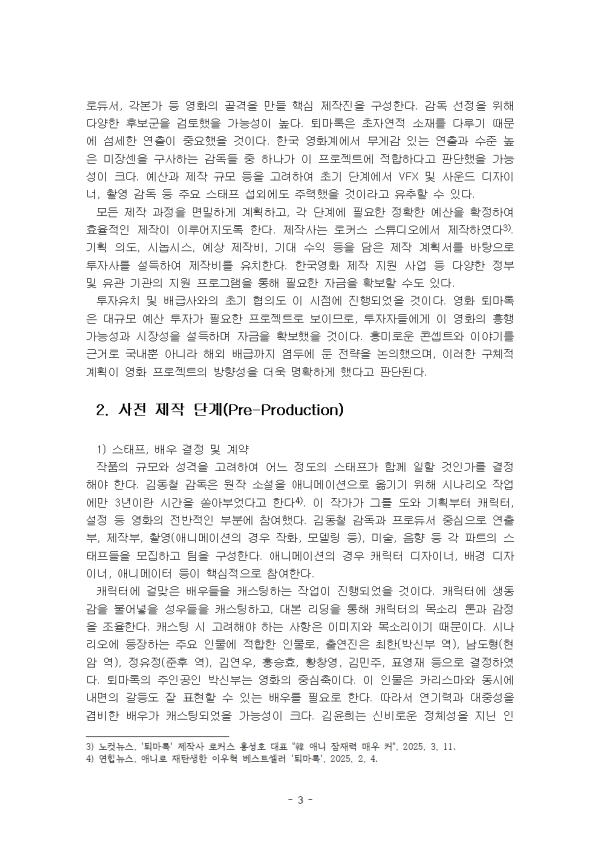 ¿µÈ±âȹ ¹× Á¦ÀÛÀÇ ´Ü°è´Â ¸ÕÀú, ¿µÈ±âȹÀ¸·Î ¾ÆÀ̵ð¾î¸¦ Â¥³»°í ½Ã³ª¸®¿À¸¦ ¿Ï¼ºÇÒ ¶§±îÁöÀÇ °úÁ¤ÀÌ´Ù. »çÀü Á¦ÀÛ ´Ü°è´Â Á¦ÀÛ ¿¹»ê È®º¸, °¨µ¶, ÃÔ¿µ°¨µ¶ ¹× ½ºÅÂÇÁ ±¸¼º, ¹è¿ì ¼±Á¤, Àå¼ÒÇåÆÃ, ½ºÅ丮º¸µå, ÄÜÆ¼ µî ÃÔ¿µ Àü ¸ðµç Áغñ¸¦ ³¡³»´Â ´Ü°è¸¦ ÀÏÄ´´Ù. Á¦ÀÛ ´Ü°è´Â ÃÔ¿µ °úÁ¤ÀÌ´Ù. ÃÔ¿µÀ» Å©·©Å©ÀÎÇÑ ÈĺÎÅÍ ÃÔ¿µÀÌ ¸ðµÎ ³¡³ª´Â ´Ü°è´Ù. ÈÄ¹Ý ÀÛ¾÷ ´Ü°è´Â ÃÔ¿µÀÌ ³¡³ ÈÄ ÆíÁý, Ư¼öÈ¿°ú, »ç¿îµå ÀÛ¾÷À» °ÅÃÄ »ó¿µ, ¹è±ÞÀ» À§ÇÑ ¿µÈ¸¦ ÃÖÁ¾ ¿Ï¼º½ÃŰ´Â ´Ü°è´Ù. ¸¶Áö¸·À¸·Î ¸¶ÄÉÆÃ, ¹è±Þ, »ó¿µ ´Ü°è´Â ÃÖÁ¾ ¿Ï¼ºµÈ ¿µÈ¸¦ ´Ù¾çÇÑ ¹æ¹ýÀ¸·Î ¹è±Þ, »ó¿µÇÑ´Ù. ¿µÈ ¡®Å𸶷ϡ¯Àº 3D ¾Ö´Ï¸ÞÀ̼ÇÀ¸·Î 2025³â 2¿ù 21ÀÏ °³ºÀÇß´Ù. ÀÌ ¿µÈ´Â Ưº°ÇÑ ´É·ÂÀ» °¡Áø Å𸶻çµéÀÌ Àý´ë ¾Ç(äÂ)¿¡ ¸Â¼´Â ´ë¼»çÀÇ ½ÃÀÛÀ» ´ãÀº ¿ÀÄÃÆ®´Ù. ¿µÈ ¡®Å𸶷ϡ¯Àº ÀÌ¿ìÇõ ÀÛ°¡ÀÇ 1993³â Ãâ°£µÈ ¼Ò¼³ ¡®Å𸶷ϡ¯¿¡ ¹ÙÅÁÀ» µÎ°í ÀÖ´Ù. 1993³â ¿¬À縦 ½ÃÀÛÇØ ÆÇ¸Å ºÎ¼ö 1,000¸¸ ºÎ¸¦ ³ÑÀº º£½ºÆ®¼¿·¯ÀÌ´Ù. ÀÌ ·¹Æ÷Æ®´Â 2025³â¿¡ ±ØÀå¿¡¼ °³ºÀÇÑ Çѱ¹ ¿µÈ Å𸶷ÏÀ» ¼±Á¤ÇÏ¿©, ÇØ´ç ¿µÈÀÇ ¿µÈ±âȹ ¹× Á¦ÀÛÀÇ °¢ ´Ü°è¸¦ ¼³¸íÇÏ¿´´Ù. II. º» ·Ð 1. ¿µÈ±âȹ 1) ¼ÒÀç ¼±Åðú °³¹ß ¿µÈ±âȹÀÇ ½ÃÀÛÀº ¹Ù·Î ¼ÒÀ縦 ã´Â ÀÏÀÌ´Ù. ¿µÈ Å𸶷ÏÀº ÀÌ¿ìÇõ ÀÛ°¡ÀÇ µ¿¸í ¼Ò¼³À» ¿øÀÛÀ¸·Î ÇÑ´Ù. ÆÄ¹®´çÇÑ ½ÅºÎ ¹ÚÀ±±Ô, »óóÀÔÀº ÆÄÀÌÅÍ ÀÌÇö¾Ï, ¿¹¾ðÇÏ´Â ¾ÆÀÌ ÀåÁØÈÄ, ½ÅÀÇ ¾Æ¹ÙŸ Çö½ÂÈñ µîÀÌ Ã⿬ÇÑ´Ù. °¢±â »ç¿¬µµ ±â¼úµµ ´Ù¸¥ ³×¸íÀÇ Å𸶻ç´Â ¼±ÇÑ »ç¶÷µéÀ» ¾ÇÀ¸·Î ±¸Çϱâ À§ÇØ ÈûÀ» ÇÕÄ£´Ù. ¹«Çù, ¿¢¼Ò½ÃÁò, Á¾±³, ½ÅÈ, Àü¼³ µî ´Ù¾çÇÑ ¹Î¼Ó ¿ä¼Ò¸¦ È¥ÇÕÇÑ ¼¼°è°üÀº Çö´ëÀûÀΠij¸¯ÅÍ ÇØ¼®°ú µðÀÚÀÎ, ¹Ðµµ ³ôÀº ½Ã°¢È¿°ú¸¦ ¸¸³ª ÀÌÀü°ú ´Ù¸¥ °æÇèÀÇ ÀåÀ» ÀçâÁ¶ÇÑ´Ù. ÀÌ ÀÛǰÀº 1990³â´ëºÎÅÍ ²ÙÁØÈ÷ »ç¶û¹Þ¾Æ¿Â ±¹³» ÆÇŸÁö ¼Ò¼³ Áß Çϳª·Î, Çö´ëÀûÀÎ Å𸶠¼¼°è°ü°ú öÇÐÀû Áú¹®ÀÌ ÀûÀýÈ÷ °áÇÕµÈ ÀÛǰÀÌ´Ù. Á¦Àۻ簡 ÀÌ ¼Ò¼³À» ¿µÈÈÇϱâ·Î °áÁ¤Çß´Ù°í º»´Ù¸é, Å𸶶ó´Â µ¶Æ¯ÇÑ ¼ÒÀç°¡ ÁÖ´Â ½Å¼±ÇÔ°ú ¿©ÀüÈ÷ À¯È¿ÇÑ ¿øÀÛÀÇ ÆÒ´ýÀÌ ÀÌ °°Àº °áÁ¤¿¡ ¿µÇâÀ» ¹ÌÃÆÀ» °ÍÀÌ´Ù. ¾Ö´Ï¸ÞÀ̼ÇÀº °¨°¢ÀûÀ¸·Î ÀþÀº À帣´Ù. ÀþÀº ¼¼´ëµéÀÌ ºÁ¾ß ÇÑ´Ù´Â Àǹ̴ ¾Æ´Ï´Ù. ºñÁÖ¾óÀûÀ¸·Î °¨°¢ÀûÀ̰í ÃÖ½ÅÀÇ ±â¼úÀ» ´ãÀ» ¼ö ÀÖÀ¸¸ç ÀÌ·± ¿ä¼ÒµéÀÌ ¿¬±â, À½¾Ç, ¿¬Ãâ·Î ¾î¿ì·¯Áú ¶§ ºÐ¸í ½Ç»çº¸´Ù °·ÂÇÑ ÈûÀ» ³½´Ù´Â °Á¡ÀÌ ÀÖ´Ù. Å𸶷ÏÀº Çѱ¹ ÆÇŸÁö À帣 ¹®ÇÐ Áß ¼Õ¿¡ ²ÅÈ÷´Â ÀÛǰÀ¸·Î Àç¹Ì¿Í ¿Ï¼ºµµ, ´ëÁß¼º ¸é¿¡¼ ¶Ù¾î³ª´Ù°í º¼ ¼ö ÀÖÁö¸¸ ¿µ»óÈ´Â ¿À·£ ±â°£ ¾î·Á¿òÀÌ ÀÖ´Ù. ÀÛǰÀÌ °®°í ÀÖ´Â ¼¼°è°üÀû Ư¡(¿ÀÄÃÆ®¿Í ´É·ÂÀÚ ¹èƲ)ÀÇ ½Ç»ç ±¸ÇöÀÌ ¾î·Æ´Ù´Â Á¡, ¿øÀÛÀÌ ¹ú½á ²Ï ¿À·£ ½Ã°£ÀÌ Áö³ ÀÛǰÀ̶ó´Â Á¡¿¡ ±× ÀÌÀ¯°¡ ÀÖ´Ù. ¾Ö´Ï¸ÞÀ̼ÇÀÌ ÀÌ·¯ÇÑ ¾î·Á¿òÀ» ÇØ°áÇÒ ¼ö ÀÖ´Â ¼ö´ÜÀ̾ú´Ù. ±âȹ ÇÁ·Îµà¼´Â ¼Ò¼³À» ½Ç»çÈ ÇßÀ» ¶§ Ç¥ÇöÀÌ ¾î·Æ°í À¯Ä¡ÇØ ¼¼°è°üÀ» Ãà¼ÒÇØ¾ß Çϰųª º¯°æÇØ¾ß ÇÏ´Â ºÎºÐµéÀÌ »ý±æ ¼ö ÀÖ´Ù. ÇÏÁö¸¸ ¾Ö´Ï¸ÞÀ̼ÇÀº Ç¥ÇöÀÇ ÇѰ谡 ¾ø±â¿¡ ¿ÀÄÃÆ® ¼¼°è°üÀÇ ±¸Çö¿¡ ÀÚÀ¯·Ó´Ù. 2) ½Ã³ª¸®¿À ¼±ÅÃÇÑ ¼ÒÀçÀÇ ¿µÈÀû °¡´É¼ºÀ» ±Ø´ëÈÇÏ¿© ½Ã³ª¸®¿À ÀÛ¾÷¿¡ Âø¼öÇÏ°Ô µÈ´Ù. ¿øÀÛ ¼Ò¼³ÀÇ ¹æ´ëÇÑ À̾߱⸦ ¿µÈÀÇ È£Èí¿¡ ¸Â°Ô °¢»öÇÏ´Â ÀÛ¾÷ÀÌ ÀÌ·ç¾îÁø´Ù. ¾Ö´Ï¸ÞÀ̼ÇÀÇ Æ¯¼ºÀ» »ì·Á ½Ã°¢ÀûÀÎ ¿ä¼Ò¿Í ¼»çÀû ¸Å·ÂÀ» ±Ø´ëÈÇÒ ¼ö ÀÖµµ·Ï, ½ºÅ丮¶óÀÎ, ij¸¯ÅÍ ¼³Á¤, ÁÖ¿ä »ç°Ç Àü°³ µîÀ» ¼¼¹ÐÇÏ°Ô ±¸¼ºÇÏ°í ¹ßÀü½ÃŲ´Ù. ¿øÀÛÀ» ¿µÈÈÇÏ´Â °úÁ¤¿¡¼ ¾î¶² ³»¿ëÀ» »ì¸®°í ¾î¶² ºÎºÐÀ» °¢»öÇÒÁö¿¡ ´ëÇØ ½Éµµ ÀÖ´Â ³íÀǰ¡ À̾îÁ³´Ù°í ¿¹»óÇÑ´Ù. ¼Ò¼³Àº µîÀåÀι°ÀÌ ¸¹°í »ç°ÇµéÀÇ ¹è°æ ¶ÇÇÑ º¹ÀâÇÏ°Ô µÚ¾ôÇô ÀÖ¾î, À̸¦ Á¦ÇÑµÈ ¿µÈ ·¯´×ŸÀÓ ¾È¿¡ Á¤¸®Çϰí Àü´ÞÇϱâ À§ÇØ °¢»ö ¹æÇâÀ» ¹Ì¸® ¼³Á¤ÇßÀ» °ÍÀ¸·Î º¸ÀδÙ. ½Ã³ñ½Ã½º´Â ¡°»ï¹éÀÌ ¹ÝÀ¸·Î ³ª´µ°í, ´Ù¼¸ÀÌ ¸ðÀÚ¶ö ¶§ ºÒ¾¾°¡ ÇÏ´ÃÀ» ¸ðµÎ Å¿츮¶ó¡± ¼ö¹é ³â°£ Àº°ÅÇÏ´ø ÇØµ¿¹Ð±³ÀÇ 145´ë ±³ÁÖ°¡ »ý¸íÀ» Á¦¹°·Î ¹ÙÃÄ Àý´ë ¾Ç(äÂ)ÀÇ ÈûÀ» ¾ò±â À§ÇÑ ÀǽÄÀ» ½ÃÀÛÇÑ´Ù. ÇØµ¿¹Ð±³ÀÇ ´Ù¼¸ È£¹ýµéÀº ±×¸¦ ¸·±â À§ÇØ ÈûÀ» º¸ÅÂÁÙ »õ·Î¿î Àι°À» ã¾Æ³ª¼°í, ÆÄ¹® ´çÇÑ ½ÅºÎ ¹ÚÀ±±Ô, ¹«°øÀ» À§ÇØ ¹Ð±³¸¦ ãÀº Çö¾Ï, »ç°ÇÀÇ Á߽ɿ¡ ÀÖ´Â ¿¹¾ðÀÇ ¾ÆÀÌ ÁØÈİ¡ ÇÕ¼¼ÇØ °Å´ëÇÑ ¾Ç¿¡ ¸Â¼´Âµ¥