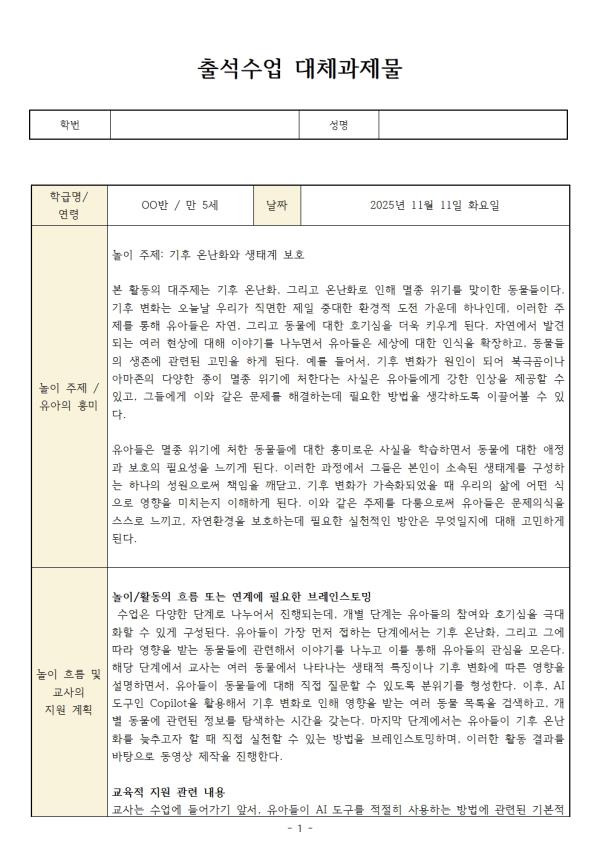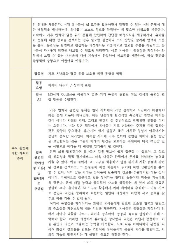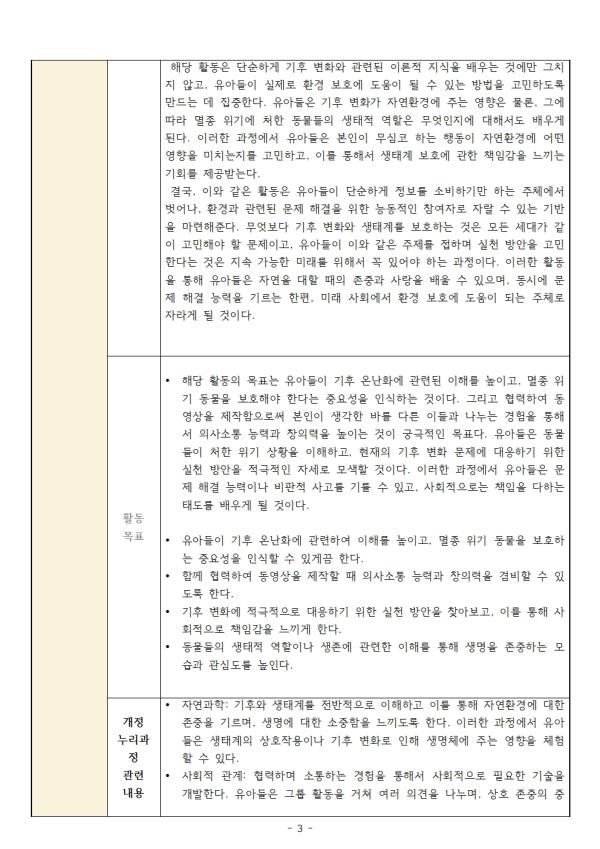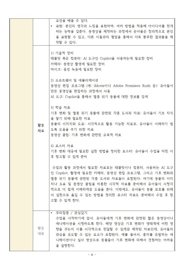 ¿¹½Ã) ¨ç À̾߱⠳ª´©±â Ȱµ¿(±âÈÄ ¿Â³È): CopilotÀ» Ȱ¿ëÇÏ¿© ¸êÁ¾ À§±â µ¿¹°À» À¯¾Æµé°ú ÇÔ²² Ž»öÇϰí, ±âÈÄ ¿Â³È¸¦ ´ÊÃß±â À§ÇØ À¯¾ÆµéÀÌ ½ÇõÇÒ ¼ö ÀÖ´Â ÀÛÀº ½Çõ ¹æ¾ÈÀ» ÅäÀÇÇÑ´Ù. ÀÌÈÄ È°µ¿ ³»¿ëÀ» Á¤¸®ÇÏ¿© µ¿¿µ»óÀ¸·Î Á¦ÀÛÇϰí, À¯Æ©ºê¿¡ °Ô½ÃÇÏ¿© È«º¸ÇÏ´Â ÇÁ·ÎÁ§Æ®Çü ¼ö¾÷À¸·Î È®ÀåÇÑ´Ù. ¨è °ÔÀÓ È°µ¿(·¯ºê¹ÌÅÍ): NFC ½ºÆ¼Ä¿¿¡ À¯¾Æ°¡ Á÷Á¢ ³ìÀ½ÇÑ »ç¶ûÀÇ ¸Þ½ÃÁö¸¦ Å©¸®½º¸¶½º º¼¿¡ ºÎÂøÇÏ¿© °ÔÀÓ ÀÚ·á·Î Ȱ¿ëÇÑ´Ù. À¯¾ÆµéÀº Ãâ¹ß¼±¿¡¼ ½ÃÀÛÇØ µµÂø ÁöÁ¡ÀÇ Å©¸®½º¸¶½º ³ª¹«¿¡ ÀÚ½ÅÀÇ º¼À» °É°í, NFC ½ºÆ¼Ä¿¿¡ ´ã±ä ¸Þ½ÃÁö¸¦ ÀνÄÇÑ ÈÄ Ä£±¸µé¿¡°Ô µé·ÁÁÖ´Â °úÁ¤À» ÅëÇØ ¶Ç·¡ °£ Á¤¼Àû ±³·ù¿Í Çù·ÂÀ» °æÇèÇÑ´Ù. ** ÇÔ²² Á¦°øµÇ´Â Âü°íÀÚ·á ÇÑ±ÛÆÄÀÏ ** 1. ³îÀÌ ÁÖÁ¦ ¹× À¯¾ÆÀÇ Èï¹Ì - ±âÈĿ³È.hwp 2. ³îÀÌ ÁÖÁ¦ ¹× À¯¾ÆÀÇ Èï¹Ì - ·¯ºê¹ÌÅÍ.hwp 3. AI Ȱ¿ë ±³°ú±³À° ¸ðÀǼö¾÷ Áغñ ¼Ò°¨.hwp 4. AI Ȱ¿ë ±³°ú±³À° ¸ðÀǼö¾÷ Áغñ ¼Ò°¨2.hwp 5. ³îÀÌ È帧 ¹× ±³»çÀÇ Áö¿ø °èȹ.hwp 6. ³îÀÌ È帧 ¹× ±³»çÀÇ Áö¿ø °èȹ2.hwp 7. À̾îÁú À¯¾ÆÀÇ Èï¹Ì ¹× ±³»çÀÇ Áö¿ø.hwp 8. À̾îÁú À¯¾ÆÀÇ Èï¹Ì ¹× ±³»çÀÇ Áö¿ø2.hwp 9. ÁÖ¿äȰµ¿¿¡ ´ëÇÑ °èȹ°ú Áغñ.hwp 10. ÁÖ¿äȰµ¿¿¡ ´ëÇÑ °èȹ°ú Áغñ2.hwp ÀÚ·á³»¿ë ¹Ì¸®º¸±â