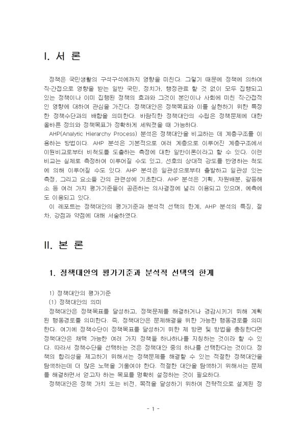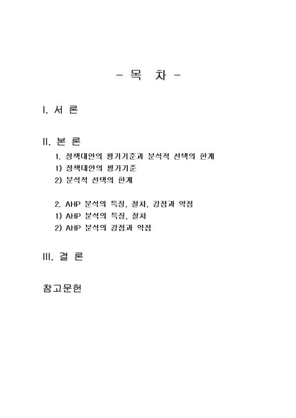 2. AHP ºÐ¼®ÀÇ Æ¯Â¡°ú ÀϹÝÀýÂ÷¸¦ ¼³¸íÇϰí, °Á¡°ú ¾àÁ¡¿¡ ´ëÇØ ³íÇϽÿÀ. - ¸ñ Â÷ - I. ¼ ·Ð II. º» ·Ð 1. Á¤Ã¥´ë¾ÈÀÇ Æò°¡±âÁذú ºÐ¼®Àû ¼±ÅÃÀÇ ÇѰè 1) Á¤Ã¥´ë¾ÈÀÇ Æò°¡±âÁØ 2) ºÐ¼®Àû ¼±ÅÃÀÇ ÇѰè 2. AHP ºÐ¼®ÀÇ Æ¯Â¡, ÀýÂ÷, °Á¡°ú ¾àÁ¡ 1) AHP ºÐ¼®ÀÇ Æ¯Â¡, ÀýÂ÷ 2) AHP ºÐ¼®ÀÇ °Á¡°ú ¾àÁ¡ III. °á ·Ð Âü°í¹®Çå ** ÇÔ²² Á¦°øµÇ´Â Âü°íÀÚ·á ÇÑ±ÛÆÄÀÏ ** 1. AHP ºÐ¼®ÀÇ °Á¡ ¹× ¾àÁ¡.hwp 2. AHP ºÐ¼®ÀÇ °Á¡ ¹× ¾àÁ¡2.hwp 3. AHP ºÐ¼®ÀÇ ÀϹÝÀýÂ÷.hwp 4. AHP ºÐ¼®ÀÇ ÀϹÝÀýÂ÷2.hwp 5. AHP ºÐ¼®ÀÇ Æ¯Â¡.hwp 6. AHP ºÐ¼®ÀÇ Æ¯Â¡2.hwp 7. ºÐ¼®Àû ¼±ÅÃÀÇ ÇѰè.hwp 8. ºÐ¼®Àû ¼±ÅÃÀÇ ÇѰè2.hwp 9. Á¤Ã¥´ë¾ÈÀÇ Æò°¡ ±âÁØ.hwp 10. Á¤Ã¥´ë¾ÈÀÇ Æò°¡ ±âÁØ2.hwp 11. ¼·Ð ÀÛ¼º½Ã ÂüÁ¶.hwp 12. °á·Ð ÀÛ¼º½Ã ÂüÁ¶.hwp ÀÚ·á³»¿ë ¹Ì¸®º¸±â