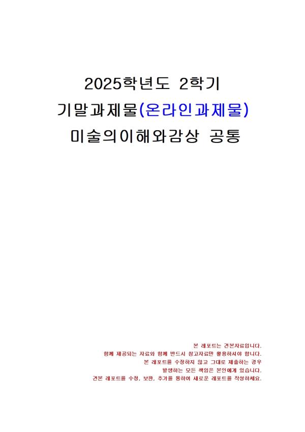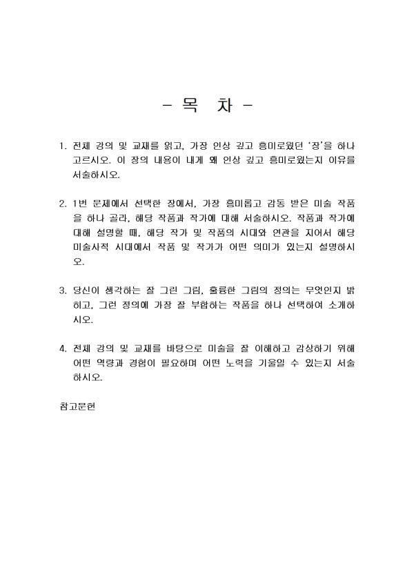 <¹Ì¼úÀÇ ÀÌÇØ¿Í °¨»ó> °úÁ¦´Â ÃÑ 4°³ÀÇ ¹®Á¦·Î ±¸¼ºµÇ¸ç, 4°³¸¦ ¸ðµÎ ´äÇØ¾ß ÇÕ´Ï´Ù. 4°³ °úÁ¦¸¦ ¸ðµÎ ÇÕÇÏ¿© A4 3Àå ºÐ·®À¸·Î ÀÛ¼ºÇØ¾ß ÇÕ´Ï´Ù.