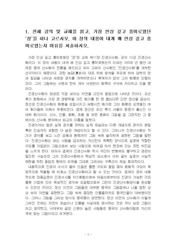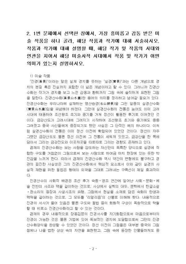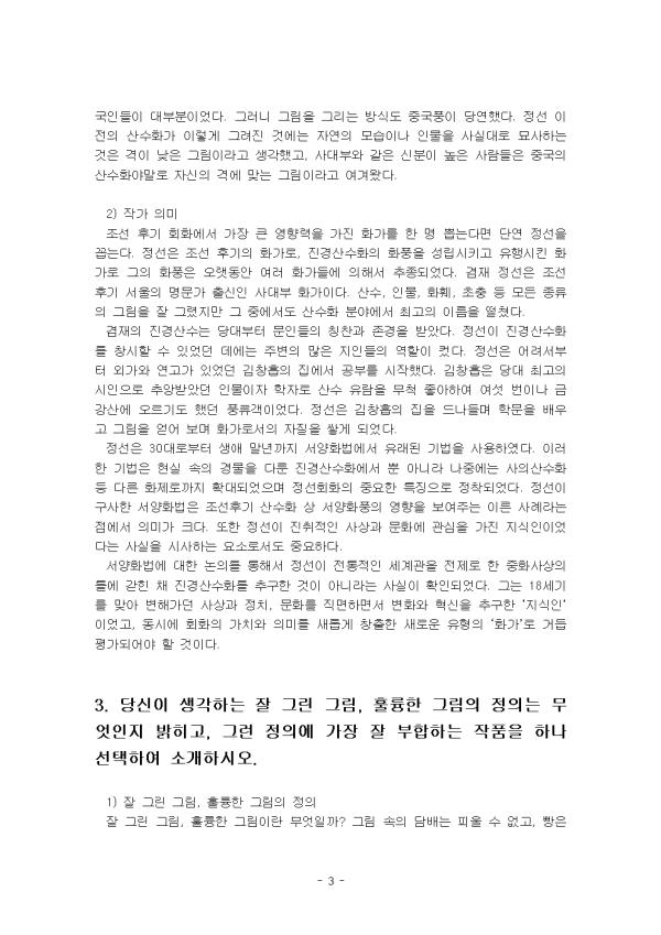 °¡Àå Àλó ±í°í Èï¹Ì·Î¿ü´ø ¡®À塯Àº ±³Àç Á¦11Àå Áø°æ»ê¼öÈ, °ÀÇ 12° Áø°æ»ê¼öÈÀÌ´Ù. ÀÌ ÀåÀÇ ³»¿ëÀÌ ³»°Ô ¿Ö Àλó ±í°í Èï¹Ì·Î¿ü´ÂÁö ÀÌÀ¯´Â 300¿© ³â µ¿¾È ³»·Á¿Â Áß±¹ »ê¼öÈÀÇ ÀüÅëÀ» ±ú¶ß¸®°í ¿ì¸® °íÀ¯ÀÇ »ê¼öÈÀÎ ¡®Áø°æ»ê¼öÈ¡¯¸¦ °³Ã´ÇÑ ¼±±¸ÀÚÀ̱⠶§¹®ÀÌ´Ù. °ÇÑ ³ó´ã(ÒØÓ¿)ÀÇ ´ëÁ¶ À§¿¡ û»öÀ» ÁÖÁ¶·Î ÇÏ¿© ¾Ïº®ÀÇ ¸é°ú Áú°¨À» ³ªÅ¸³½ »õ·Î¿î °æÁö¸¦ °³Ã´ÇÏ¿´À¸³ª ÈİèÀÚ°¡ ¾ø¾î ±×ÀÇ ÈdzÀº ´ÜÀýµÇ¾ú´Ù. ±×ÀÇ ±×¸²¿¡´Â ¼¸í°ú ÇѵΠ°³ÀÇ ³«°ü¸¸ÀÌ ÈÆøÀÇ ±¸¼®¿¡ ÀÚ¸®Çϰí ÀÖÀ» »ÓÀÌ´Ù. Áø°æ»ê¼öÈÀÇ ¿Ï¼ºÀº Á÷Á¢ º¸ÀÌ´Â ÀÚ¿¬À» °íÀÎÀÇ ÇʹýÀ¸·Î ³ªÅ¸³½ °ÍÀÌ´Ù. Á¶¼± Èıâ ȸȿ¡¼ °¡Àå Å« ¿µÇâ·ÂÀ» °¡Áø Ȱ¡¸¦ ÇÑ ¸í »Ì´Â´Ù¸é ´Ü¿¬ Á¤¼±À» ²Å´Â´Ù. Á¤¼±Àº Áø°æ»ê¼öÈÀÇ ÈdzÀ» ¼º¸³½Ã۰í À¯Çà½ÃŲ Ȱ¡·Î ±×ÀÇ ÈdzÀº ¿À·§µ¿¾È ¿©·¯ Ȱ¡µé¿¡ ÀÇÇØ¼ ÃßÁ¾µÇ¾ú´Ù. °âÀç Á¤¼±Àº Á¶¼± Èı⠼¿ïÀÇ ¸í¹®°¡ Ãâ½ÅÀÎ »ç´ëºÎ Ȱ¡ÀÌ´Ù. »ê¼ö, Àι°, ÈÈÑ, ÃÊÃæ µî ¸ðµç Á¾·ùÀÇ ±×¸²À» Àß ±×·ÈÁö¸¸ ±× Áß¿¡¼µµ »ê¼öÈ ºÐ¾ß¿¡¼ ÃÖ°íÀÇ À̸§À» ¶³ÃÆ´Ù. Áø°æÀ̶ó´Â ¸»Àº ½ÇÁ¦ °æÄ¡¸¦ ¶æÇÏ´Â ½ÇÁ¦ ¸ð½À°ú´Â ´Ù¸¥ °³³äÀ¸·Î °æÄ¡ÀÇ º»Áú ȤÀº Áø½Ç±îÁö Æ÷ÇÔÇÑ ´õ ³ÐÀº °³³äÀ̶ó°í ÇÒ ¼ö ÀÖ´Ù. ±×·¯´Ï±î Áø°æ»ê¼öÈ´Â ÀÛ°¡°¡ °æÄ¡¸¦ º¸°í ´À³¤ °¨µ¿°ú ȯÈñ±îÁö ±×¸² ¼Ó¿¡ ¼ÖÁ÷ÇÏ°Ô Ç¥ÇöµÈ ±×¸²À» ¸»ÇÑ´Ù. Áø°æ»ê¼öÈ´Â º¸´Â »ç¶÷À» ¾ÐµµÇÏ´Â ÀڽŸ¸ÀÇ µ¶Æ¯ÇÑ ¾ç½ÄÀ¸·Î ½Ç°æ¿¡ ÀûÇÕÇÑ ±¸µµ¸¦ °Åħ¾øÀÌ ±×¸²À¸·Î½á º¸´Â »ç¶÷À¸·Î ÇÏ¿©±Ý ¸¶Ä¡ ÇöÀå¿¡ ÀÖ´Â µíÇÑ ¹ÚÁø°¨À» ´À³¢°Ô ÇÑ´Ù. µû¶ó¼ °âÀçÀÇ Áø°æ»ê¼öÈ ¿ª½Ã ¾à°£ÀÇ º¯Çü¿¡µµ ºÒ±¸ÇÏ°í °æ°üÀÇ ÇÌÁøÇÑ »ç½Ç¼ºÀº ±×ÀÇ Áø°æ»ê¼öÈ¿¡¼ ÇÙ½ÉÀû ¿ä¼Ò·Î¼ ÀÌ¿Í °°ÀÌ ½Ç°æÀÇ »ç½ÇÀû ÀçÇöÀ» À§ÇÑ ÇʹýÀº ÇüÅÂÀÇ ¿Ü°ûÀ» ±×´ë·Î ±×·Á³»´Â ±¸¸¤¼±ÀÌ Á¦ÀÏ È¿°úÀûÀÌ´Ù. ³»¿ëÀûÀ¸·Î Áø°æÀÇ ¼»ç°¡ µé¾î ÀÖÀ½Àº ¹°·Ð ±¸µµ¿Í Çʹý µîÀÇ È¸ÈÀû ±¸¼ºÀÌ µ¶Ã¢ÀûÀ¸·Î Ź¿ùÇÒ ¶§ ºñ·Î¼Ò Áø°æ»ê¼öȶó°í ÇÒ ¼ö ÀÖ´Â °ÍÀÌ´Ù. °âÀçÀÇ °æ¿ì ³»¿ëÀûÀ¸·Î À嵿±è¹®ÀÇ Áø°æ¼»ç¸¦ ÀÚ±âÈÇÔÀ¸·Î½á ¸¶À½À¸·ÎºÎÅÍÀÇ Áø°æÀÌ °¡´ÉÇÑ °ÍÀº ¹°·Ð ±â¹ý¿¡ ÀÖ¾î µ¶º¸ÀûÀÎ °æÁö¿¡ µµ´ÞÇÔÀ¸·Î½á ±×¸¸ÀÇ Áø°æ»ê¼öȾç½ÄÀ» ¿Ï¼ºÇÒ ¼ö ÀÖ¾ú´ø °ÍÀÌ´Ù. Á¤¼± ÀÌÀüÀÇ ±×¸²µéÀº ´ëºÎºÐ Áß±¹ÀÇ ±×¸²Ã¸¿¡³ª ³ª¿Ã ¹ýÇÑ »ó»ó ¼ÓÀÇ ÀÚ¿¬À» Ç¥ÇöÇß°í, ±×¸² ¼Ó¿¡ µîÀåÇÑ Àι°µé¸¶Àúµµ Áß±¹ÀεéÀÌ ´ëºÎºÐÀ̾ú´Ù. ±×·¯´Ï ±×¸²À» ±×¸®´Â ¹æ½Äµµ Áß±¹Ç³ÀÌ ´ç¿¬Çß´Ù. Á¤¼± ÀÌÀüÀÇ »ê¼öȰ¡ ÀÌ·¸°Ô ±×·ÁÁø °Í¿¡´Â ÀÚ¿¬ÀÇ ¸ð½ÀÀ̳ª Àι°À» »ç½Ç´ë·Î ¹¦»çÇÏ´Â °ÍÀº °ÝÀÌ ³·Àº ±×¸²À̶ó°í »ý°¢Çß°í, »ç´ëºÎ¿Í °°Àº ½ÅºÐÀÌ ³ôÀº »ç¶÷µéÀº Áß±¹ÀÇ »ê¼öȾ߸»·Î ÀÚ½ÅÀÇ °Ý¿¡ ¸Â´Â ±×¸²À̶ó°í ¿©°Ü¿Ô´Ù. 2. 1¹ø ¹®Á¦¿¡¼ ¼±ÅÃÇÑ Àå¿¡¼, °¡Àå Èï¹Ì·Ó°í °¨µ¿ ¹ÞÀº ¹Ì¼ú ÀÛǰÀ» Çϳª °ñ¶ó, ÇØ´ç ÀÛǰ°ú ÀÛ°¡¿¡ ´ëÇØ ¼¼úÇϽÿÀ. ÀÛǰ°ú ÀÛ°¡¿¡ ´ëÇØ ¼³¸íÇÒ ¶§, ÇØ´ç ÀÛ°¡ ¹× ÀÛǰÀÇ ½Ã´ë¿Í ¿¬°üÀ» Áö¾î¼ ÇØ´ç ¹Ì¼ú»çÀû ½Ã´ë¿¡¼ ÀÛǰ ¹× ÀÛ°¡°¡ ¾î¶² Àǹ̰¡ ÀÖ´ÂÁö ¼³¸íÇϽÿÀ. 1) ¹Ì¼ú ÀÛǰ ¡®Áø°æ(òØÌØ)¡¯À̶ó´Â ¸»Àº ½ÇÁ¦ °æÄ¡¸¦ ¶æÇÏ´Â ¡®½Ç°æ(ãùÌØ)¡¯°ú´Â ´Ù¸¥ °³³äÀ¸·Î °æÄ¡ÀÇ º»Áú ȤÀº Áø½Ç±îÁö Æ÷ÇÔÇÑ ´õ ³ÐÀº °³³äÀ̶ó°í ÇÒ ¼ö ÀÖ´Ù. ±×·¯´Ï±î Áø°æ»ê¼öÈ´Â ÀÛ°¡°¡ °æÄ¡¸¦ º¸°í ´À³¤ °¨µ¿°ú ȯÈñ±îÁö ±×¸² ¼Ó¿¡ ¼ÖÁ÷ÇÏ°Ô Ç¥ÇöµÈ ±×¸²À» ¸»ÇÑ´Ù. Áø°æ»ê¼öÈ(òØÌØß£â©ûþ)¶õ ¿ë¾îÀÇ Àǹ̸¦ Á¤¸®ÇÏ°í ³Ñ¾î°¥ Çʿ䰡 ÀÖ´Ù. Áø°æ»ê¼öÈ´Â ¿ì¸®³ª¶ó¿¡ ½ÇÀçÇÏ´Â ¸í»ê½Â°æ(٣ߣãÌØ)À» ±×¸° ÀÏÁ¾ÀÇ ½Ç°æ»ê¼öÈ(ãùÌØß£â©ûþ)ÀÓÀ» À¯³äÇØ¾ß ÇϰڴÙ. ±×·±µ¥ ½Ç°æ»ê¼öÈÀÇ ÀüÅëÀº ´Ê¾îµµ ÀÌ¹Ì °í·Á½Ã´ë¿¡ ŵ¿ÇÏ¿© Á¶¼±¿ÕÁ¶ Ãʱâ¿Í Á߱⸦ °ÅÃÄ Á¤¼±ÀÌ È°µ¿ÇÑ Èıâ·Î À̾îÁ³´ø °ÍÀÌ´Ù. ±Ý°»êµµ°¡ °í·Á½Ã´ë¿¡ ±×·ÁÁö±â ½ÃÀÛÇÏ¿© Á¶¼±¿ÕÁ¶ Ãʱâ¿Í Á߱⿡µµ Á¾Á¾ ±×·ÁÁ³°í Áß±¹ »ç½Åµé¿¡°Ô ÁõÁ¤µÇ±âµµ Çß´ø »ç½ÇÀº ±× ´ÜÀûÀÎ ¿¹ÀÇ ÇϳªÀÌ´Ù. ÀÌó·³ ½Ç°æ»ê¼öÈÀÇ ÀüÅëÀº ÀÌ¹Ì Á¤¼± ÀÌÀü¿¡ È®¸³µÇ¾î ÀÖ¾ú´ø °ÍÀÌ´Ù. Á¤¼±ÀÌ ÀÚÁÖ ±×·È´ø ±Ý°»êµµµµ ¹°·Ð Á¤¼± ÀÌÀü¿¡ ±× ÀüÅëÀÌ ¼¼¿öÁ® ÀÖ¾ú°í, ±Ý°»êÀ» ÇÑ Æø¿¡ ´ã¾Æ¼ ±×¸®´Â ±Ý°Àüµµ¿Í À̰÷Àú°÷À» µû·Îµû·Î ±×¸®´Â °æÇâµµ Á¸ÀçÇϰí ÀÖ´