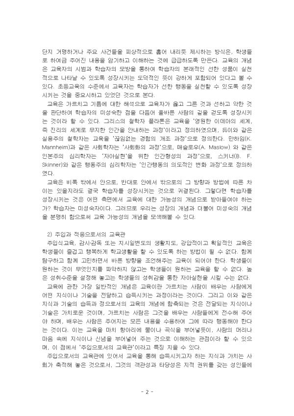 ±³À°Àº °³ÀÎÀ̳ª Áý´Ü, »çȸ³ª ±¹°¡ ¹ßÀüÀÇ ±âº»Àû ÀåÄ¡ÀÌ´Ù. ±³À°ÀÌ Àß µÇ¾î¾ß °³Àεµ ¹ßÀüÇϰí, ±³À°ÀÌ Àß µÇ¾î¾ß ³ª¶ó¿Í ±¹°¡µµ ¹ø¿µÇÒ ¼ö ÀÖ´Ù. ±³À°Àº ±³À°ÀÚ°¡ ±×·± ÇDZ³À°ÀÚÀÇ °¨°¢Àû ÇнÀ°æÇèÀ» ÀÚ±ØÇϰí ÀεµÇÏ´Â °úÁ¤ÀÌ´Ù. ÇÏÁö¸¸ ¼±»ý´Ô ¾øÀÌ È¥ÀÚ Å͵æÇÏ´Â ÇнÀµµ ¸¹´Ù. ³ÐÀº Àǹ̿¡¼ÀÇ ±³À°Àº ±×·± µ¶ÀÚÀû ÇнÀµµ È®ÀÎÇÏ°í ¶Ç ÇÑÆí Àڱصµ ÇÏ´Â °ÍÀ» Æ÷ÇÔÇÑ´Ù. Àΰ£ÀÌ Àΰ£´ä°Ô »ì¾Æ°¡·Á¸é ±×¿¡°Ô ¿©·¯ °¡Áö ÁöÀû ´É·Â, Á¤¼Àû ¼ºÇ°, »çȸÀû ¿ª·®, µµ´öÀû ¼º°Ý, ±×¸®°í ½ÅüÀû °Ç°µµ °è¹ßµÇ¾î¾ß ÇÒ °ÍÀº ¸í¹éÇÏ´Ù. ÀÌ·± Àΰ£Æ¯¼ºµéÀÌ ÀûÀýÈ÷ ÇÔ¾çµÊÀÌ ¾øÀÌ´Â °³ÀÎÀº °¡Á¤, Çб³, µ¿¹«Áý´Ü, Á÷Àå, »çȸ¿¡¼ Àΰ£´Ù¿î »îÀ» ÁöÅÊÇØ ³ª°¥ ¼ö°¡ ¾ø´Ù. À̰ÍÀÌ Àΰ£À» Àΰ£´ä°Ô ±æ·¯¾ß ÇÒ ±³À°ÀÇ ¸ñÀûÀÌ µÈ´Ù. ±³À°Àº ¡®±â¸£´Ù¡¯´Â ±â·ç´Ù´Â ¶æÀÌ µé¾î ÀÖÀ¸¸ç, ÀÌ ¡®±â·ç´Ù¡¯´Â ¡®±æ´Ù¡¯¿¡¼ ³ª¿Â ¸»·Î »ý°¢µÈ´Ù. ±â¸£´Â ÀÏ, ±æµéÀÌ´Â ÀÏÀº °ð ±æ°Ô ÇÏ´Â ÀÏ, Å©°Ô ÇÏ´Â ÀÏ, ÀÚ¶ó³ª°Ô ÇÏ´Â ÀÏÀ» ¶æÇÑ´Ù. ±³À°À̶õ ¹«¾ùÀΰ¡¶ó´Â Áú¹®¿¡ ´ëÇØ ¸ÕÀú ¸Ó¸®¿¡ ¶°¿À¸£´Â °ÍÀº 「°¡¸£Ä¡´Â °Í」À̶ó´Â ´ë´äÀÏ °ÍÀÌ´Ù. ÀÌ ´ë´äÀº ¹°·Ð »ó´çÇÑ Áø½ÇÀ» ³»Æ÷Çϰí ÀÖ´Ù. ±×·¯³ª ¸¸ÀÏ ¡°¹«¾ù ¶§¹®¿¡ °¡¸£Ä¡´À³Ä?¡± ¡°¹«¾ùÀ» °¡¸£Ä¡´À³Ä?¡± ¡°¾î¶»°Ô °¡¸£Ä¡´À³Ä?¡±¶ó´Â Áú¹®À» ÇÑ´Ù¸é, ±× ´ë´äÀº ±×¸® °£´ÜÇÏÁöµµ ¾ÊÀ¸·Á´Ï¿Í ÀǰßÀÌ ¹éÃâÇÒ °ÍÀ̸ç, »ó´çÈ÷ º¹ÀâÇÑ ³íÀï¿¡ ºüÁ®µé°í ¸» °ÍÀÌ´Ù. ¡°±³À°À̶õ ¹«¾ùÀΰ¡?¡±¶ó´Â Áú¹®Àº ºñ´Ü ±³À°À» °èȹÇϰųª ±³À°¿¬±¸¸¦ ½ÃÀÛÇÏ´Â ¸¶´ç¿¡¼¸¸ÀÌ ¾Æ´Ï¶ó, ±³À°À» ÇÏ´Â Áß°£¿¡µµ ±×¸®°í ±³À°À» ¸¶Ä£ ´ÙÀ½¿¡µµ ²÷ÀÓ¾øÀÌ Á¦±âµÇ´Â Áú¹®ÀÌ´Ù. ±³À°ÀÌ Á¸ÀçÇÏ´Â ÇÑ ±³À°Àº ¹«¾ùÀΰ¡¶ó´Â Áú¹®Àº °è¼ÓÇØ¼ Á¦±âµÉ ¼ö ÀÖ´Â ¹®Á¦À̸ç, ±×°ÍÀº °ð ±× Áú¹®ÀÌ ±³À°À» ¾î¶»°Ô ÀÌÇØÇÏ°í ÆÄ¾ÇÇÏ´Â °ÍÀÌ ¿Ã¹Ù¸¥ °ÍÀΰ¡¸¦ ¹¯°í Àֱ⠶§¹®ÀÌ´Ù. ¾î¶»°Ô º¸¸é ±³À°ÇÐ ¿¬±¸¶ó´Â °Í ÀÚü°¡ ¡°±³À°Àº ¹«¾ùÀΰ¡?¡±¶ó´Â Áú¹®¿¡ ´ëÇÑ ´äº¯À» Ãß±¸ÇÏ´Â Çй®À̶ó°íµµ ÇÒ ¼ö ÀÖ´Ù. ÀÌ ·¹Æ÷Æ®´Â ±³À°°íÀüÀÇ ÀÌÇØ °ÀǸ¦ µè°í ¡®±³À°À̶õ ¹«¾ùÀΰ¡¡¯¶ó´Â Áú¹®¿¡ ´ëÇÑ ³ªÀÇ ´äÀÌ ¾î¶»°Ô ´Þ¶óÁ³´ÂÁö ¼¼úÇÏ¿´´Ù. II. º» ·Ð 1. ±³À°À̶õ ¹«¾ùÀΰ¡ 1) °³³äÀ¸·Î¼ÀÇ ±³À° ±³°ú¼¿¡ ¼Ò°³µÇ´Â °³³äÀ̳ª »ç½Ç, ¿ø¸® µîÀÇ ¾çÀÌ Áö³ªÄ¡°Ô ¸¹´Ù. ÁÖ¿ä °³³äµéÀ» ´ÜÁö °Å¸íÇϰųª ÁÖ¿ä »ç°ÇµéÀ» ÇÇ»óÀûÀ¸·Î ÈÈ¾î ³»¸®µí Á¦½ÃÇÏ´Â ¹æ½ÄÀº, Çлýµé·Î ÇÏ¿©±Ý ÁÖ¾îÁø ³»¿ëÀ» ¾Ï±âÇϰí ÀÌÇØÇÏ´Â °Í¿¡ ±Þ±ÞÇϵµ·Ï ¸¸µç´Ù. ±³À°ÀÇ °³³äÀº ±³À°ÀÚÀÇ ½Ã¹ü°ú ÇнÀÀÚÀÇ ¸ð¹æÀ» ÅëÇÏ¿© ÇнÀÀÚÀÇ º»·¡ÀûÀÎ ¼±ÇÑ ¼ºÇ°ÀÌ ½ÇõÀûÀ¸·Î ³ªÅ¸³¯ ¼ö ÀÖµµ·Ï ¼ºÀå½ÃŰ´Â µµ´öÀûÀÎ ¶æÀÌ °ÇÏ°Ô Æ÷ÇԵǾî ÀÖ´Ù°í º¼ ¼ö ÀÖ´Ù. ÃʵÀ°ÀÇ ¼öÁØ¿¡¼ ±³À°ÀÚ´Â ÇнÀÀÚ°¡ ¼±ÇÑ ÇൿÀ» ½ÇõÇÒ ¼ö ÀÖµµ·Ï ¼ºÀå½ÃŰ´Â °ÍÀ» Áß¿ä½ÃÇϰí ÀÖ¾ú´ø °ÍÀ¸·Î º»´Ù. ±³À°Àº °¡¸£Ä¡°í ±â¸§¿¡ ´ëÇÑ ÇØ¼®À¸·Î ±³À°ÀÚ°¡ ¿Ç°í ±×¸¥ °Í°ú ¼±ÇÏ°í ¾ÇÇÑ °ÍÀ» ÆÇ´ÜÇÏ¿© ÇнÀÀÚÀÇ ¹Ì¼º¼÷ÇÑ Á¡À» ´Ùµë¾î ¿Ã¹Ù¸¥ »ç¶÷ÀÇ ±æÀ» °Èµµ·Ï ¼ºÀå½ÃŰ´Â °ÍÀ̶ó ÇÒ ¼ö ÀÖ´Ù. ±×¸®½ºÀÇ Ã¶ÇÐÀÚ ÇöóÅæÀº ±³À°À» ¡®¿µ¿øÇÑ À̵¥¾ÆÀÇ ¼¼°è, Áï Áø¸®ÀÇ ¼¼°è·Î ¹«ÁöÇÑ Àΰ£À» ¾È³»ÇÏ´Â °úÁ¤¡¯À̶ó°í Á¤ÀÇÇÏ¿´À¸¸ç, µàÀÌ¿Í °°Àº ½Ç¿ëÁÖÀÇ Ã¶ÇÐÀÚ´Â ±³À°À» ¡®²÷ÀÓ¾ø´Â °æÇèÀÇ °³Á¶ °úÁ¤¡¯À¸·Î Á¤ÀÇÇÑ´Ù. ¸¸ÇÏÀÓ(K. Mannheim)°ú °°Àº »çȸÇÐÀÚ´Â ¡®»çȸÈÀÇ °úÁ¤¡¯À¸·Î, ¸Å½½·Î¿ì(A. Maslow) ¿Í °°Àº Àκ»ÁÖÀÇ ½É¸®ÇÐÀÚ´Â ¡®ÀھƽÇÇö¡¯À» À§ÇÑ Àΰ£Çü¼ºÀÇ °úÁ¤¡¯À¸·Î, ½ºÅ°³Ê(B. F. Skinner)¿Í °°Àº ÇൿÁÖÀÇ ½É¸®ÇÐÀÚ´Â ¡®Àΰ£ÇൿÀÇ ÀǵµÀûÀÎ º¯È °úÁ¤¡¯À¸·Î Á¤ÀÇÇÏ¿´´Ù. - Áß·« - |