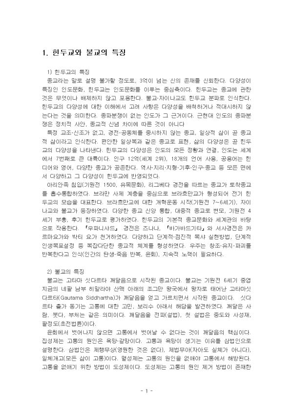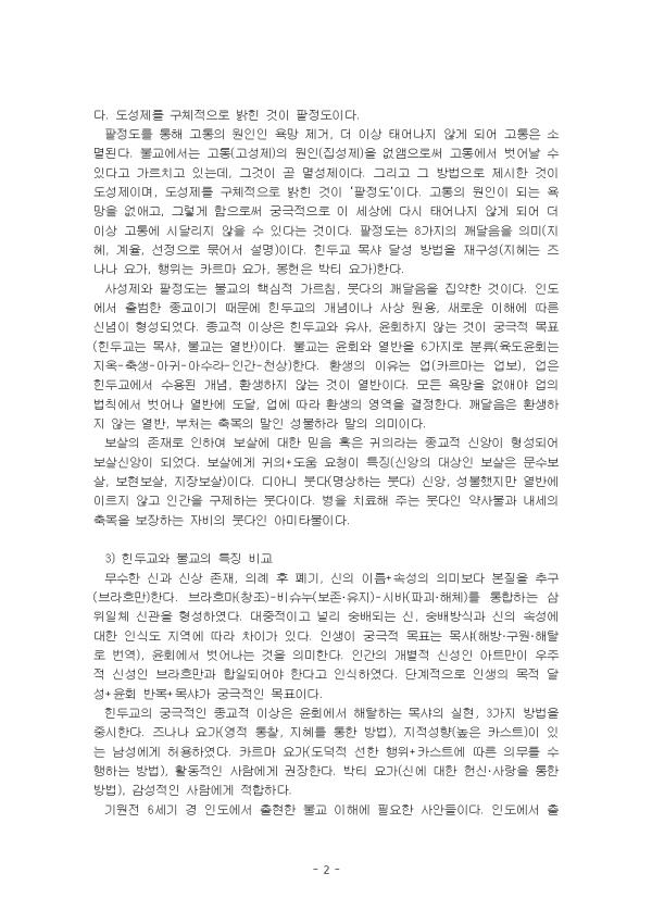 1) ÈùµÎ±³ÀÇ Æ¯Â¡ Á¾±³¶ó´Â ¸»·Î ¼³¸í ºÒ°¡ÇÒ Á¤µµ·Î, 3¾ïÀÌ ³Ñ´Â ½ÅÀÇ Á¸À縦 ½Å·ÚÇÑ´Ù. ´Ù¾ç¼ºÀÌ Æ¯Â¡ÀÎ Àεµ¹®È, ÈùµÎ±³´Â Àεµ¹®È¸¦ ÀÌ·ç´Â Áß½ÉÃàÀÌ´Ù. ÈùµÎ±³´Â Á¾±³¿¡ °üÇÑ °ÍÀº ¹«¾ùÀ̳ª ¹èÁ¦ÇÏÁö ¾Ê°í Æ÷¿ëÇÑ´Ù. ºÒ±³¡¤ÀÚÀ̳ª±³µµ ÈùµÎ±³ ºÐÆÄ·Î ÀνÄÇÑ´Ù. ÈùµÎ±³ÀÇ ´Ù¾ç¼º¿¡ ´ëÇÑ ÀÌÇØ¿¡¼ °í·Á »çÇ×Àº ´Ù¾ç¼ºÀ» ¹èôÇϰųª Àû´ë½ÃÇÏÁö ¾Ê´Â´Ù´Â °ÍÀ» ÀǹÌÇÑ´Ù. Á¾ÆÄºÐÀïÀÌ ¾ø´Â Àεµ°¡ ±× ±Ù°ÅÀÌ´Ù. ±ÙÇö´ë ÀεµÀÇ Á¾ÆÄºÐÀïÀº Á¤Ä¡Àû »ç¾È, Á¾±³Àû ½Å³ä Â÷ÀÌ¿¡ µû¸¥ °ÍÀÌ ¾Æ´Ï´Ù ƯÁ¤ ±³Á¶¡¤½ÅÁ¶°¡ ¾ø°í, °æÀü¡¤°øµ¿Ã¼¸¦ Áß½ÃÇÏÁö ¾Ê´Â Á¾±³, ÀÏ»óÀû »îÀÌ °ð Á¾±³Àû »îÀ̶ó°í ÀνÄÇÑ´Ù. Æí¾ÈÇÑ Àϻ󺹰ú °°Àº Á¾±³·Î Ç¥Çö, »îÀÇ ´Ù¾ç¼ºÀº °ð ÈùµÎ±³ÀÇ ´Ù¾ç¼ºÀ» ³ªÅ¸³½´Ù. ÈùµÎ±³ÀÇ ´Ù¾ç¼ºÀº ÀεµÀÇ ¸ðµç Á¤È²°ú ¿¬°á, Àεµ´Â ¼¼°è¿¡¼ 7¹øÂ°·Î Å« ´ë·úÀÌ´Ù. Àα¸ 12¾ï(¼¼°è 2À§), 18°³ÀÇ ¾ð¾î »ç¿ë, °ø¿ë¾î´Â Èùµð¾î¿Í ¿µ¾î, ´Ù¾çÇÑ Á¾±³°¡ °øÁ¸ÇÑ´Ù. ¿ª»ç¡¤Áö¸®¡¤ÁöÇü¡¤±âÈÄ¡¤Àα¸¡¤Á¾±³ µî ¸ðµç ¸é¿¡¼ ´Ù¾çÇÏ°í ±× ´Ù¾ç¼ºÀÌ ÈùµÎ±³¿¡ ¹Ý¿µµÇ¾ú´Ù. ¾Æ¸®¾ÈÁ· ħÀÔ(±â¿øÀü 1500, À¯¸ñ¹®È), ¸®±×º£´Ù °æÀüÀ» µû¸£´Â Á¾±³°¡ ÅäÂøÁ¾±³¸¦ Èí¼öÅëÇÕÇÏ¿´´Ù. ºê¶ó¸¸ »çÁ¦ °èÃþÀ» Áß½ÉÀ¸·Î ºê¶óÈ常±³°¡ Çü¼ºµÇ¾î Àü±â ÈùµÎ±³ÀÇ ¸ð½ÀÀ» ´ëÇ¥ÇÑ´Ù. ºê¶óÈ常±³¿¡ ´ëÇÑ °³Çõ¿îµ¿ ½ÃÀÛ(±â¿øÀü 7~6¼¼±â), ÀÚÀ̳ª±³¿Í ºÒ±³°¡ µîÀåÇÏ¿´´Ù. ´Ù¾çÇÑ Á¾±³ ½Å¾Ó ÅëÇÕ, ´ëÁßÀû Á¾±³·Î º¯¸ð, ±â¿øÀü 4¼¼±â ºÎÈï, Èıâ ÈùµÎ±³·Î Æò°¡ÇÏ¿´´Ù. ÈùµÎ±³ÀÇ ±âº»Àû Á¾±³¹®È¿Í ¼¼°è°üÀÇ ¹ÙÅÁÀ¸·Î ÀÛ¿ëÇÑ´Ù. ¡º¿ìÆÄ´Ï»þµå¡» °æÀüÀº Á³ª, ¡º¹Ù°¡¹Ùµå±âŸ¡»¿Í ¼»ç°æÀüÀº Ä«¸£¸¶¿ä°¡¿Í ¹ÚƼ ¿ä°¡ õ°ÅÇÏ¿´´Ù. ´Ù¾çÇÏ°í ´Ü°èÀû¡¤Á¡ÁøÀû ¸ñ»þ ½ÇÇö¹æ¹ý, ´Ü°èÀû Àλý¸ñÇ¥¼³Á¤ µî º¹Àâ´Ù´ÜÇÑ Á¾±³Àû ü°è¸¦ Çü¼ºÇÏ¿´´Ù. ¿ìÁִ âÁ¶¡¤À¯Áö¡¤ÆÄ±«¸¦ ¹Ýº¹ÇÑ´Ù°í ÀνÄ(Àΰ£ÀÇ Åº»ý¡¤Á×À½ ¹Ýº¹, À±È¸), Áö¼ÓÀû ³ë·ÂÀÌ ÇÊ¿äÇÏ´Ù. 2) ºÒ±³ÀÇ Æ¯Â¡ ºÒ±³´Â °íŸ¸¶ ½Ë´Ù¸£Å¸ ±ú´ÞÀ½À¸·Î ½ÃÀÛµÈ Á¾±³ÀÌ´Ù. ºÒ±³´Â ±â¿øÀü 6¼¼±â Áß¿± Áö±ÝÀÇ ³×ÆÈ ³²ºÎ È÷¸»¶ó¾ß »ê¸Æ ¾Æ·¡ÀÇ Á¶±×¸¸ ¿Õ±¹¿¡¼ ¿ÕÀÚ·Î ÅÂ¾î³ °íŸ¸¶½Ë´Ù¸£Å¸(Gautama Siddhartha)°¡ ±ú´ÞÀ½À» ¾ò°í °¡¸£Ä¡¸é¼ ½ÃÀÛµÈ Á¾±³ÀÌ´Ù. ½Ë´Ù¸£Å¸ Ãâ°¡ µ¿±â´Â °íÅë¿¡ ´ëÇÑ °í¹Î, º¸¸®¼ö ¾Æ·¡¼ ÇØ´äÀ» ¹ß°ßÇÏ¿´´Ù. ±ú´ÞÀº »ç¶÷, º×´Ù, ºÎó´Â °°Àº ÀǹÌÀÌ´Ù. ±ú´ÞÀ½À» ÀüÆÄ(¼³¹ý), ù ¼³¹ýÀº Áßµµ¿Í »ç¼ºÀç, ÆÈÁ¤µµ(ÃÊÀü¹ý·û)ÀÌ´Ù. À±È¸¿¡¼ ¹þ¾î³ªÁö ¾ÊÀ¸¸é °íÅë¿¡¼ ¹þ¾î³¯ ¼ö ¾ø´Ù´Â °ÍÀÌ ±ú´ÞÀ½ÀÇ ÇÙ½ÉÀÌ´Ù. Áý¼ºÁ¦´Â °íÅëÀÇ ¿øÀÎÀº ¿å¸Á¡¤°¥¸ÁÀÌ´Ù. °íÅë°ú ¿å¸ÁÀÌ »ý±â´Â ÀÌÀ¯¸¦ »ï¹ýÀÎÀ¸·Î ¼³¸íÇÑ´Ù. »ï¹ýÀÎÀº Á¦Ç๫»ó(¿µ¿øÇÑ °ÍÀº ¾ø´Ù), Á¦¹ý¹«¾Æ(ÀھƵµ ½Çü°¡ ¾Æ´Ï´Ù), ÀÏü°³°í(¸ðµç »îÀÌ °íÅë)ÀÌ´Ù. ¸ê¼ºÁ¦´Â °íÅëÀÇ ¿øÀÎÀ» ¾ø¾Ö¾ß °íÅë¿¡¼ ÇØ¹æµÈ´Ù. °íÅëÀ» ¾ø¾Ö±â À§ÇÑ ¹æ¹ýÀÌ µµ¼ºÁ¦ÀÌ´Ù. µµ¼ºÁ¦´Â °íÅëÀÇ ¿øÀÎ Á¦°Å ¹æ¹ýÀÌ Á¸ÀçÇÑ´Ù. µµ¼ºÁ¦¸¦ ±¸Ã¼ÀûÀ¸·Î ¹àÈù °ÍÀÌ ÆÈÁ¤µµÀÌ´Ù. ÆÈÁ¤µµ¸¦ ÅëÇØ °íÅëÀÇ ¿øÀÎÀÎ ¿å¸Á Á¦°Å, ´õ ÀÌ»ó žÁö ¾Ê°Ô µÇ¾î °íÅëÀº ¼Ò¸êµÈ´Ù. ºÒ±³¿¡¼´Â °íÅë(°í¼ºÁ¦)ÀÇ ¿øÀÎ(Áý¼ºÁ¦)À» ¾ø¾ÚÀ¸·Î½á °íÅë¿¡¼ ¹þ¾î³¯ ¼ö ÀÖ´Ù°í °¡¸£Ä¡°í Àִµ¥, ±×°ÍÀÌ °ð ¸ê¼ºÁ¦ÀÌ´Ù. ±×¸®°í ±× ¹æ¹ýÀ¸·Î Á¦½ÃÇÑ °ÍÀÌ µµ¼ºÁ¦À̸ç, µµ¼ºÁ¦¸¦ ±¸Ã¼ÀûÀ¸·Î ¹àÈù °ÍÀÌ ¡®ÆÈÁ¤µµ¡¯ÀÌ´Ù. °íÅëÀÇ ¿øÀÎÀÌ µÇ´Â ¿å¸ÁÀ» ¾ø¾Ö°í, ±×·¸°Ô ÇÔÀ¸·Î½á ±Ã±ØÀûÀ¸·Î ÀÌ ¼¼»ó¿¡ ´Ù½Ã žÁö ¾Ê°Ô µÇ¾î ´õ ÀÌ»ó °íÅë¿¡ ½Ã´Þ¸®Áö ¾ÊÀ» ¼ö ÀÖ´Ù´Â °ÍÀÌ´Ù. ÆÈÁ¤µµ´Â 8°¡ÁöÀÇ ±ú´ÞÀ½À» ÀǹÌ(ÁöÇý, °èÀ², ¼±Á¤À¸·Î ¹¾î¼ ¼³¸í)ÀÌ´Ù. ÈùµÎ±³ ¸ñ»þ ´Þ¼º ¹æ¹ýÀ» À籸¼º(ÁöÇý´Â Á³ª ¿ä°¡, ÇàÀ§´Â Ä«¸£¸¶ ¿ä°¡, ºÀÇåÀº ¹ÚƼ ¿ä°¡)ÇÑ´Ù. »ç¼ºÁ¦¿Í ÆÈÁ¤µµ´Â ºÒ±³ÀÇ ÇÙ½ÉÀû °¡¸£Ä§, º×´ÙÀÇ ±ú´ÞÀ½À» Áý¾àÇÑ °ÍÀÌ´Ù. Àεµ¿¡¼ Ãâ¹üÇÑ Á¾±³À̱⠶§¹®¿¡ ÈùµÎ±³ÀÇ °³³äÀ̳ª »ç»ó ¿ø¿ë, »õ·Î¿î ÀÌÇØ¿¡ µû¸¥ ½Å³äÀÌ Çü¼ºµÇ¾ú´Ù. Á¾±³Àû ÀÌ»óÀº ÈùµÎ±³¿Í À¯»ç, À±È¸ÇÏÁö ¾Ê´Â °ÍÀÌ ±Ã±ØÀû ¸ñÇ¥(ÈùµÎ±³´Â ¸ñ»þ, ºÒ±³´Â ¿¹Ý)ÀÌ´Ù. ºÒ±³´Â À±È¸¿Í ¿¹ÝÀ» 6°¡Áö·Î ºÐ·ù(À°µµÀ±È¸´Â Áö¿Á-Ãà»ý-¾Æ±Í-¾Æ¼ö¶ó-Àΰ£-õ»ó)ÇÑ´Ù. ȯ
