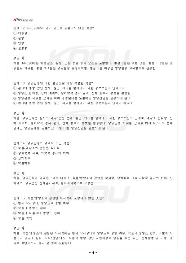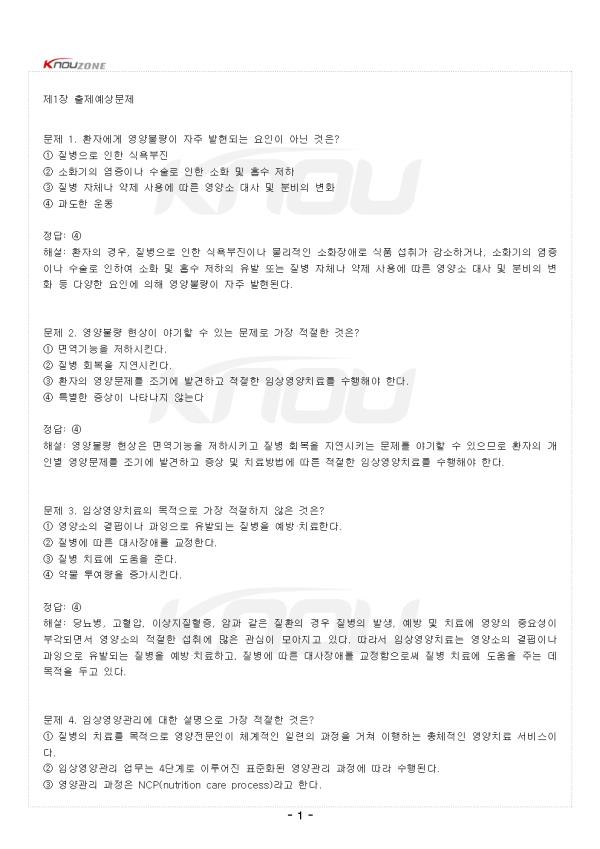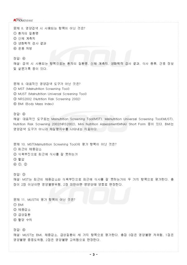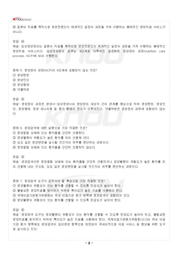 ¹®Á¦ 1. ȯÀÚ¿¡°Ô ¿µ¾çºÒ·®ÀÌ ÀÚÁÖ ¹ßÇöµÇ´Â ¿äÀÎÀÌ ¾Æ´Ñ °ÍÀº? ¨ç Áúº´À¸·Î ÀÎÇÑ ½Ä¿åºÎÁø ¨è ¼ÒȱâÀÇ ¿°ÁõÀ̳ª ¼ö¼ú·Î ÀÎÇÑ ¼ÒÈ ¹× Èí¼ö ÀúÇÏ ¨é Áúº´ ÀÚü³ª ¾àÁ¦ »ç¿ë¿¡ µû¸¥ ¿µ¾ç¼Ò ´ë»ç ¹× ºÐºñÀÇ º¯È ¨ê °úµµÇÑ ¿îµ¿ Á¤´ä: ¨ê ÇØ¼³: ȯÀÚÀÇ °æ¿ì, Áúº´À¸·Î ÀÎÇÑ ½Ä¿åºÎÁøÀ̳ª ¹°¸®ÀûÀÎ ¼ÒÈÀå¾Ö·Î ½Äǰ ¼·Ãë°¡ °¨¼ÒÇϰųª, ¼ÒȱâÀÇ ¿°ÁõÀ̳ª ¼ö¼ú·Î ÀÎÇÏ¿© ¼ÒÈ ¹× Èí¼ö ÀúÇÏÀÇ À¯¹ß ¶Ç´Â Áúº´ ÀÚü³ª ¾àÁ¦ »ç¿ë¿¡ µû¸¥ ¿µ¾ç¼Ò ´ë»ç ¹× ºÐºñÀÇ º¯È µî ´Ù¾çÇÑ ¿äÀο¡ ÀÇÇØ ¿µ¾çºÒ·®ÀÌ ÀÚÁÖ ¹ßÇöµÈ´Ù. ¹®Á¦ 2. ¿µ¾çºÒ·® Çö»óÀÌ ¾ß±âÇÒ ¼ö ÀÖ´Â ¹®Á¦·Î °¡Àå ÀûÀýÇÑ °ÍÀº? ¨ç ¸é¿ª±â´ÉÀ» ÀúÇϽÃŲ´Ù. ¨è Áúº´ ȸº¹À» Áö¿¬½ÃŲ´Ù. ¨é ȯÀÚÀÇ ¿µ¾ç¹®Á¦¸¦ Á¶±â¿¡ ¹ß°ßÇϰí ÀûÀýÇÑ ÀÓ»ó¿µ¾çÄ¡·á¸¦ ¼öÇàÇØ¾ß ÇÑ´Ù. ¨ê ¸ðµÎ ¸ÂÀ½ Á¤´ä: ¨ê ÇØ¼³: ¿µ¾çºÒ·® Çö»óÀº ¸é¿ª±â´ÉÀ» ÀúÇϽÃ۰í Áúº´ ȸº¹À» Áö¿¬½ÃŰ´Â ¹®Á¦¸¦ ¾ß±âÇÒ ¼ö ÀÖÀ¸¹Ç·Î ȯÀÚÀÇ °³Àκ° ¿µ¾ç¹®Á¦¸¦ Á¶±â¿¡ ¹ß°ßÇϰí Áõ»ó ¹× Ä¡·á¹æ¹ý¿¡ µû¸¥ ÀûÀýÇÑ ÀÓ»ó¿µ¾çÄ¡·á¸¦ ¼öÇàÇØ¾ß ÇÑ´Ù. ¹®Á¦ 3. ÀÓ»ó¿µ¾çÄ¡·áÀÇ ¸ñÀûÀ¸·Î °¡Àå ÀûÀýÇÏÁö ¾ÊÀº °ÍÀº? ¨ç ¿µ¾ç¼ÒÀÇ °áÇÌÀ̳ª °úÀ×À¸·Î À¯¹ßµÇ´Â Áúº´À» ¿¹¹æ¡¤Ä¡·áÇÑ´Ù. ¨è Áúº´¿¡ µû¸¥ ´ë»çÀå¾Ö¸¦ ±³Á¤ÇÑ´Ù. ¨é Áúº´ Ä¡·á¿¡ µµ¿òÀ» ÁØ´Ù. ¨ê ¾à¹° Åõ¿©·®À» Áõ°¡½ÃŲ´Ù. Á¤´ä: ¨ê ÇØ¼³: ´ç´¢º´, °íÇ÷¾Ð, ÀÌ»óÁöÁúÇ÷Áõ, ¾Ï°ú °°Àº ÁúȯÀÇ °æ¿ì Áúº´ÀÇ ¹ß»ý, ¿¹¹æ ¹× Ä¡·á¿¡ ¿µ¾çÀÇ Á߿伺ÀÌ ºÎ°¢µÇ¸é¼ ¿µ¾ç¼ÒÀÇ ÀûÀýÇÑ ¼·Ãë¿¡ ¸¹Àº °ü½ÉÀÌ ¸ð¾ÆÁö°í ÀÖ´Ù. µû¶ó¼ ÀÓ»ó¿µ¾çÄ¡·á´Â ¿µ¾ç¼ÒÀÇ °áÇÌÀ̳ª °úÀ×À¸·Î À¯¹ßµÇ´Â Áúº´À» ¿¹¹æ¡¤Ä¡·áÇϰí, Áúº´¿¡ µû¸¥ ´ë»çÀå¾Ö¸¦ ±³Á¤ÇÔÀ¸·Î½á Áúº´ Ä¡·á¿¡ µµ¿òÀ» ÁÖ´Â µ¥ ¸ñÀûÀ» µÎ°í ÀÖ´Ù. ¹®Á¦ 4. ÀÓ»ó¿µ¾ç°ü¸®¿¡ ´ëÇÑ ¼³¸íÀ¸·Î °¡Àå ÀûÀýÇÑ °ÍÀº? ¨ç Áúº´ÀÇ Ä¡·á¸¦ ¸ñÀûÀ¸·Î ¿µ¾çÀü¹®ÀÎÀÌ Ã¼°èÀûÀÎ ÀÏ·ÃÀÇ °úÁ¤À» °ÅÃÄ ÀÌÇàÇÏ´Â ÃÑüÀûÀÎ ¿µ¾çÄ¡·á ¼ºñ½ºÀÌ´Ù. ¨è ÀÓ»ó¿µ¾ç°ü¸® ¾÷¹«´Â 4´Ü°è·Î ÀÌ·ç¾îÁø Ç¥ÁØÈµÈ ¿µ¾ç°ü¸® °úÁ¤¿¡ µû¶ó ¼öÇàµÈ´Ù. ¨é ¿µ¾ç°ü¸® °úÁ¤Àº NCP(nutrition care process)¶ó°í ÇÑ´Ù. ¨ê ¸ðµÎ ¸ÂÀ½ Á¤´ä: ¨ê ÇØ¼³: ÀÓ»ó¿µ¾ç°ü¸®´Â Áúº´ÀÇ Ä¡·á¸¦ ¸ñÀûÀ¸·Î ¿µ¾çÀü¹®ÀÎÀÌ Ã¼°èÀûÀÎ ÀÏ·ÃÀÇ °úÁ¤À» °ÅÃÄ ÀÌÇàÇÏ´Â ÃÑüÀûÀÎ ¿µ¾çÄ¡·á ¼ºñ½ºÀÌ´Ù. ÀÓ»ó¿µ¾ç°ü¸® ¾÷¹«´Â 4´Ü°è·Î ÀÌ·ç¾îÁø Ç¥ÁØÈµÈ ¿µ¾ç°ü¸® °úÁ¤(nutrition care process, NCP)¿¡ µû¶ó ¼öÇàµÈ´Ù. ¹®Á¦ 5. ¿µ¾ç°ü¸® °úÁ¤(NCP)ÀÇ 4´Ü°è¿¡ Æ÷ÇÔµÇÁö ¾Ê´Â °ÍÀº? ¨ç ¿µ¾çÆÇÁ¤ ¨è ¿µ¾çÁø´Ü ¨é ¿µ¾çÁßÀç ¨ê ¾à¹°Ã³¹æ Á¤´ä: ¨ê ÇØ¼³: ¿µ¾ç°ü¸® °úÁ¤Àº ¿µ¾ç»ç-ÀÓ»ó¿µ¾ç»ç¿Í ¿µ¾ç°ü¸® ´ë»óÀÚ °£ÀÇ °ü°è¸¦ Áß½ÉÀ¸·Î ÇÏ¿© ¿µ¾çÆÇÁ¤, ¿µ¾çÁø´Ü, ¿µ¾çÁßÀç, ¿µ¾ç ¸ð´ÏÅ͸µ ¹× Æò°¡ ÇüÅÂÀÇ °ü¸®°¡ ÀÌ·ç¾îÁø´Ù. ¾à¹°Ã³¹æÀº ¿µ¾ç°ü¸® °úÁ¤¿¡ Æ÷ÇÔµÇÁö ¾Ê´Â´Ù. ¹®Á¦ 6. ¿µ¾ç°Ë»ö¿¡ ´ëÇÑ ¼³¸íÀ¸·Î °¡Àå ÀûÀýÇÑ °ÍÀº? ¨ç ¿µ¾ç°áÇÌ »óÅ¿¡ Àִ ȯÀÚµéÀ» °£´ÜÈ÷ ¼±º°ÇÑ´Ù. ¨è ¿µ¾çºÒ·®ÀÇ À§Çèµµ°¡ ³ôÀº ȯÀÚ¸¦ ¹Ì¸® ¼±º°ÇØ ³½´Ù. ¨é ½Éµµ ±íÀº ¿µ¾çÆÇÁ¤À» ½Ç½ÃÇÒ °ÍÀÎÁöÀÇ ¿©ºÎ¸¦ ÆÇ´ÜÇÏ´Â °úÁ¤ÀÌ´Ù. ¨ê ¸ðµÎ ¸ÂÀ½ Á¤´ä: ¨ê ÇØ¼³: ¿µ¾ç°Ë»öÀ̶õ ¿µ¾ç°áÇÌ »óÅ¿¡ Àִ ȯÀÚµéÀ» °£´ÜÈ÷ ¼±º°Çϰųª ¿µ¾çºÒ·®ÀÇ À§Çèµµ°¡ ³ôÀº ȯÀÚ¸¦ ¹Ì¸® ¼±º°ÇØ ³»´Â °ÍÀ¸·Î, ½Éµµ ±íÀº ¿µ¾çÆÇÁ¤À» ½Ç½ÃÇÒ °ÍÀÎÁöÀÇ ¿©ºÎ¸¦ ÆÇ´ÜÇÏ´Â °úÁ¤ÀÌ´Ù. ¹®Á¦ 7. ¿µ¾ç°Ë»ö µµ±¸°¡ °®Ãß¾î¾ß ÇÒ Æ¯¼ºÀ¸·Î °¡Àå ÀûÀýÇÑ °ÍÀº? ¨ç ¿µ¾çºÒ·®ÀÇ À§Ç輺ÀÌ Àִ ȯÀÚ¸¦ ¼±º°ÇÒ ¼ö ÀÖµµ·Ï ¹Î°¨µµ°¡ ³ô¾Æ¾ß ÇÑ´Ù. ¨è ºÒÇÊ¿äÇÑ ¿µ¾çÄ¡·á¸¦ ¹æÁöÇϱâ À§ÇÏ¿© ƯÀ̵µ°¡ ³ôÀº ÁöÇ¥¸¦ »ç¿ëÇØ¾ß ÇÑ´Ù. ¨é ±¹Á¦ÀÇ·á±â°üÆò°¡À§¿øÈ¸¿Í ±¹³» ÀÇ·á±â°ü Æò°¡ Ç׸ñ¿¡ ¿µ¾ç°Ë»öÀÌ Æ÷ÇԵǾî ÀÖ´Ù. ¨ê ¸ðµÎ ¸ÂÀ½ Á¤´ä: ¨ê ÇØ¼³: ¿µ¾ç°Ë»ö µµ±¸´Â ¿µ¾çºÒ·®ÀÇ À§Ç輺ÀÌ Àִ ȯÀÚ¸¦ ¼±º°ÇÒ ¼ö ÀÖµµ·Ï ¹Î°¨µµ°¡ ³ô¾Æ¾ß Çϰí, ºÒÇÊ¿äÇÑ ¿µ¾çÄ¡·á¸¦ ¹æÁöÇϱâ À§ÇÏ¿© ƯÀ̵µ°¡ ³ôÀº ÁöÇ¥¸¦ »ç¿ëÇØ¾ß ÇÑ´Ù. ±¹Á¦ÀÇ·á±â°üÆò°¡À§¿øÈ¸(JCI)¿Í ±¹³» ÀÇ·á±â°ü Æò°¡ Ç׸ñ¿¡µµ ¿µ¾ç°Ë»öÀÌ ÀÓ»ó¿µ¾ç Ç׸ñÀ¸·Î ¸¶·ÃµÇ¾î ±¹³»¿ÜÀûÀ¸·Î ÀÇ·á ¼ºñ½º Áú Çâ»óÀ» À§ÇÑ µµ±¸·Î ½Ç½ÃµÇ°í ÀÖ´Ù. - Áß·« - |