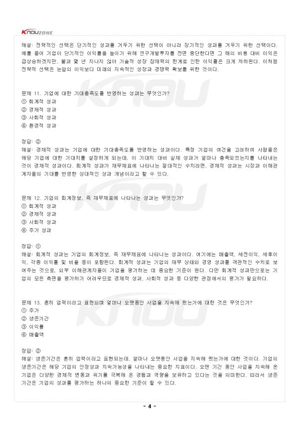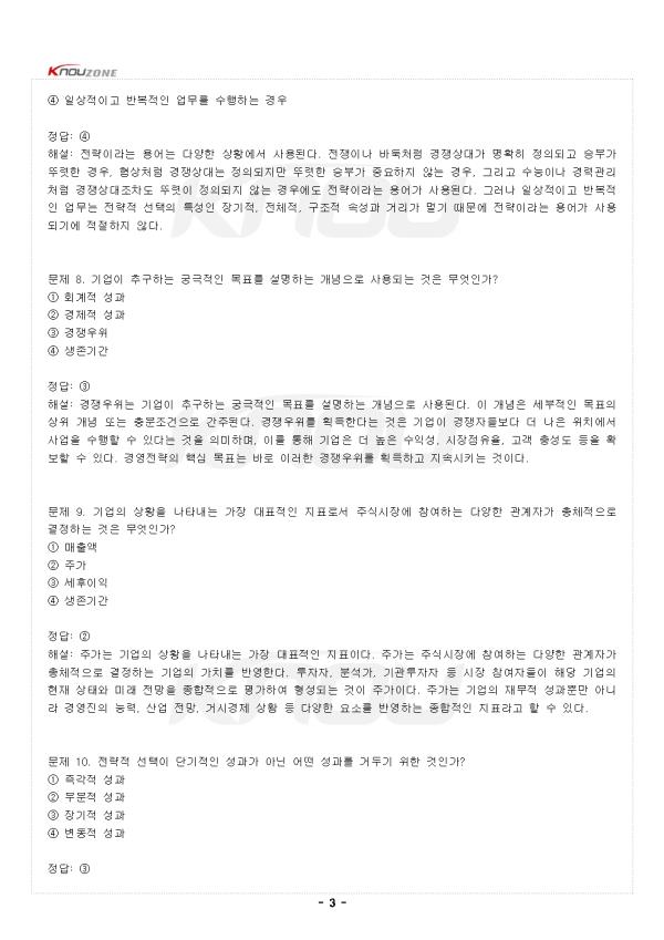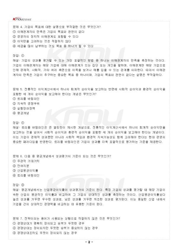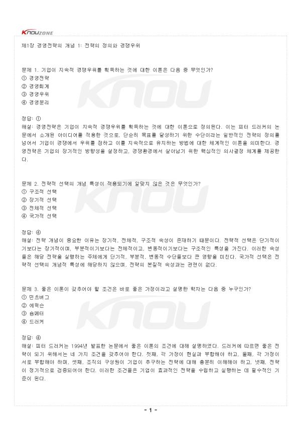 ¹®Á¦ 1. ±â¾÷ÀÌ Áö¼ÓÀû °æÀï¿ìÀ§¸¦ ȹµæÇÏ´Â °Í¿¡ ´ëÇÑ ÀÌ·ÐÀº ´ÙÀ½ Áß ¹«¾ùÀΰ¡? ¨ç °æ¿µÀü·« ¨è °æ¿µÈ¸°è ¨é °æ¿µ¿ìÀ§ ¨ê °æ¿µºÐ¸® Á¤´ä: ¨ç ÇØ¼³: °æ¿µÀü·«Àº ±â¾÷ÀÌ Áö¼ÓÀû °æÀï¿ìÀ§¸¦ ȹµæÇÏ´Â °Í¿¡ ´ëÇÑ ÀÌ·ÐÀ¸·Î Á¤ÀǵȴÙ. ÀÌ´Â ÇÇÅÍ µå·¯Ä¿ÀÇ ³í¹®¿¡¼ ¼Ò°³µÈ ¾ÆÀ̵ð¾î¸¦ Àû¿ëÇÑ °ÍÀ¸·Î, ´Ü¼øÈ÷ ¸ñÇ¥¸¦ ´Þ¼ºÇϱâ À§ÇÑ ¼ö´ÜÀ̶ó´Â ÀϹÝÀûÀÎ Àü·«ÀÇ Á¤ÀǸ¦ ³Ñ¾î¼ ±â¾÷ÀÌ °æÀï¿¡¼ ¿ìÀ§¸¦ Á¡Çϰí À̸¦ Áö¼ÓÀûÀ¸·Î À¯ÁöÇÏ´Â ¹æ¹ý¿¡ ´ëÇÑ Ã¼°èÀûÀÎ ÀÌ·ÐÀ» ÀǹÌÇÑ´Ù. °æ¿µÀü·«Àº ±â¾÷ÀÇ Àå±âÀûÀÎ ¹æÇ⼺À» ¼³Á¤Çϰí, °æÀïȯ°æ¿¡¼ »ì¾Æ³²±â À§ÇÑ ÇÙ½ÉÀûÀÎ ÀÇ»ç°áÁ¤ ü°è¸¦ Á¦°øÇÑ´Ù. ¹®Á¦ 2. Àü·«Àû ¼±ÅÃÀÇ °³³ä Ư¼ºÀÌ Àû¿ëµÇ±â¿¡ ¾Ë¸ÂÁö ¾ÊÀº °ÍÀº ¹«¾ùÀΰ¡? ¨ç ±¸Á¶Àû ¼±Åà ¨è Àå±âÀû ¼±Åà ¨é ÀüüÀû ¼±Åà ¨ê ±¹°¡Àû ¼±Åà Á¤´ä: ¨ê ÇØ¼³: Àü·« °³³äÀÌ Áß¿äÇÑ ÀÌÀ¯´Â Àå±âÀû, ÀüüÀû, ±¸Á¶Àû ¼Ó¼ºÀÌ Á¸ÀçÇϱ⠶§¹®ÀÌ´Ù. Àü·«Àû ¼±ÅÃÀº ´Ü±âÀûÀ̱⺸´Ù´Â Àå±âÀûÀ̸ç, ºÎºÐÀûÀ̱⺸´Ù´Â ÀüüÀûÀ̰í, º¯µ¿ÀûÀ̱⺸´Ù´Â ±¸Á¶ÀûÀΠƯ¼ºÀ» °¡Áø´Ù. ÀÌ·¯ÇÑ ¼Ó¼ºµéÀº ÇØ´ç Àü·«À» ½ÇÇàÇÏ´Â ÁÖü¿¡°Ô ´Ü±âÀû, ºÎºÐÀû, º¯µ¿Àû ¼ö´Üµéº¸´Ù Å« ¿µÇâÀ» ¹ÌÄ£´Ù. ±¹°¡Àû ¼±ÅÃÀº Àü·«Àû ¼±ÅÃÀÇ °³³äÀû Ư¼º¿¡ ÇØ´çÇÏÁö ¾ÊÀ¸¸ç, Àü·«ÀÇ º»ÁúÀû ¼Ó¼º°ú´Â °ü·ÃÀÌ ¾ø´Ù. -Áß·«- |